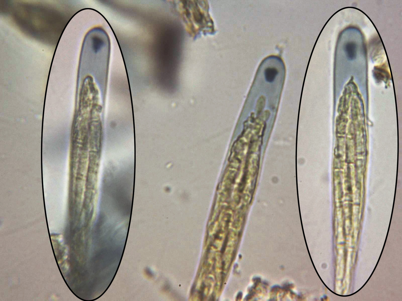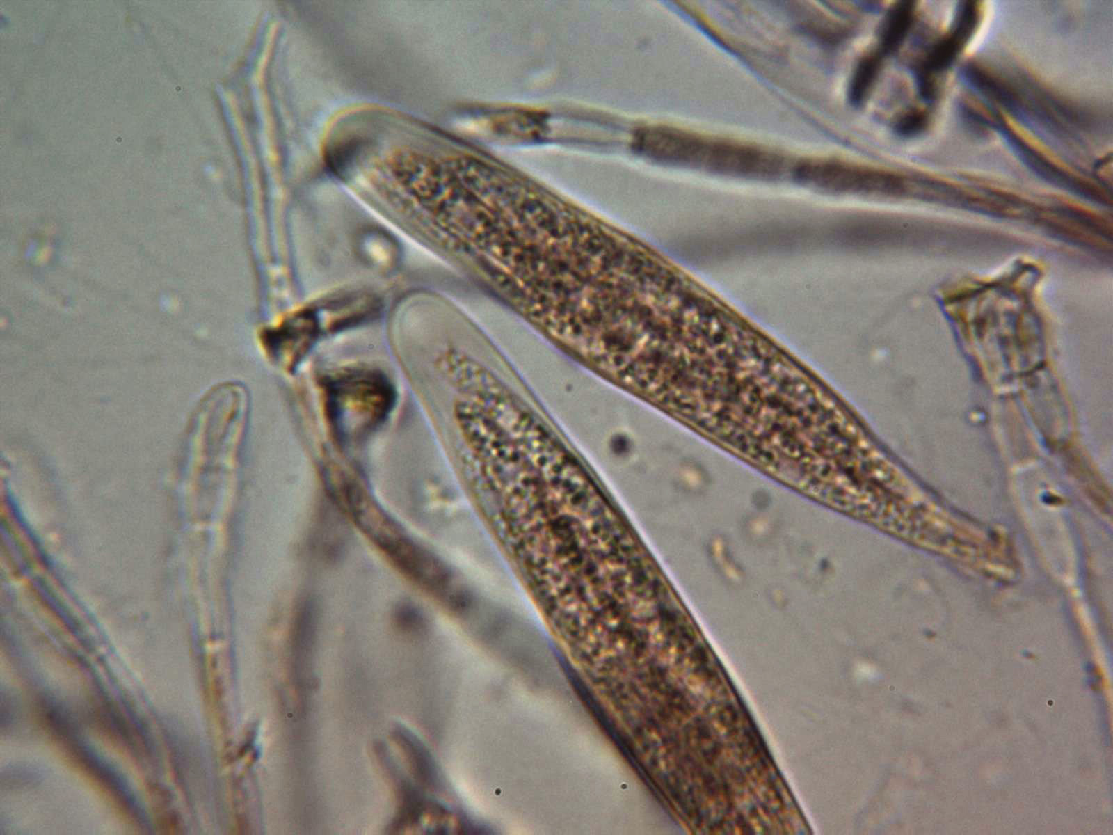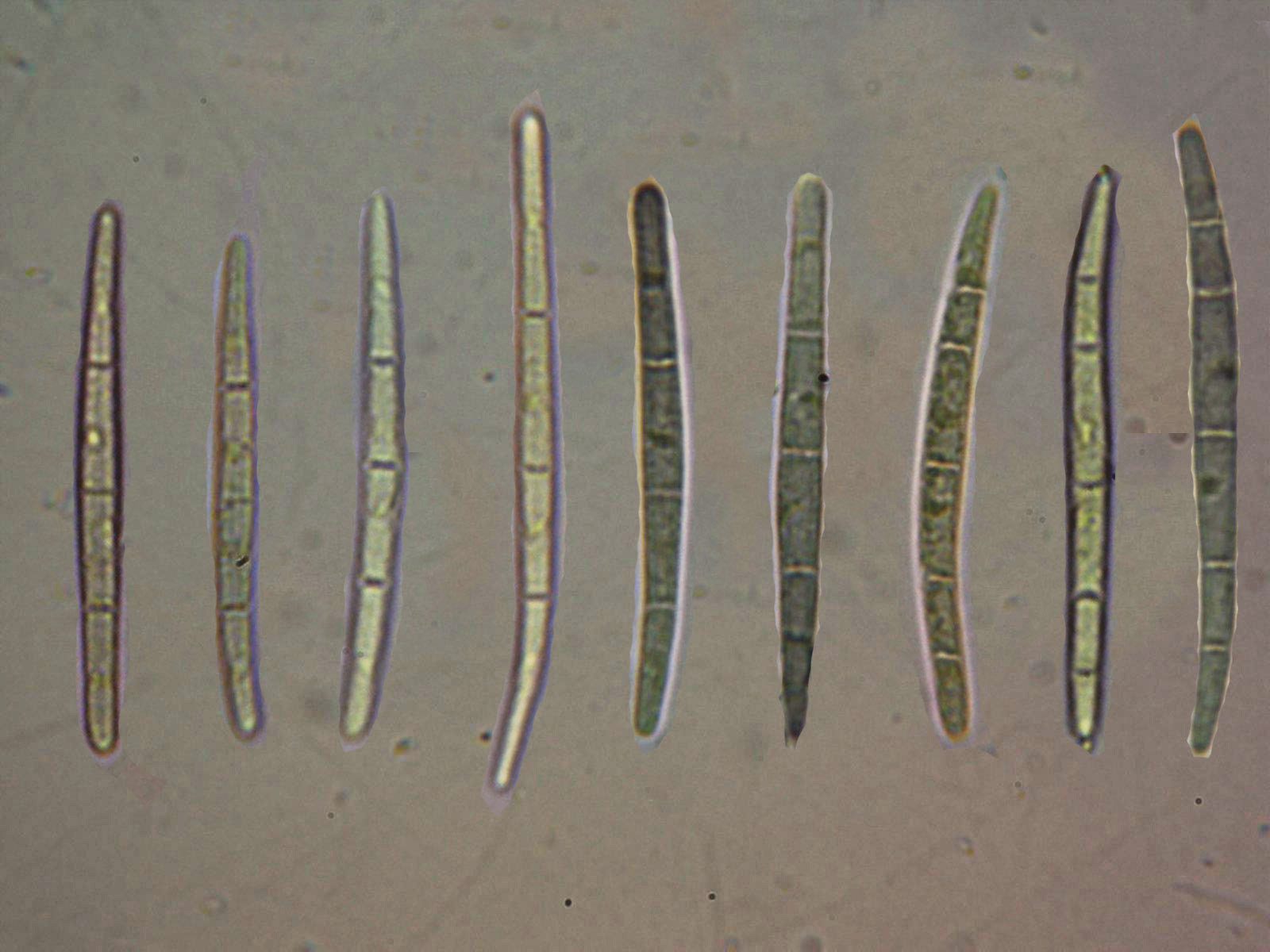 Esporas en reactivo de Melzer donde se aprecia bien la característica de los septos, de entre 3 y 5 septos tal y como se indica en la bibliografía.