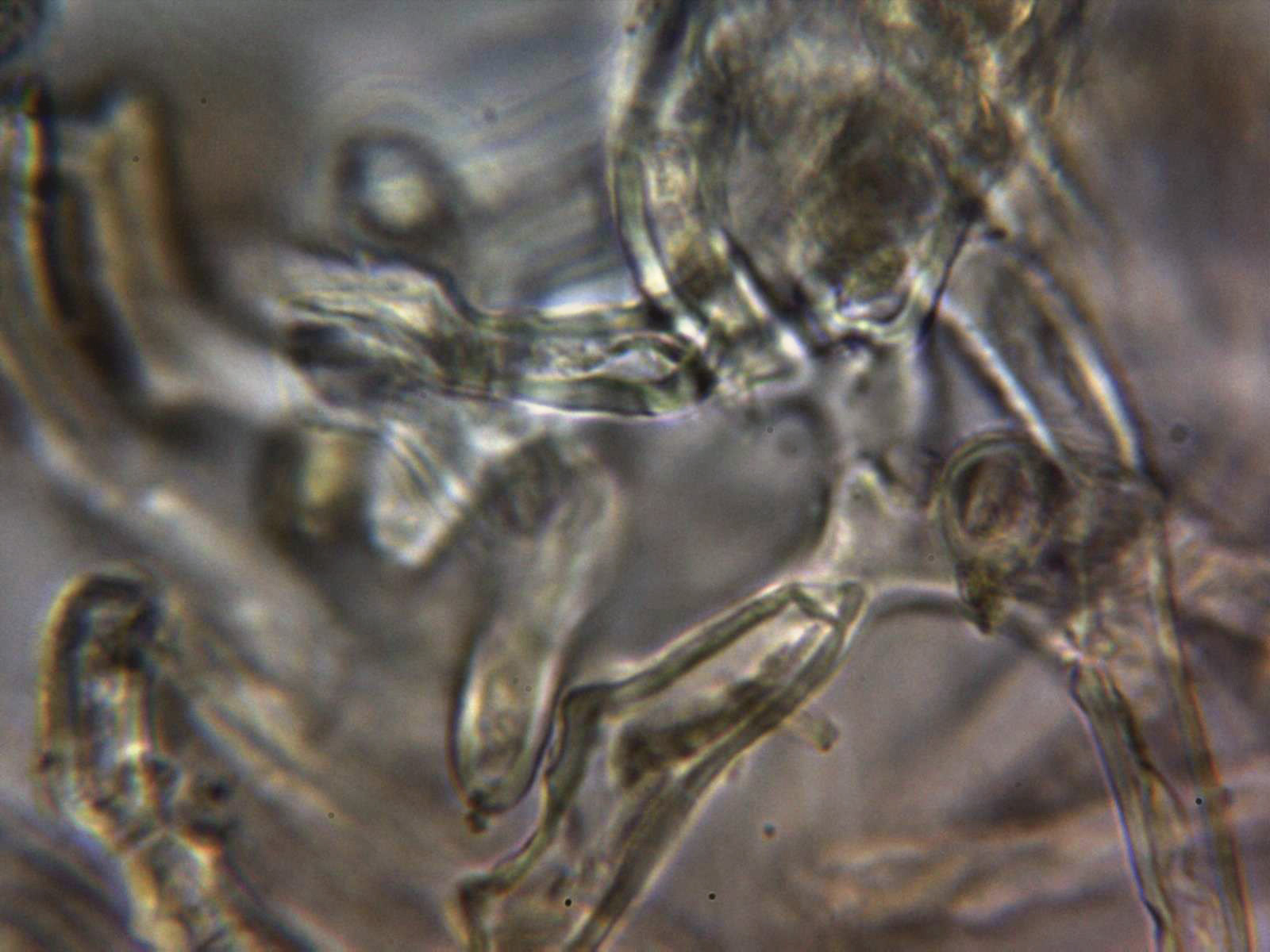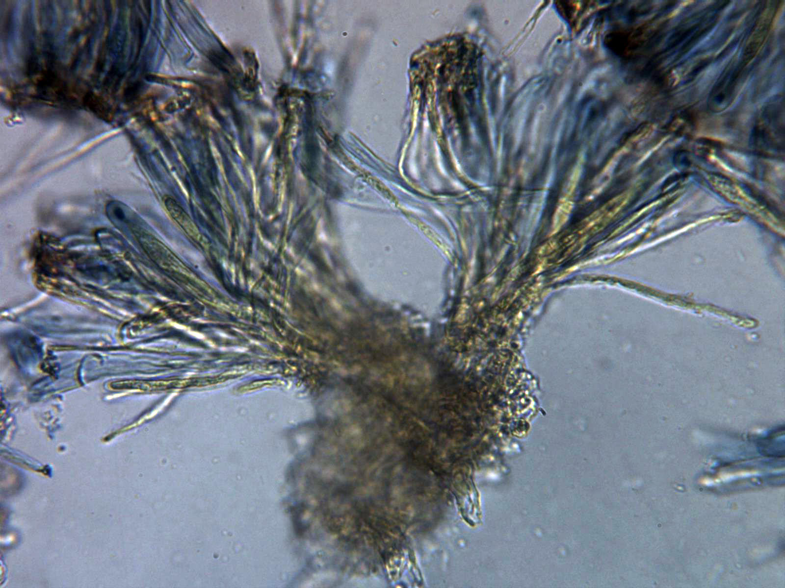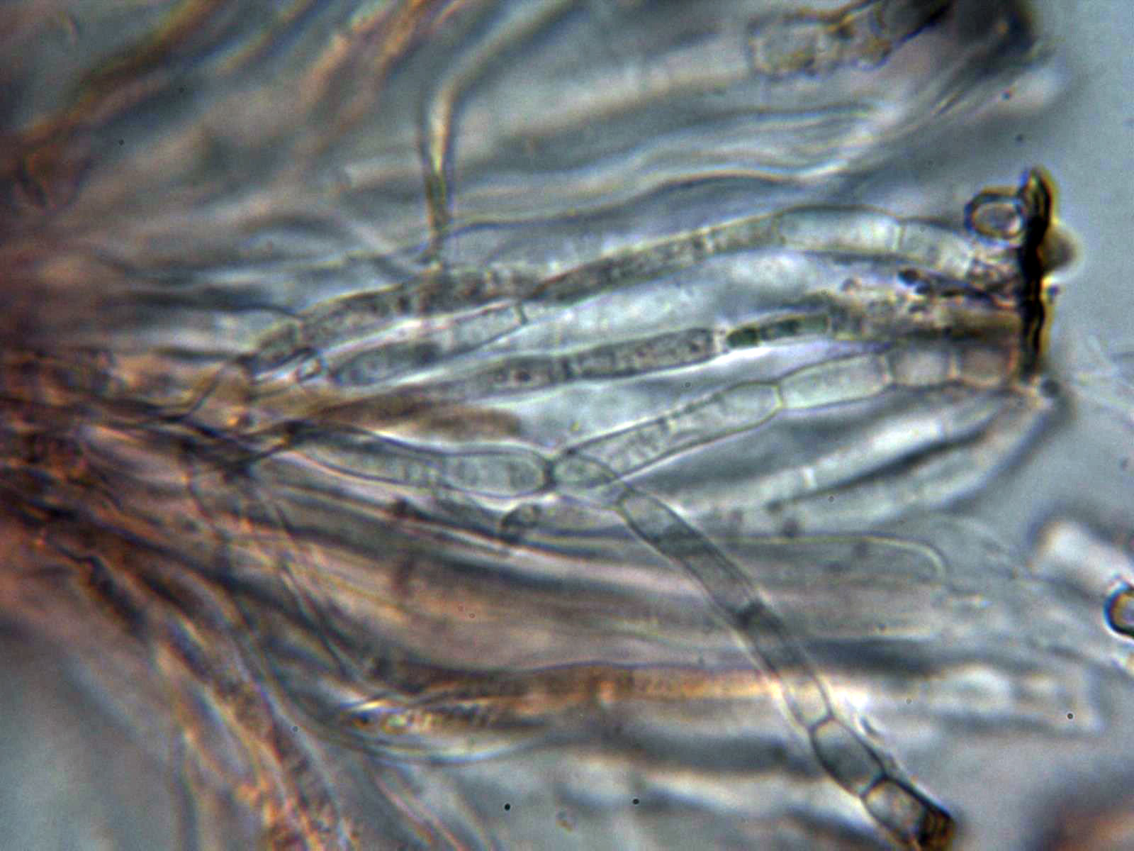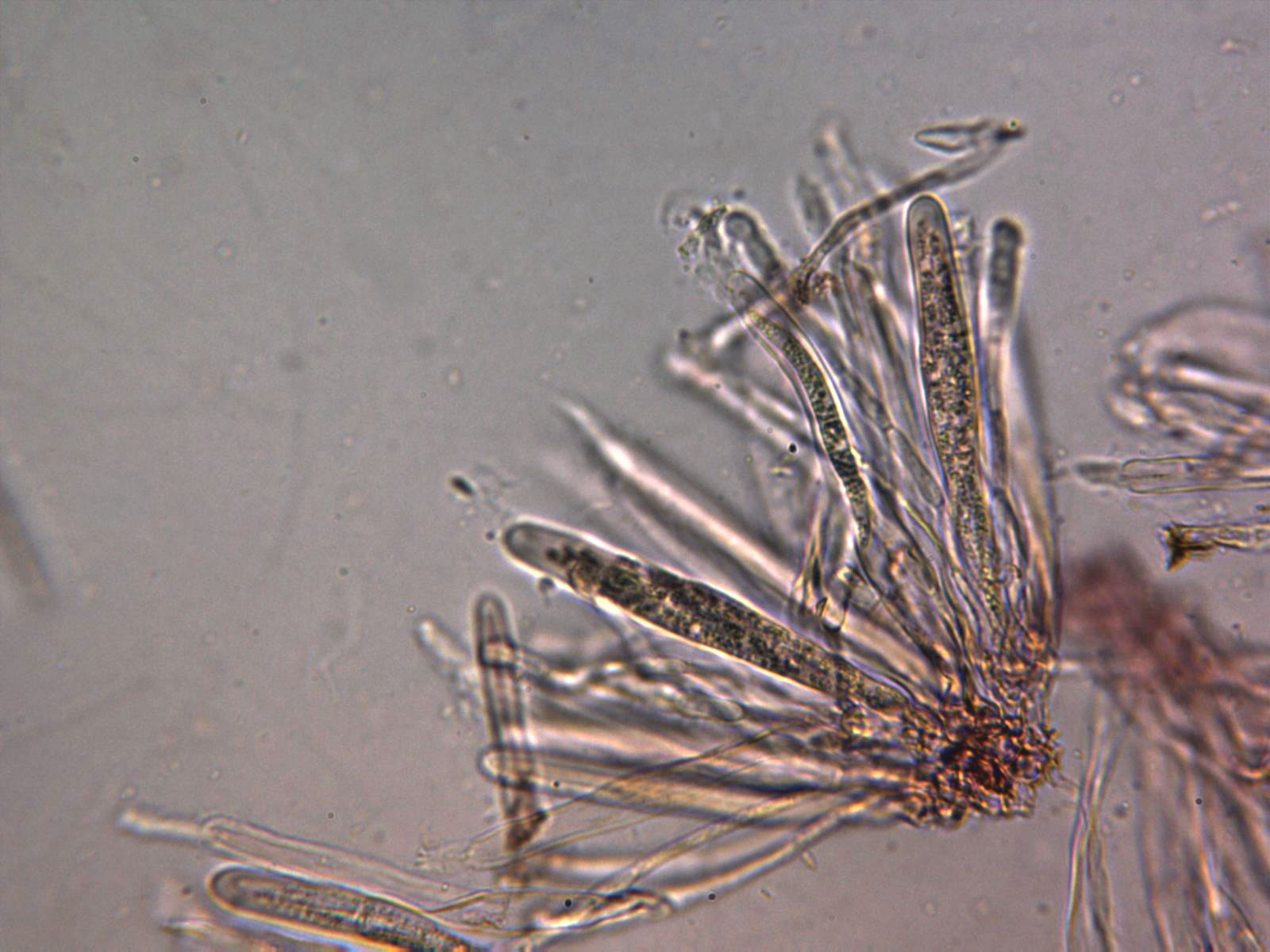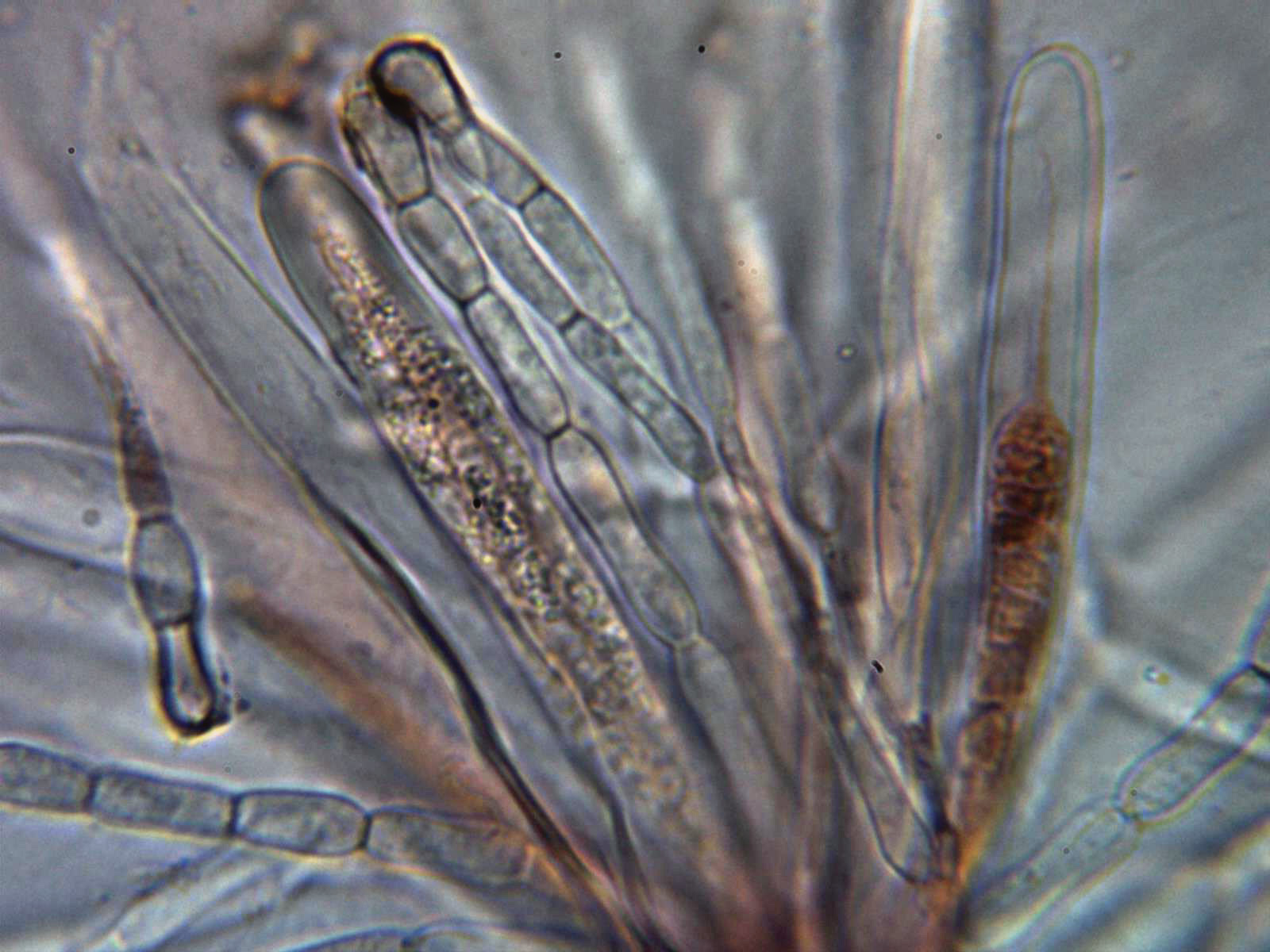 Paráfisis filiformes, sobresaliendo incluso un poco por encima de las ascas, multiseptadas, con estrechamientos en los septos y terminando con un ligero ensanchamiento de forma redondeada.