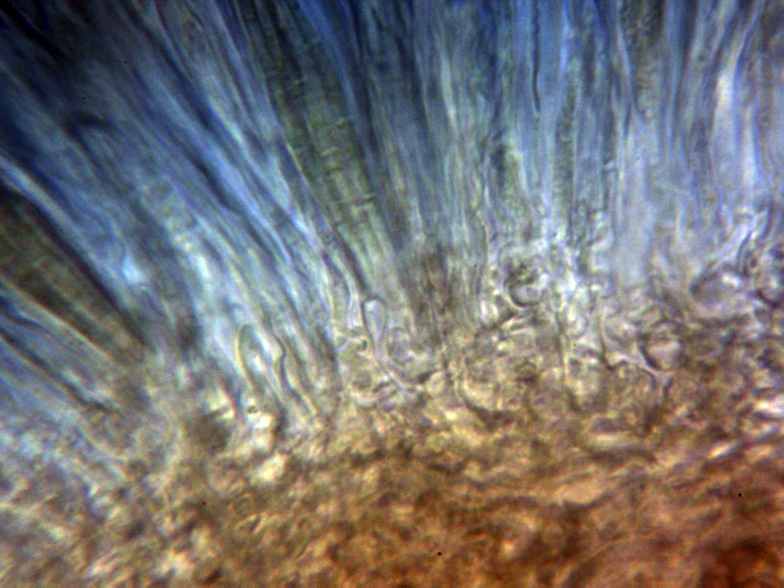 Himenio a 40 aumentos en reactivo de Melzer, con ascas fuertemente amiloides, y paráfisis, esporas y resto del contexto, inamiloides.
