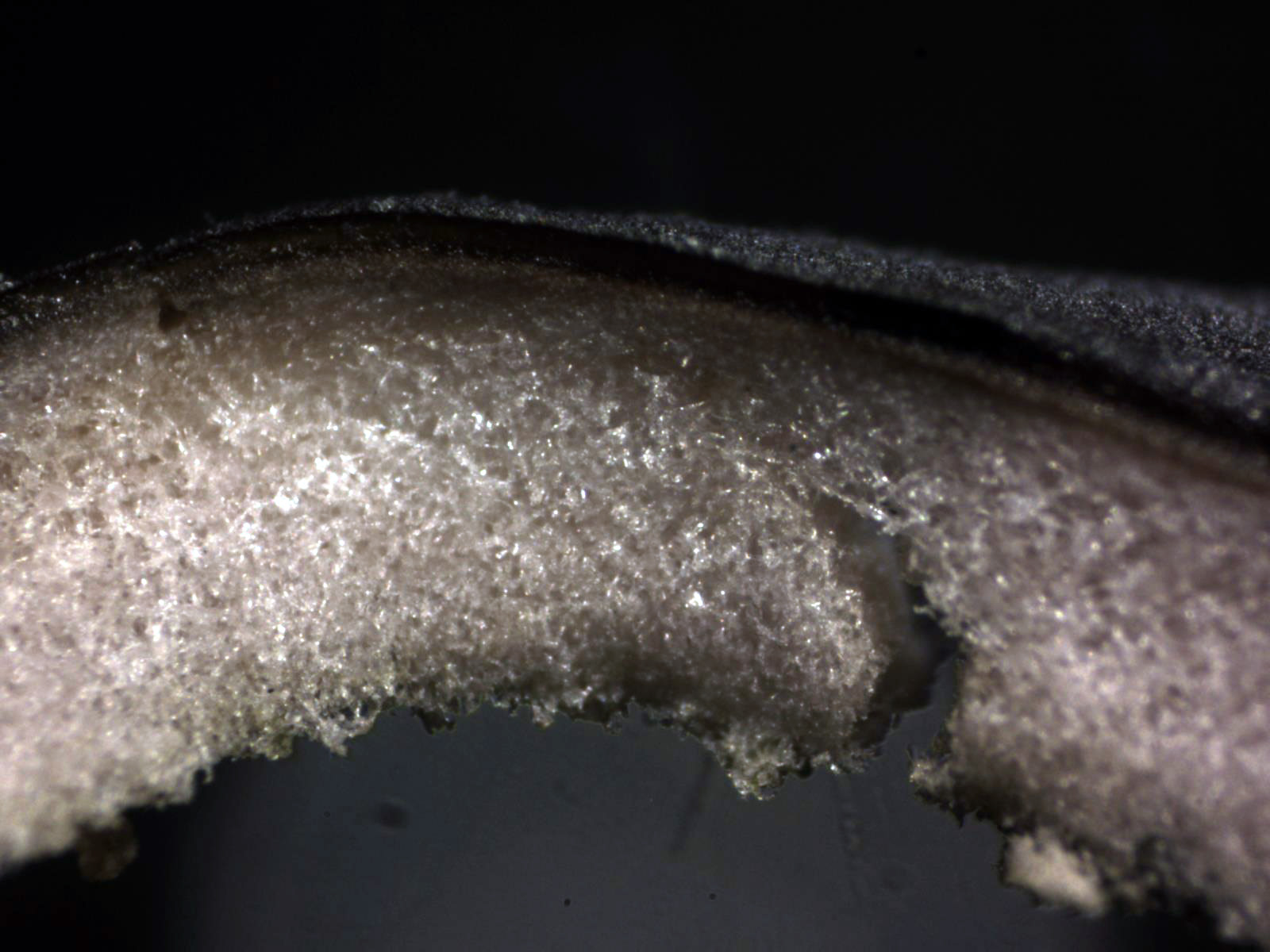 Sección a 40 aumentos, en la parte superior la parte fértil con las ascas, y por la parte de debajo de estas un contexto de hifas homogéneo hasta el borde del mismo, sin una cutícula diferenciada.