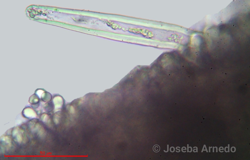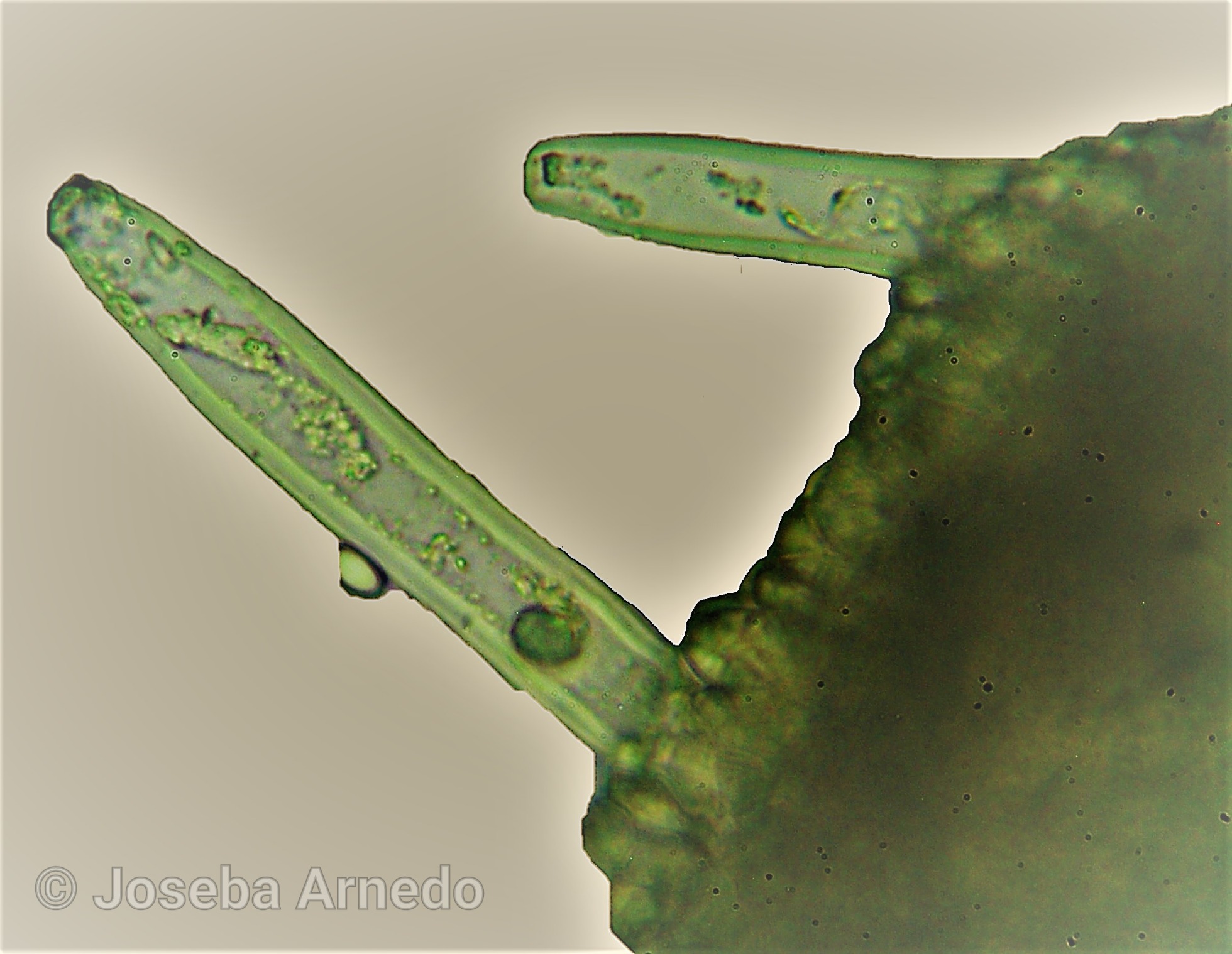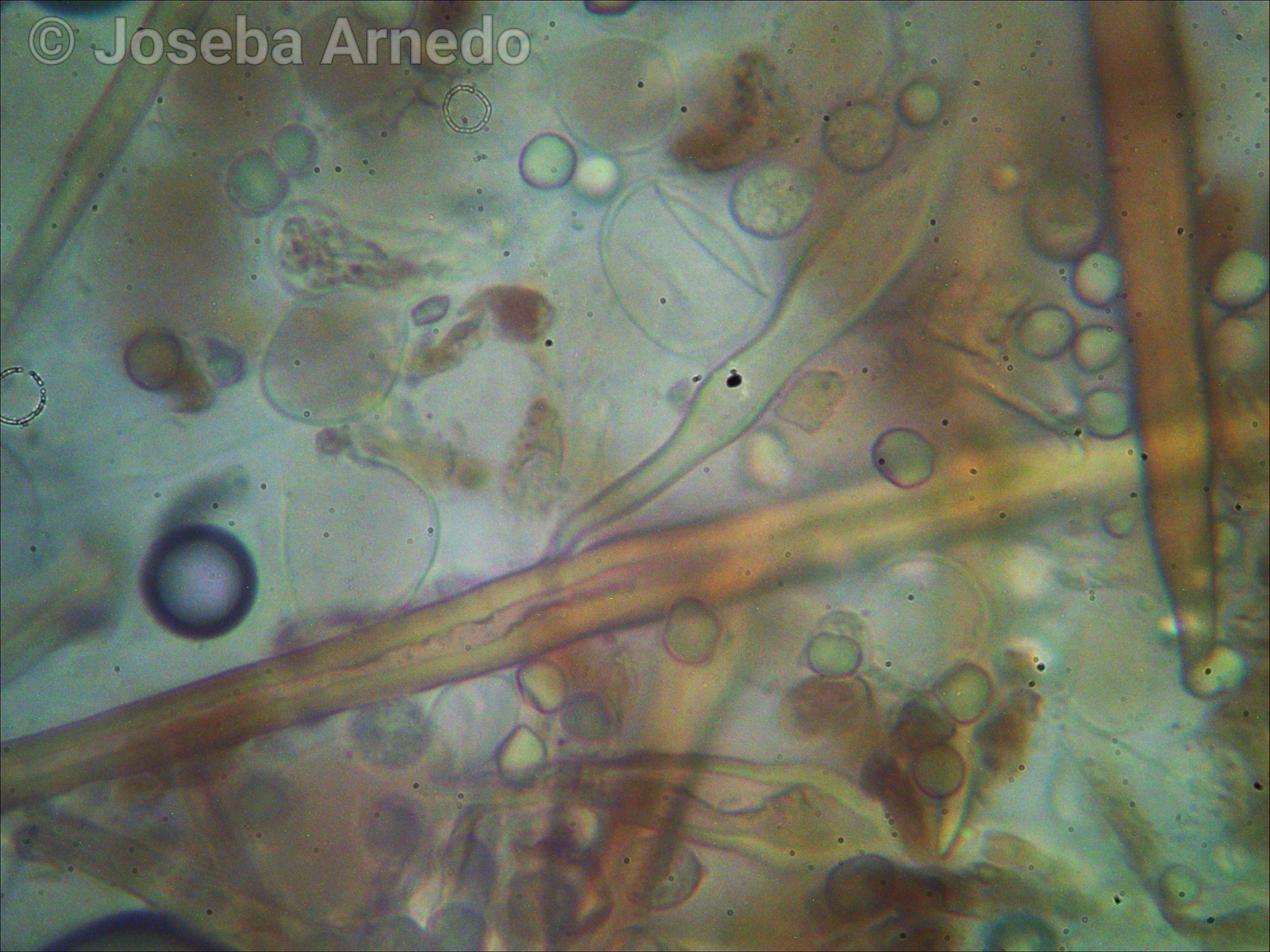 Pileipellis formada por pelos de paredes gruesas y elementos piriformes.