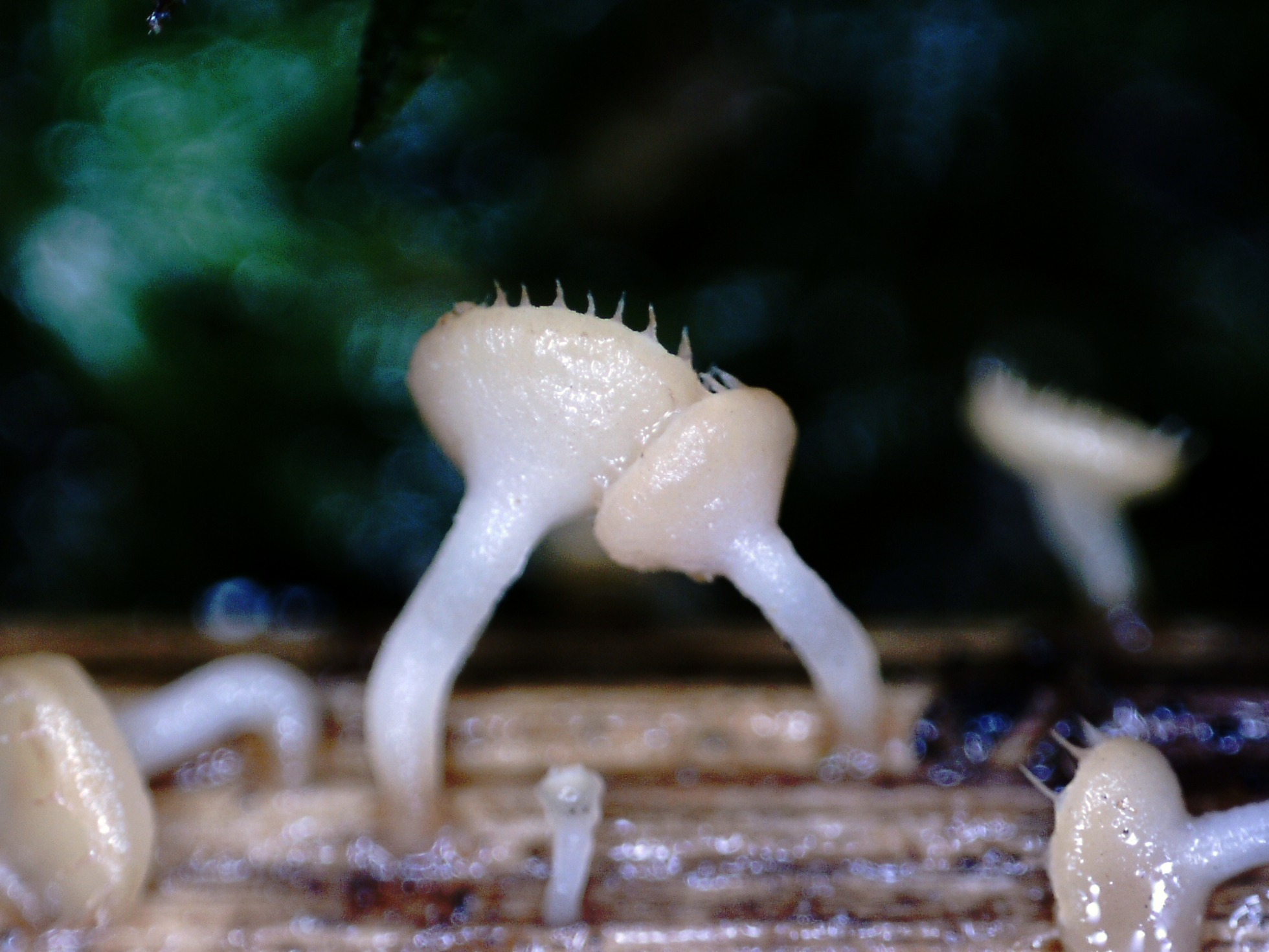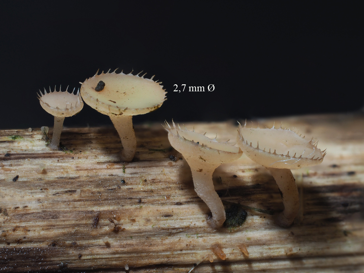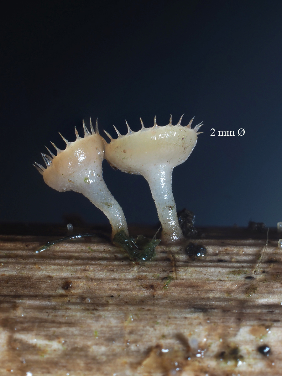 Apotecios cupuliformes de 1,1- 3,7 mm de diámetro, de color encarnado de joven y posteriormente beige, margen coronado de pelos de apariencia espinosa,