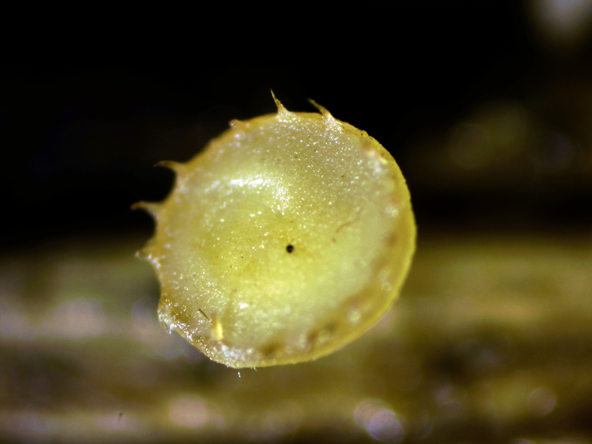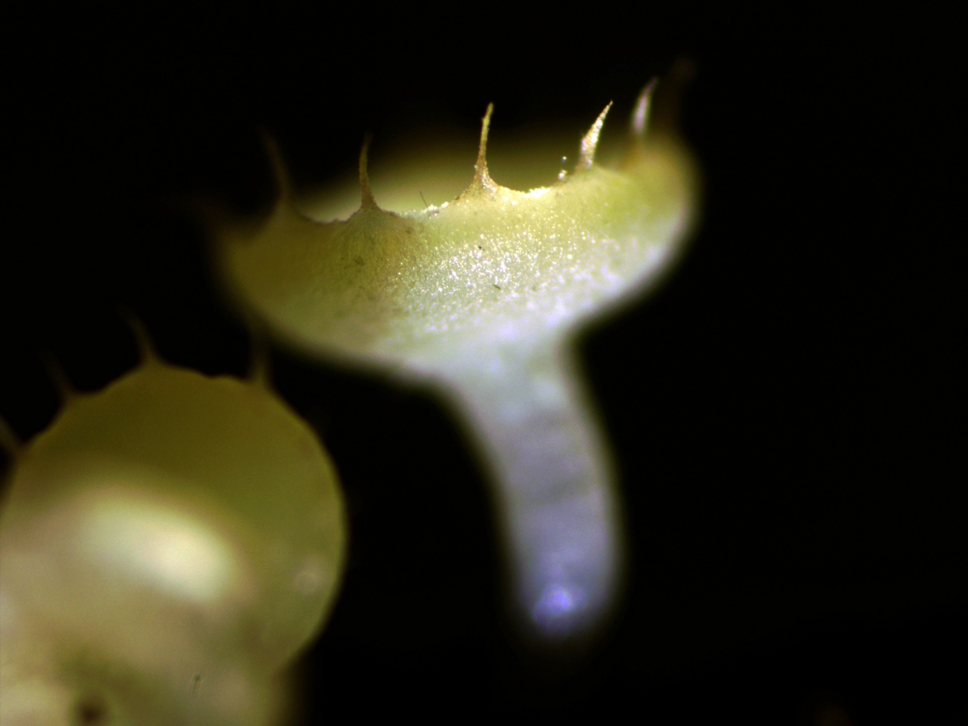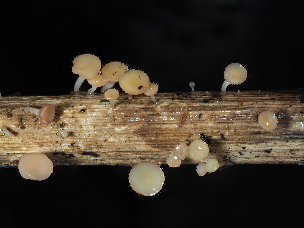 Apotecios cupuliformes de 1,1- 3,7 mm de diámetro, de color encarnado de joven y posteriormente beige, margen coronado de pelos de apariencia espinosa,