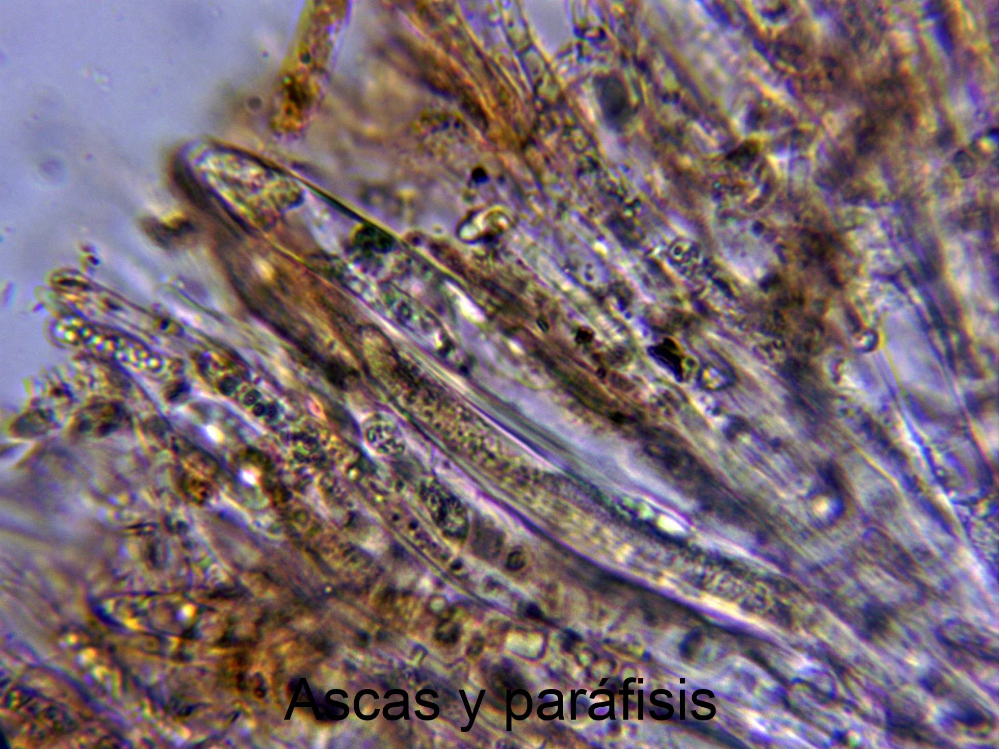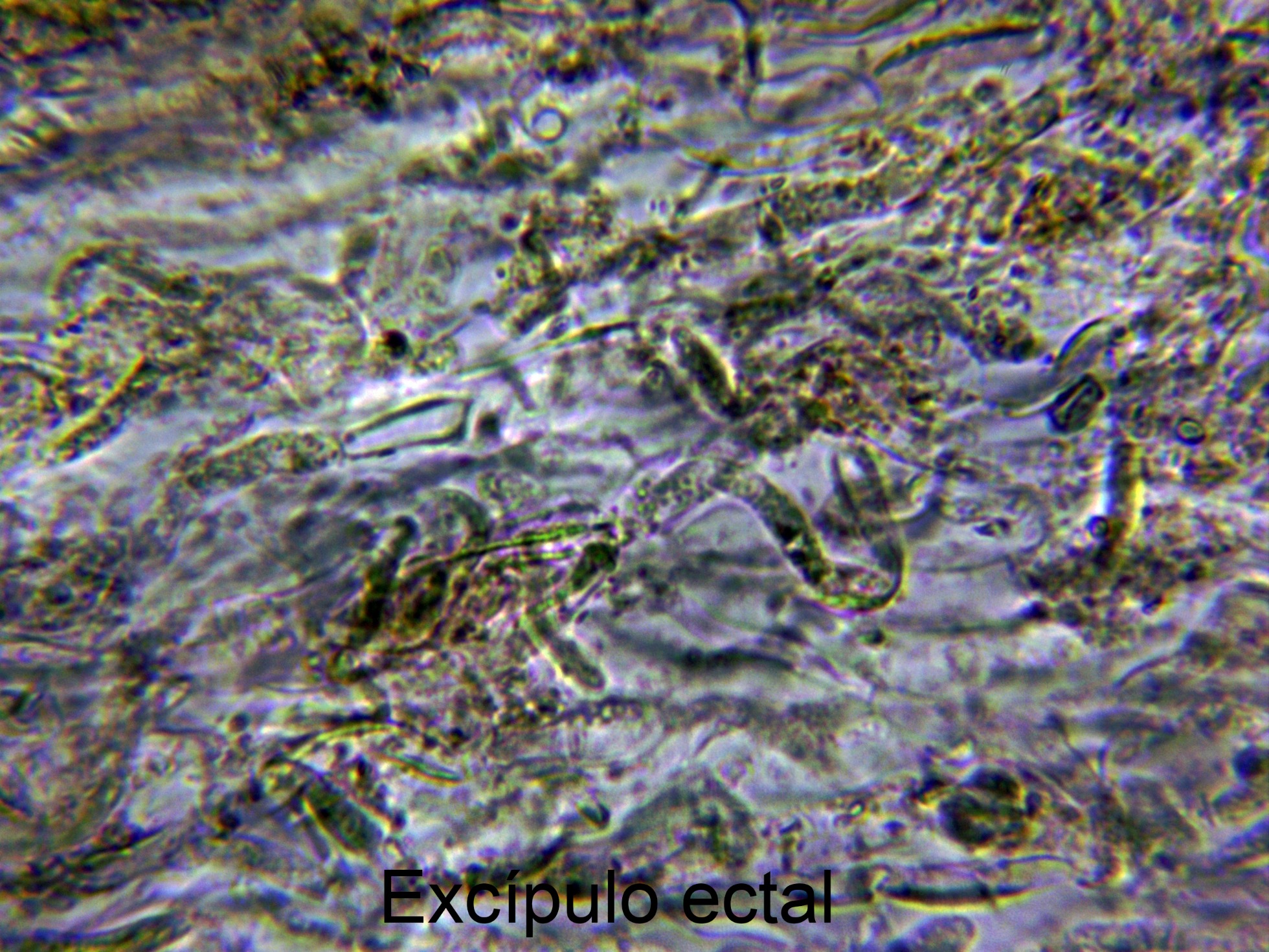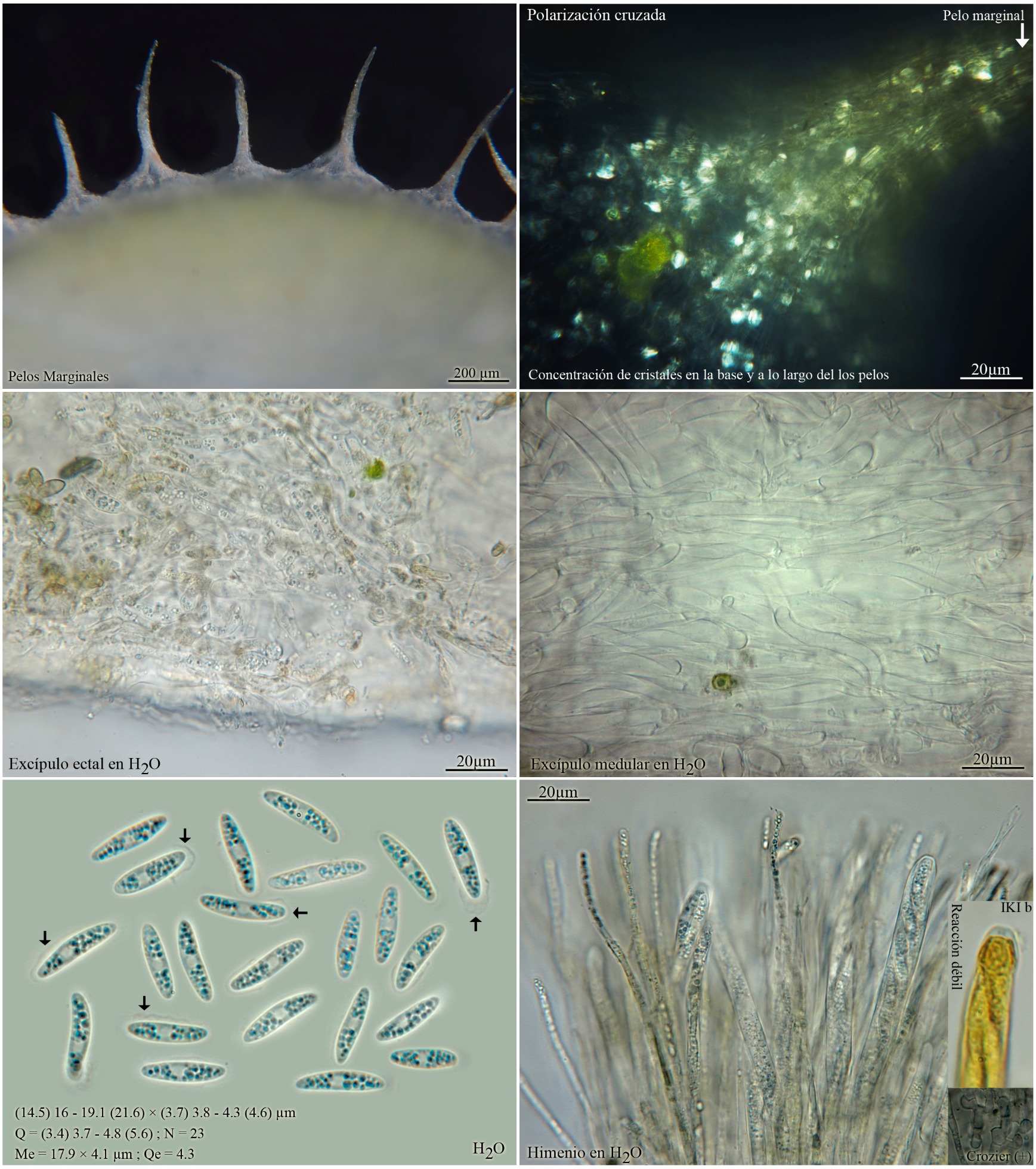 Esporas fusiformes, lisas, hialinas, multigutuladas hacia los polos y una discreta membrana mucosa. Paráfisis cilíndricas, con contenido refringente hacia el ápice. Ascas octospóricas, con aparato apical tipo Himenoscyphus y reacción débil al Yodo. Pelos del margen con abundantes cristales, apenas presentes en el himenio. Excípulo ectal constituido por elementos de contenido refringente no presente en el excípulo medular.