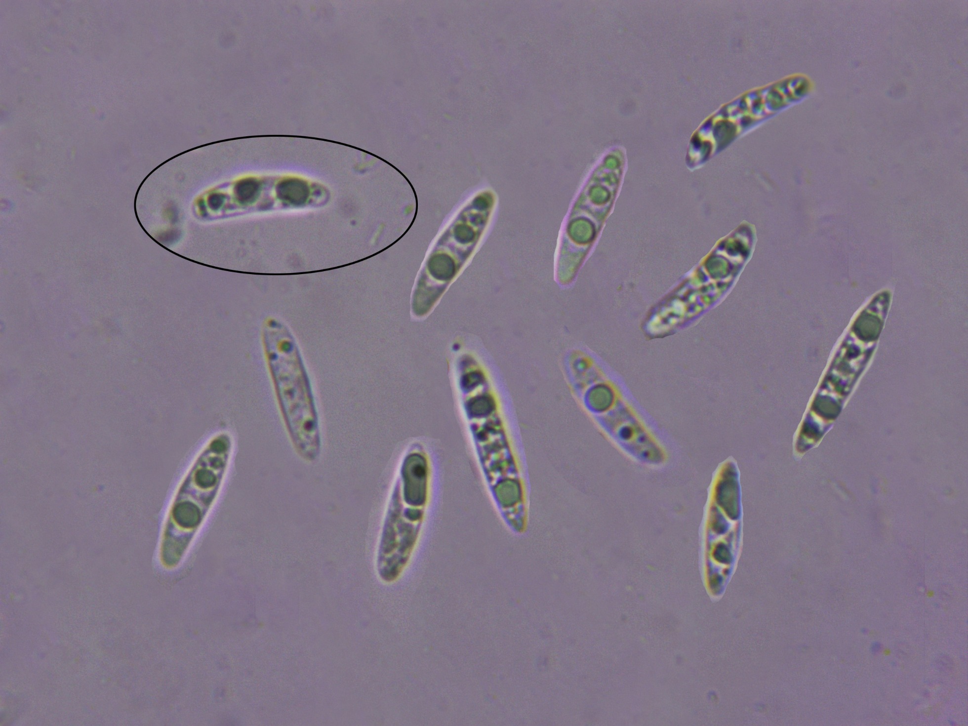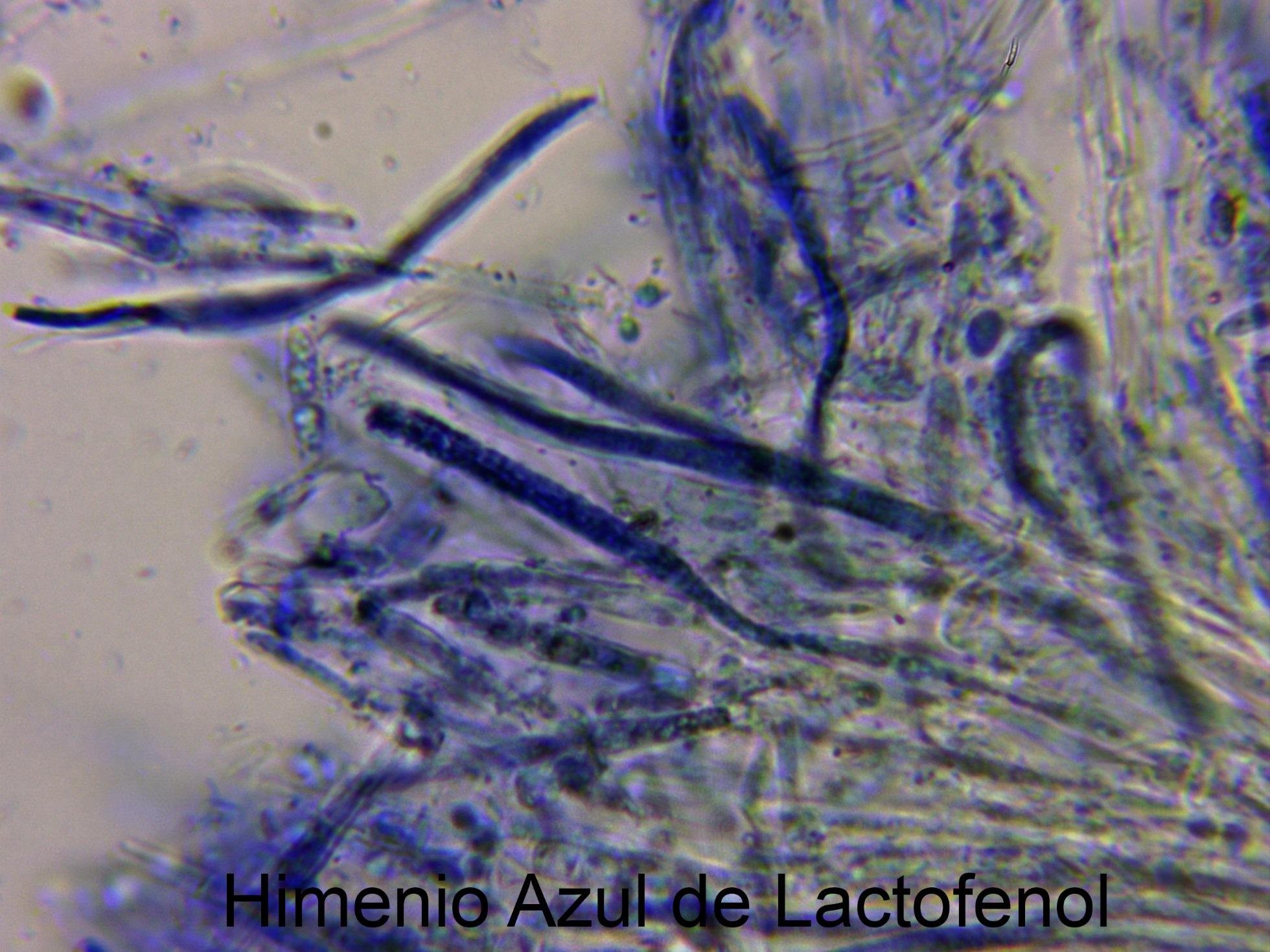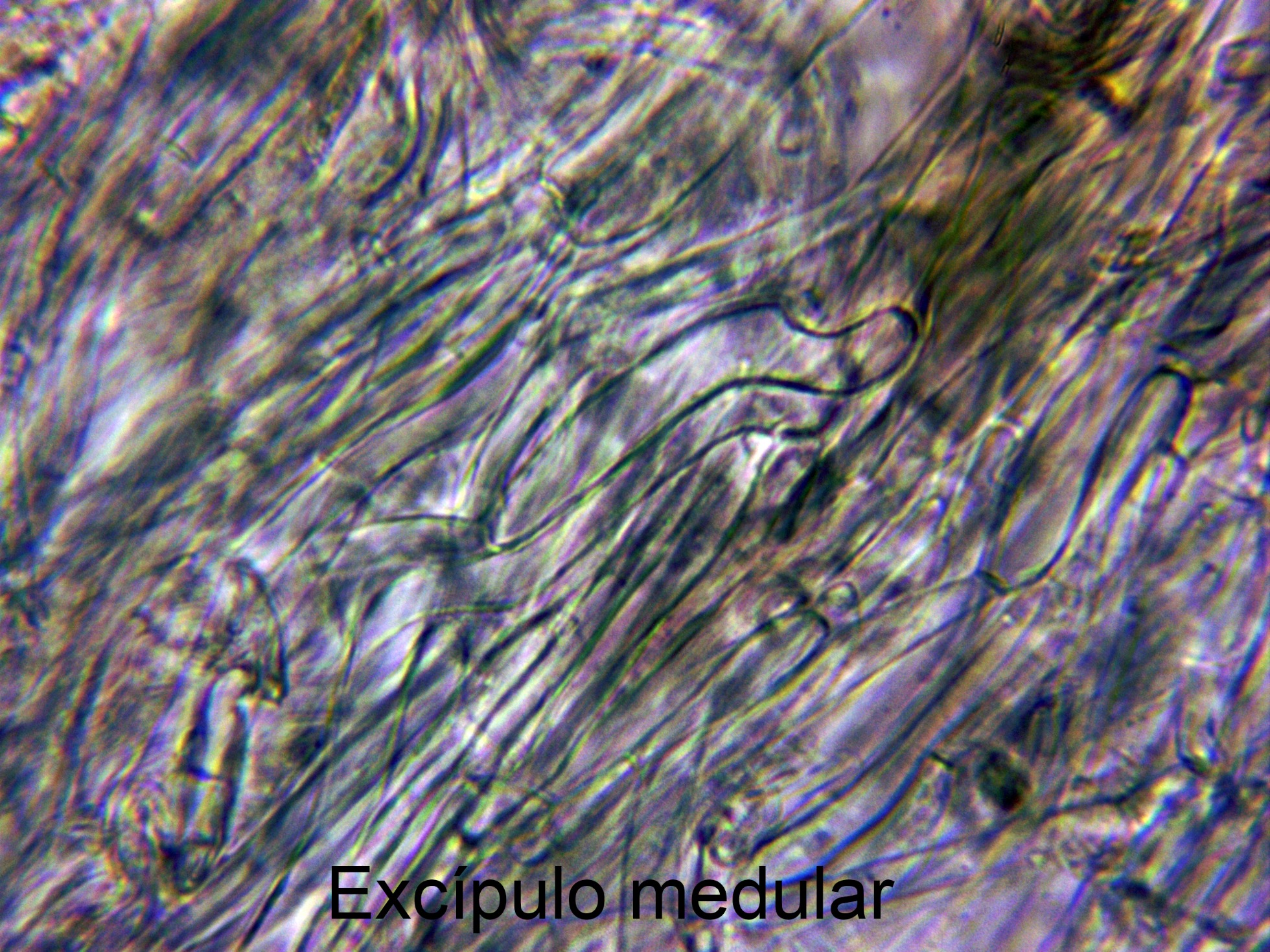 Esporas fusiformes, lisas, hialinas, multigutuladas hacia los polos y una discreta membrana mucosa. Paráfisis cilíndricas, con contenido refringente hacia el ápice. Ascas octospóricas, con aparato apical tipo Himenoscyphus y reacción débil al Yodo. Pelos del margen con abundantes cristales, apenas presentes en el himenio. Excípulo ectal constituido por elementos de contenido refringente no presente en el excípulo medular.