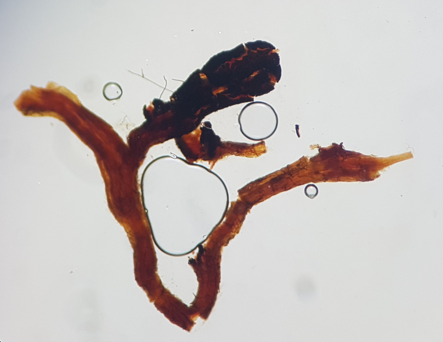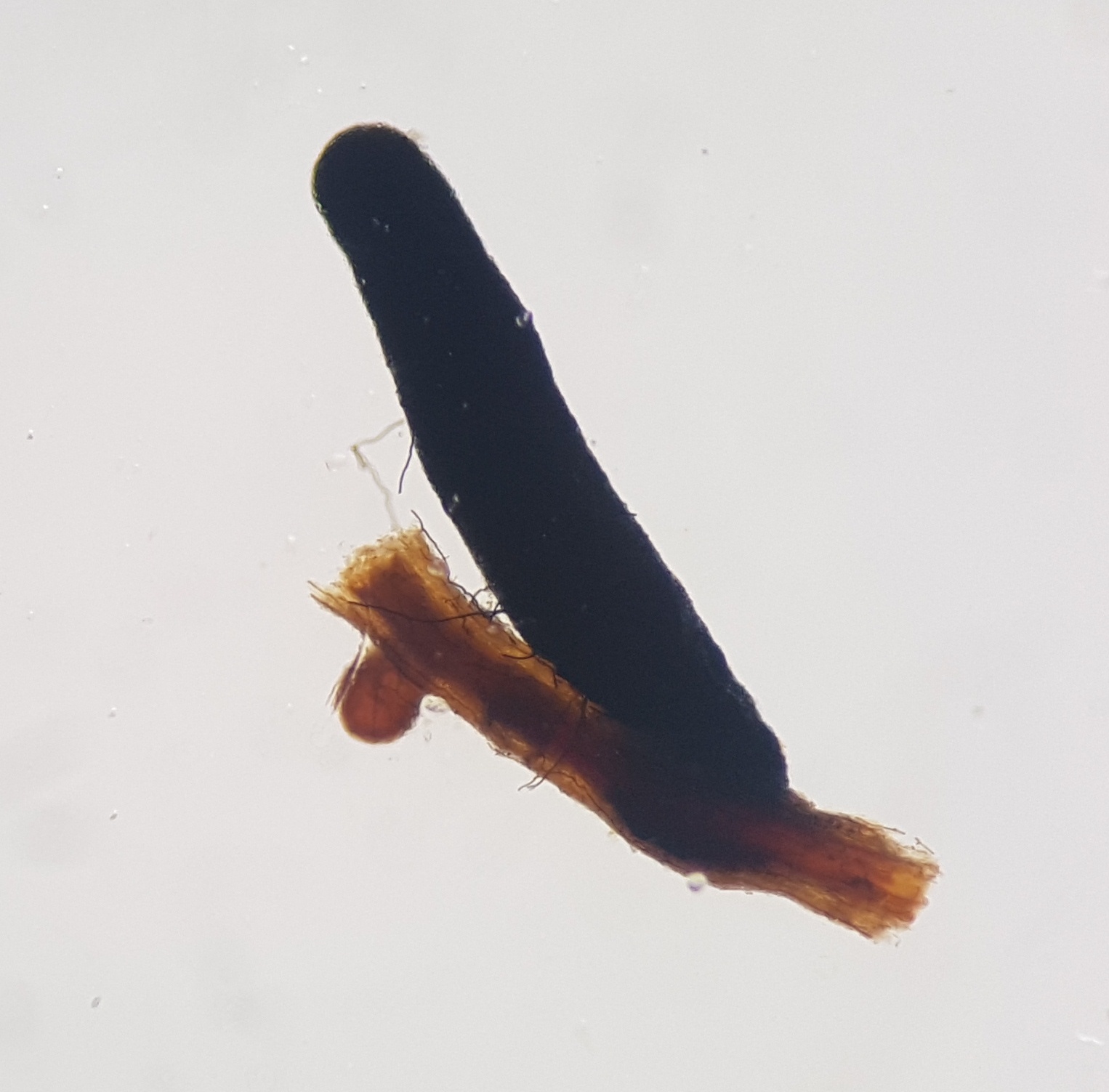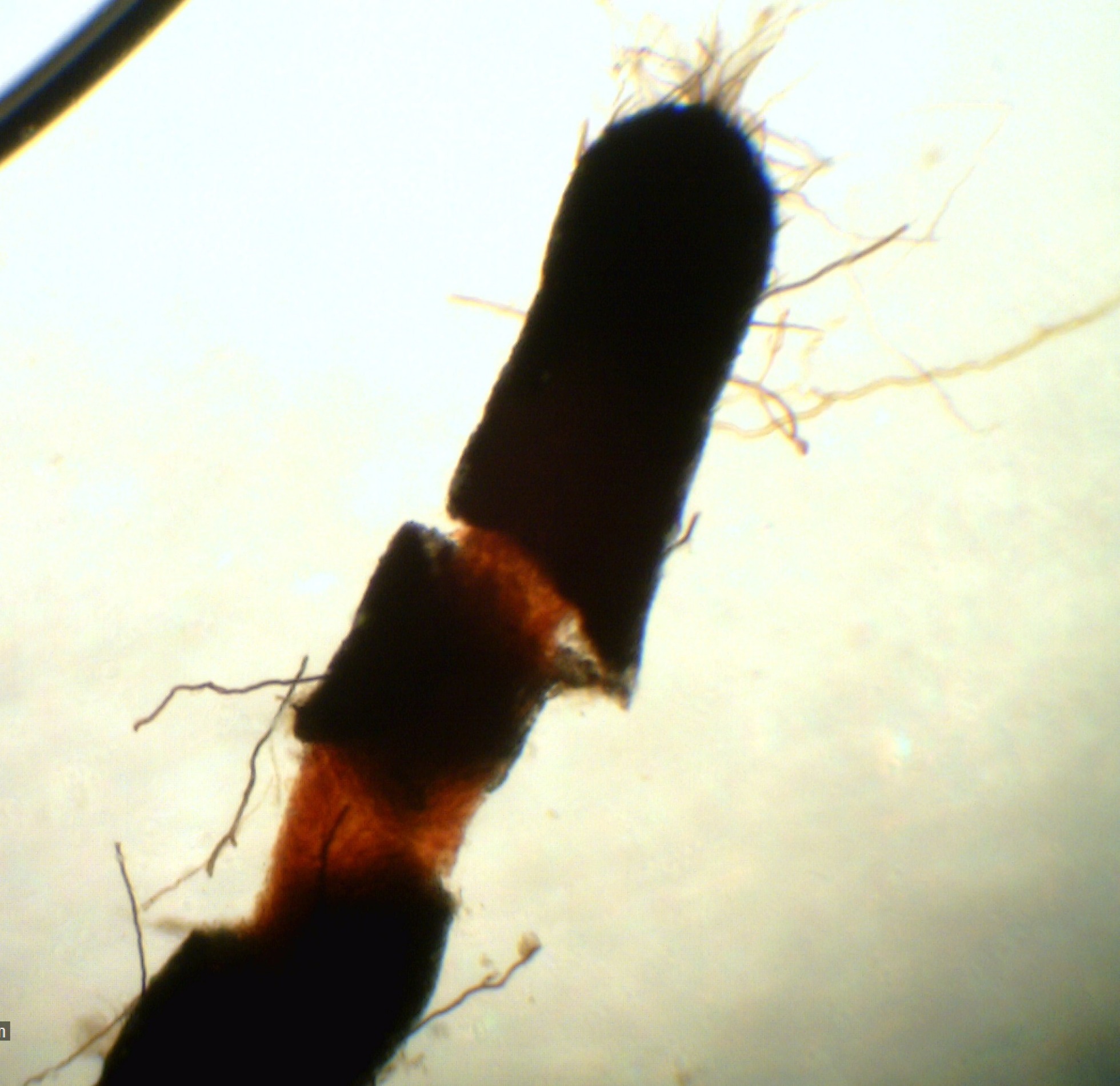 A continuación vemos el manto fúngico roto (zona oscura), apreciándose la raíz en su interior (zona más clara)