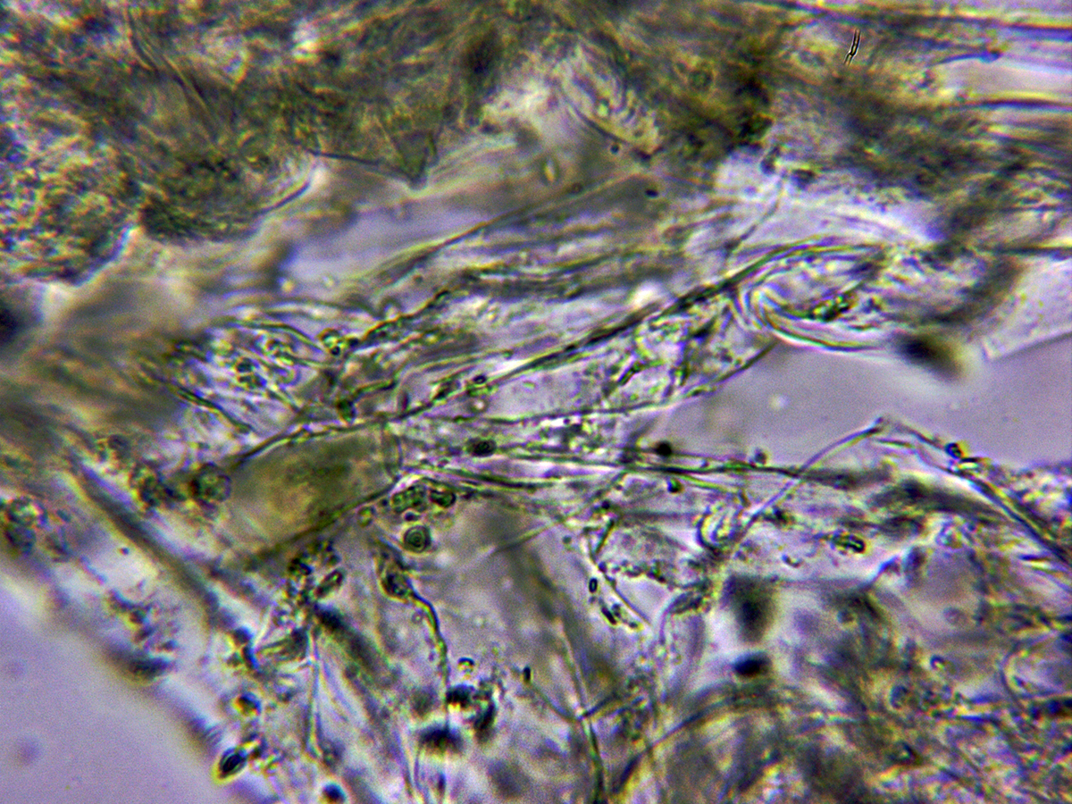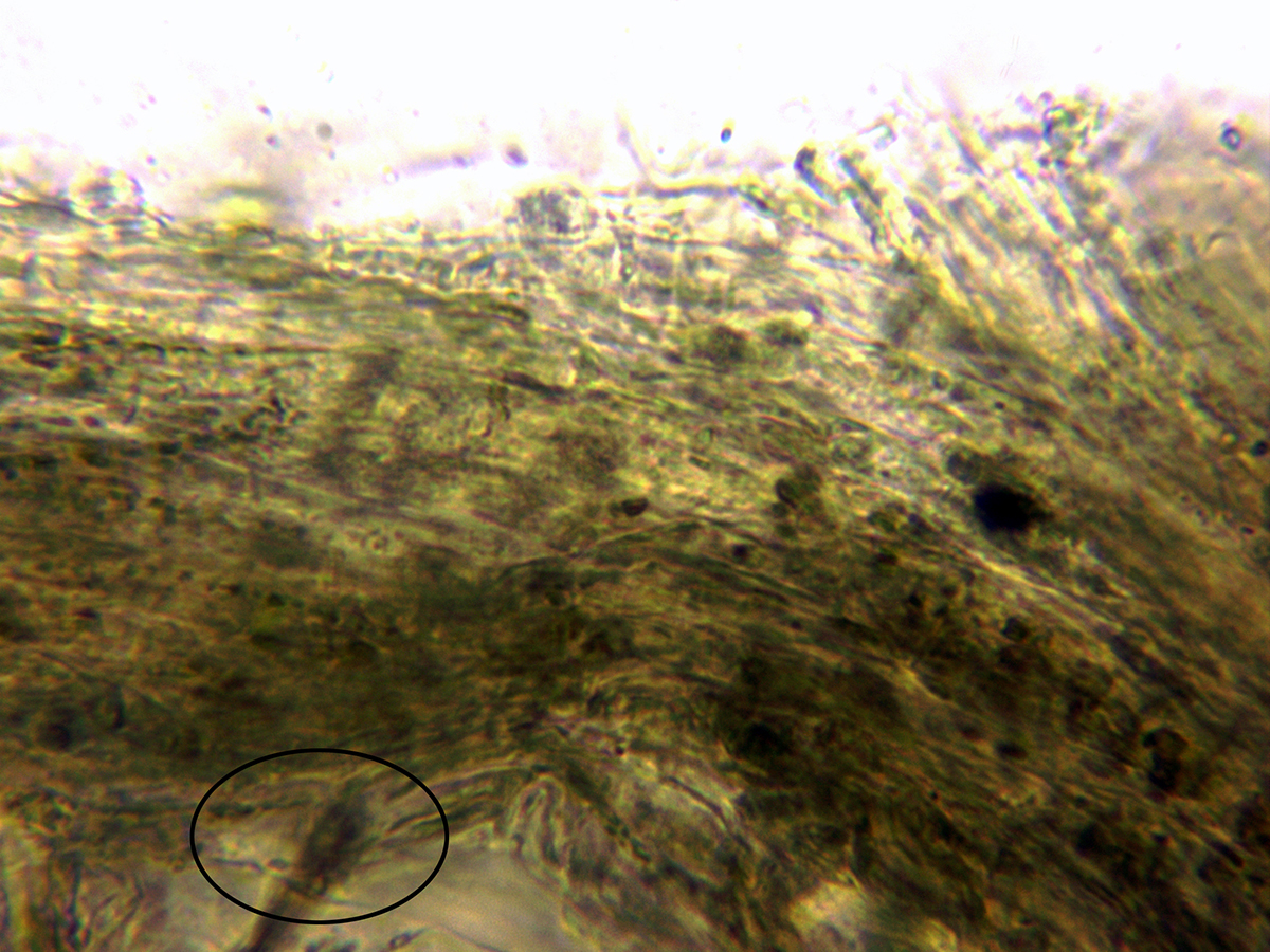 Suprapellis a 1000 aumentos, hifas pigmentadas con fíbulas de difícil observación (marcada con un círculo).