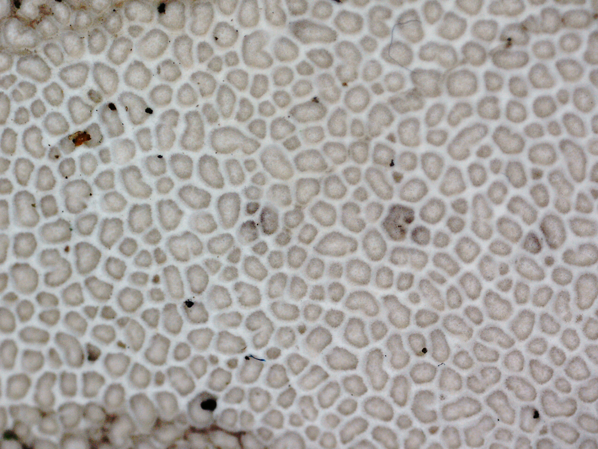 Himenio compuesto por poros blanquecinos que oscurecen con el roce, muy pequeños y con tubos muy cortos.
