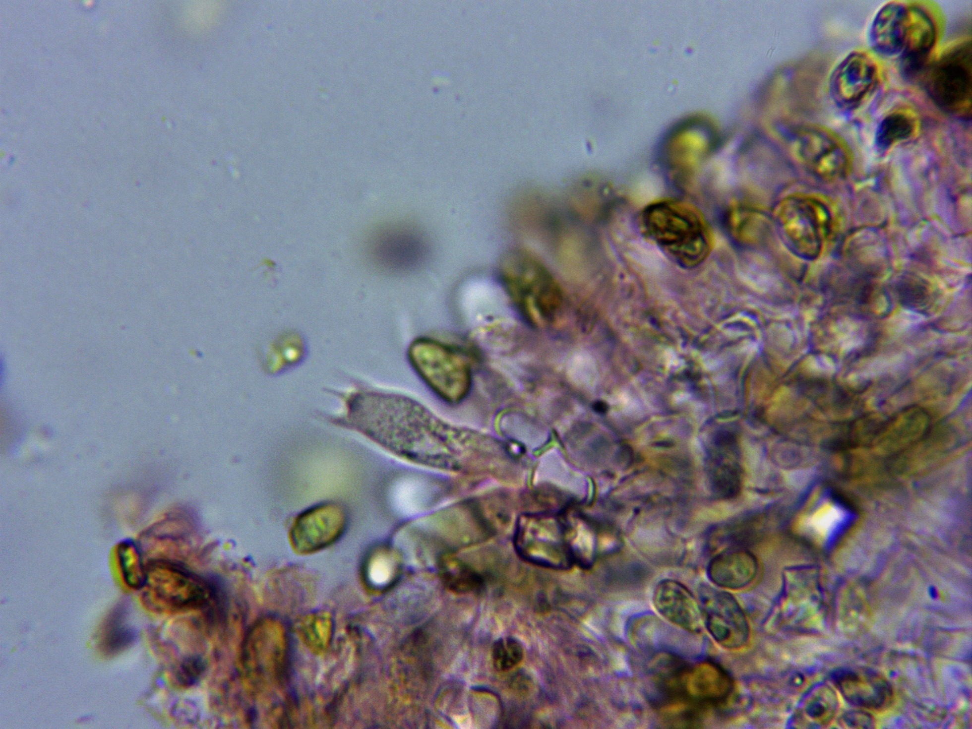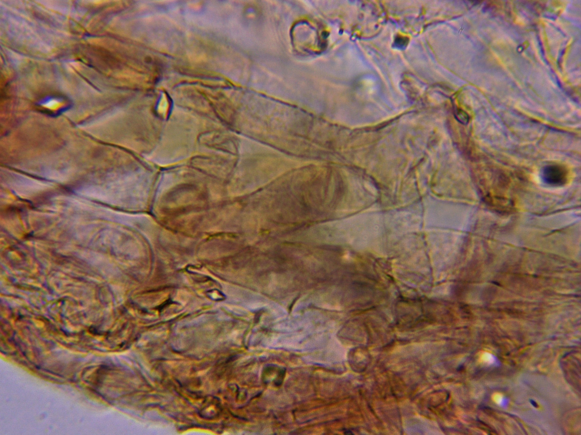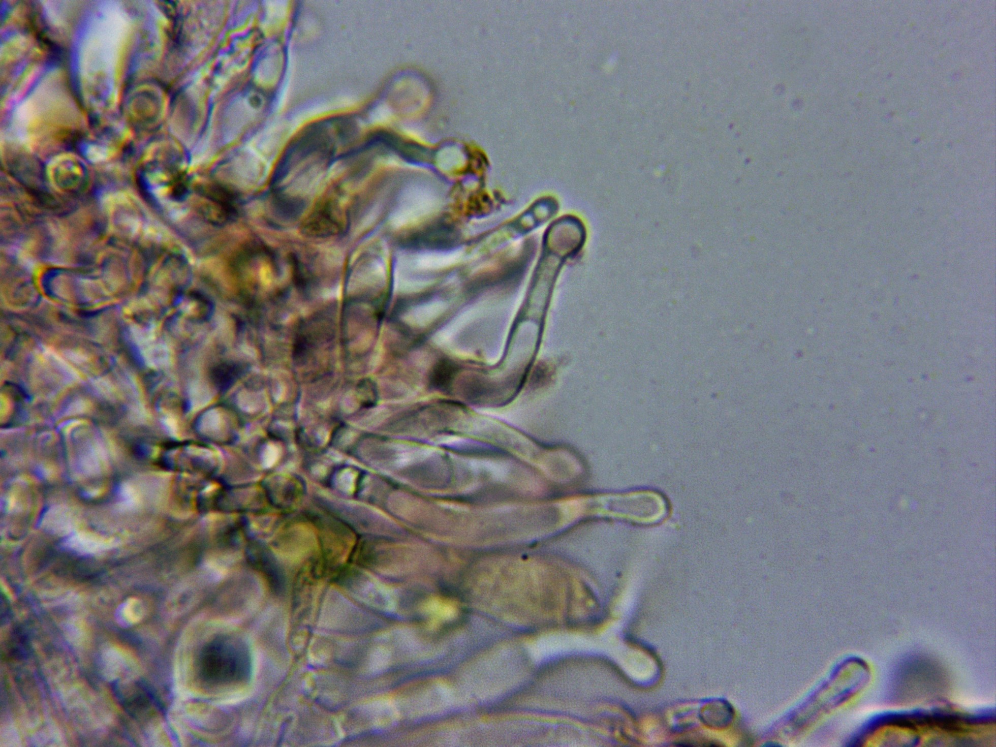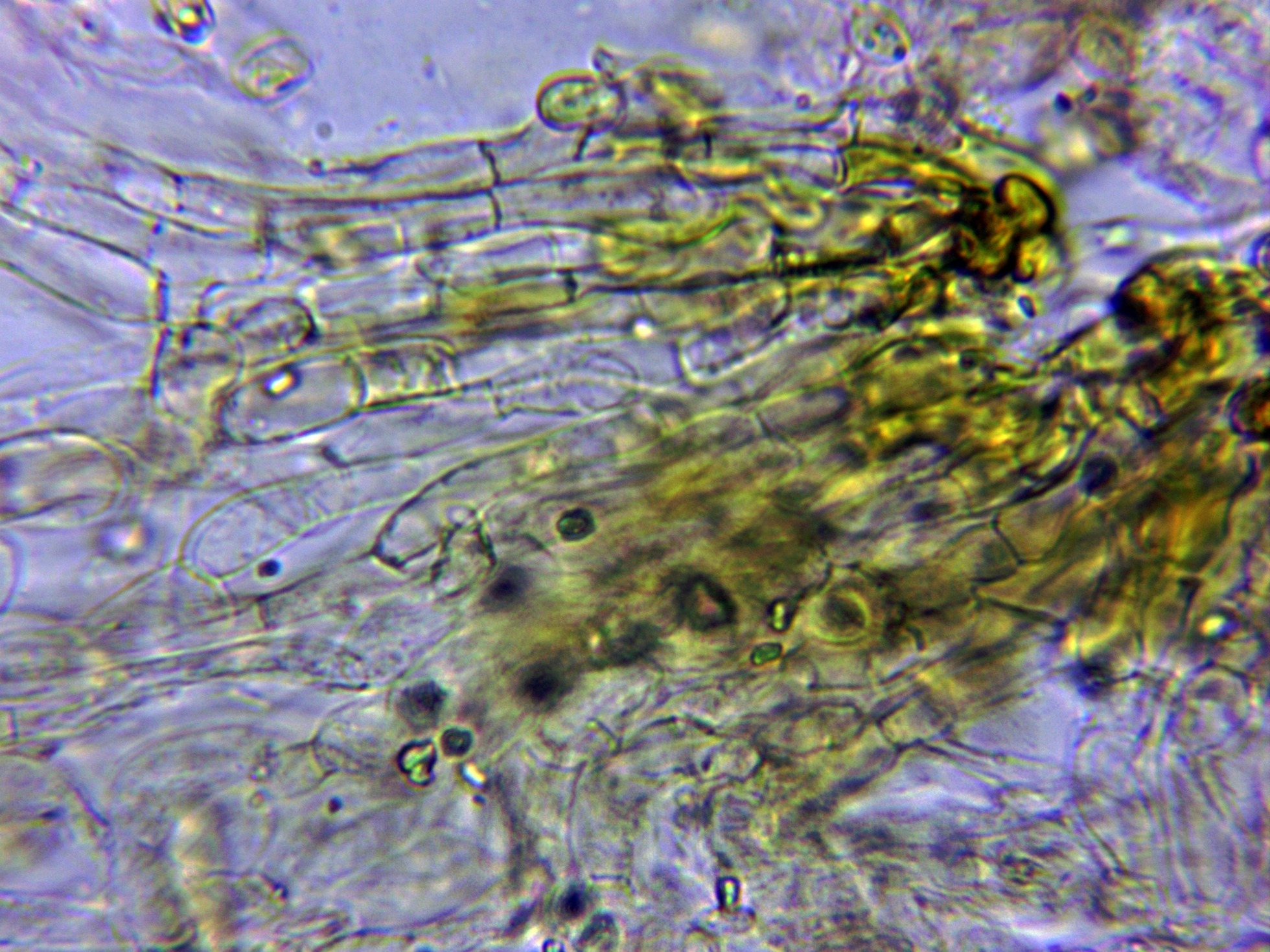 Hifas pileipellis entrelazadas y pigmentadas, sin fíbulas y con tabiques cortos.