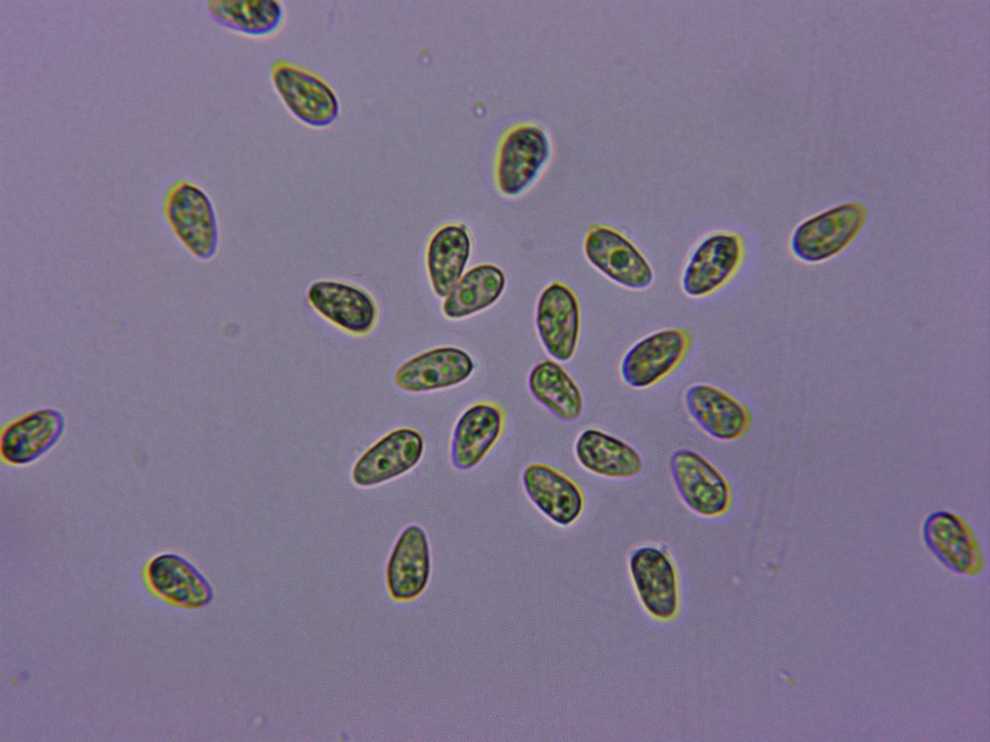 Esporas elipsoidales, estrechadas por un extremo con abundantes granulaciones y vacuolas en su interior, con una medidas de: