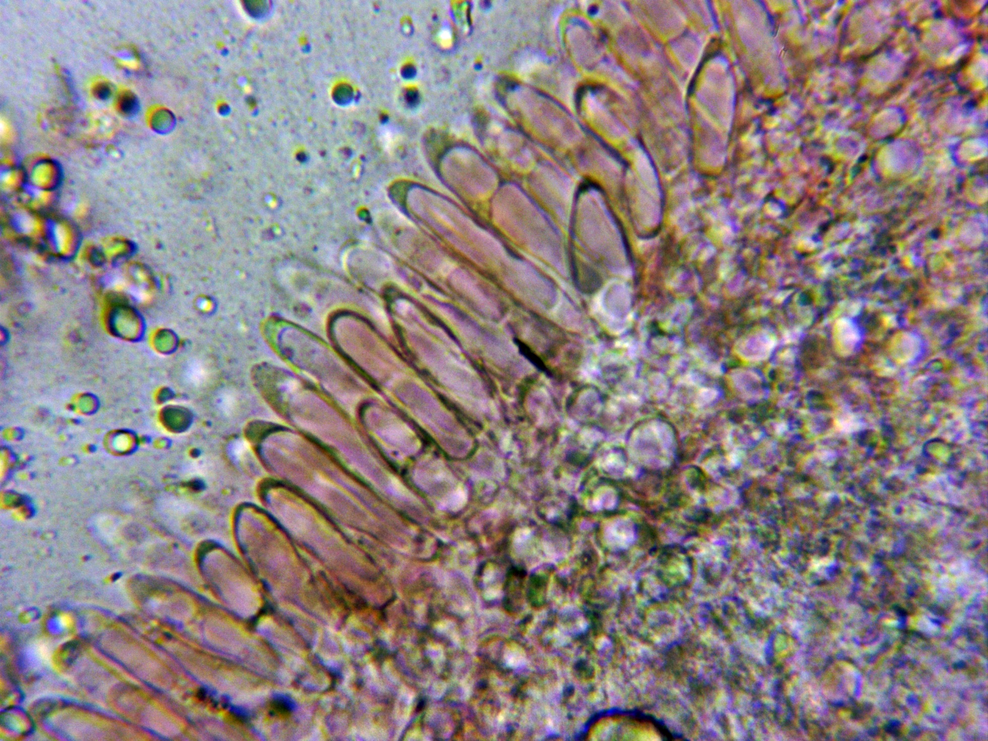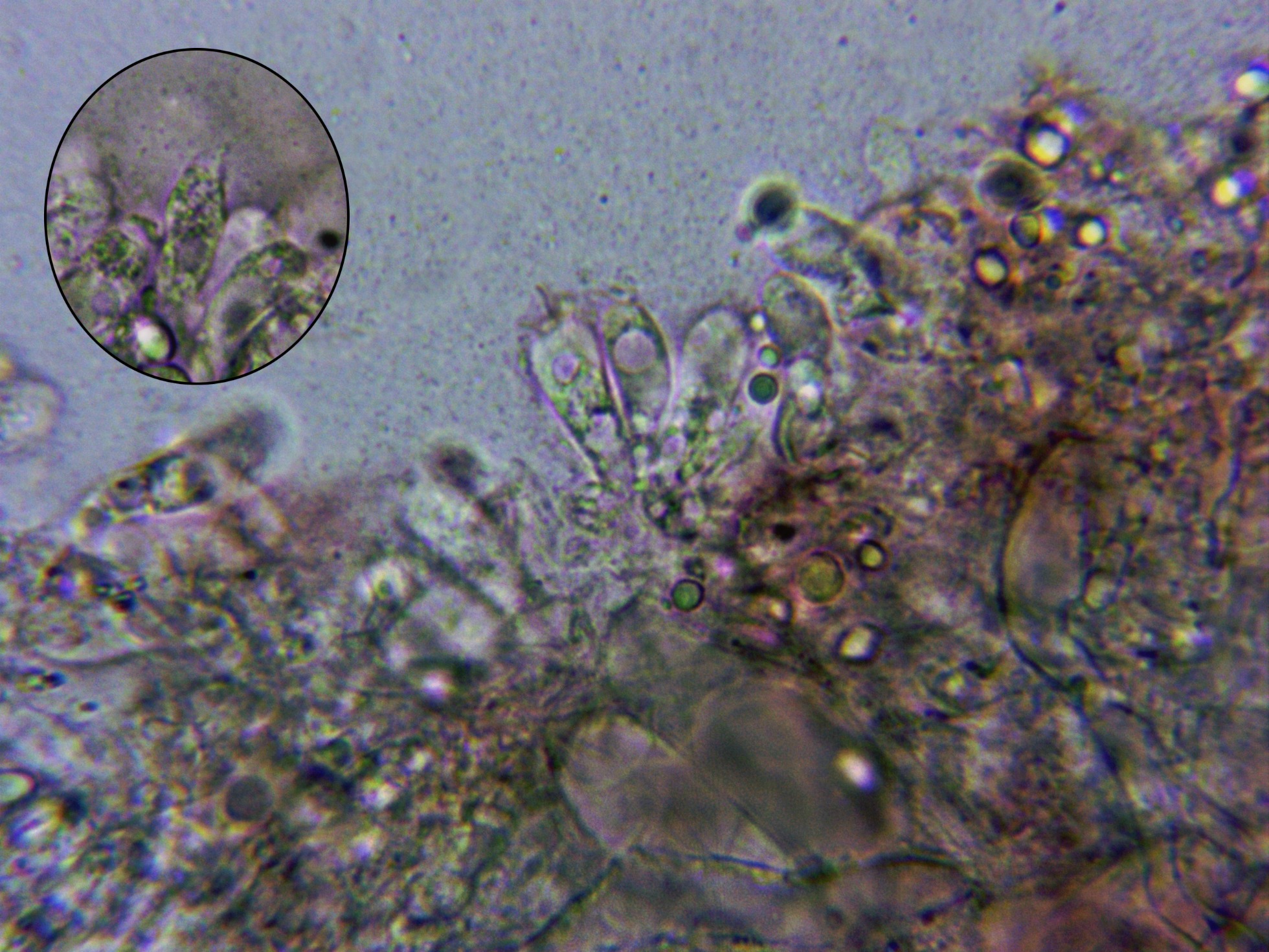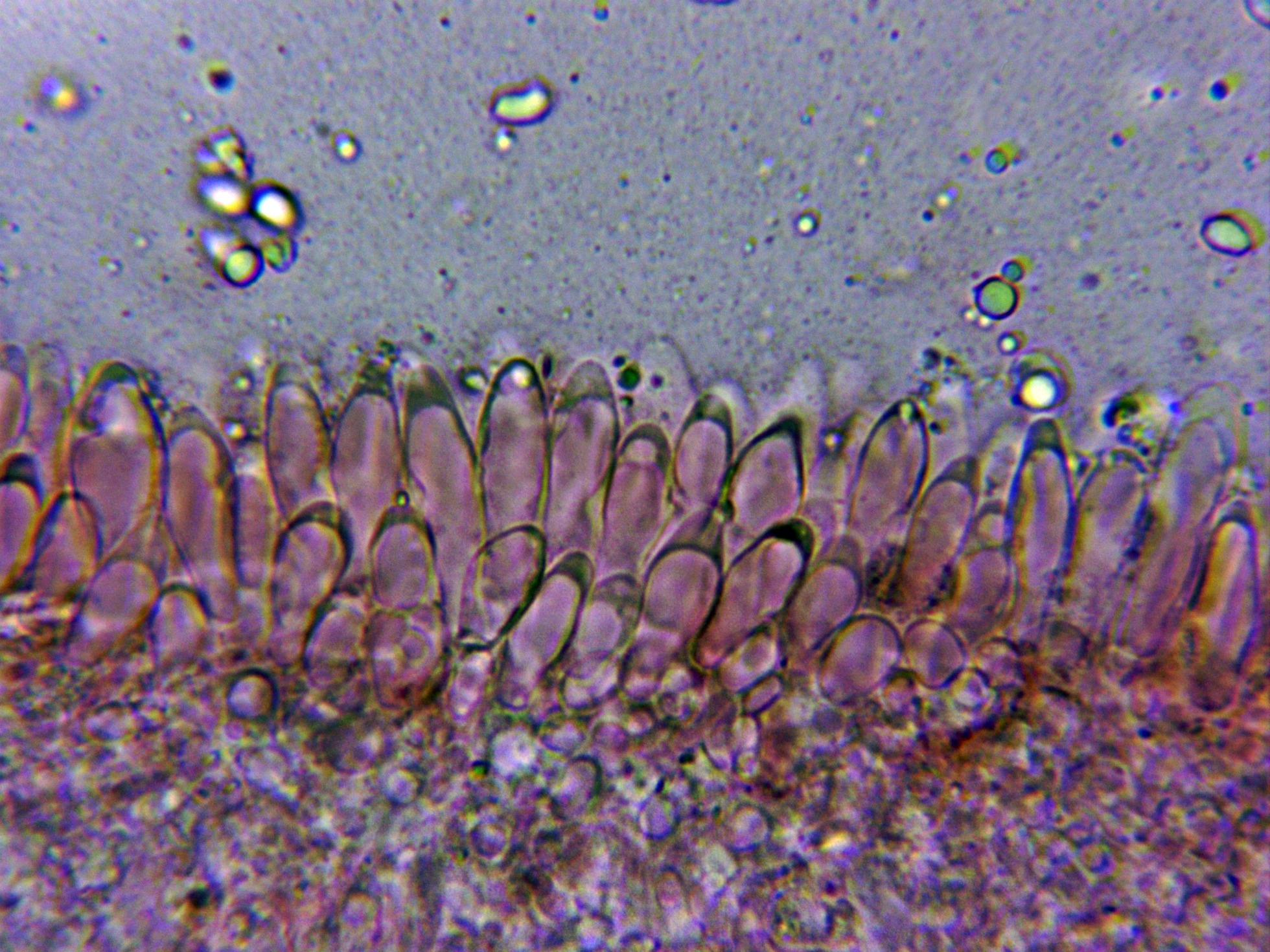 Base del pié a 400 aumentos, con algunos caulocistidios, aunque ya solo de manera dispersa y de no tan abundantes como en el ápice.