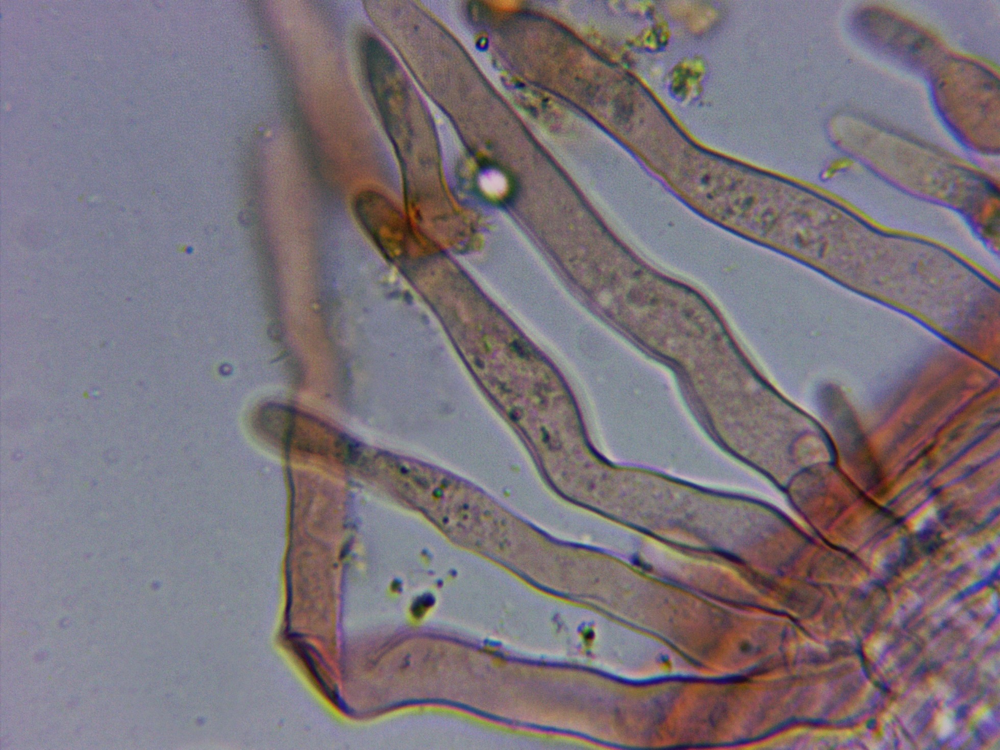 Caulocistidios a 1000 aumentos, muy abundantes, cilíndricos, muy alargados, algo flexuosos y con medidas que sobrepasan en algunos casos de largo las 100 µm. de longitud.