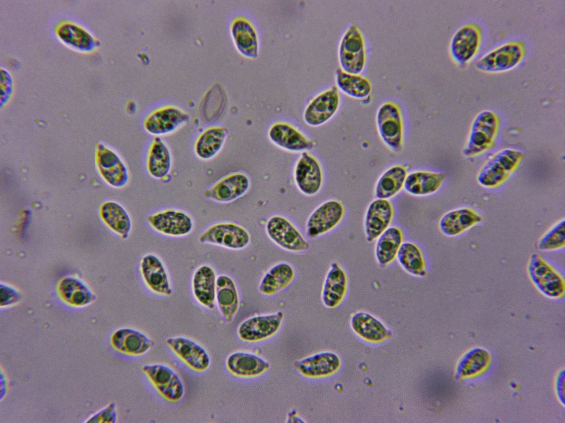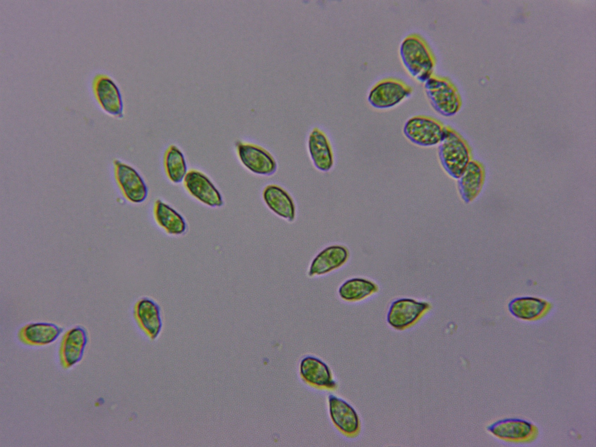 Las esporas, entre cilíndricas y amigdaliformes, con apícula lateral, de pared fina y con gutulaciones en su interior. Las medidas de estas: