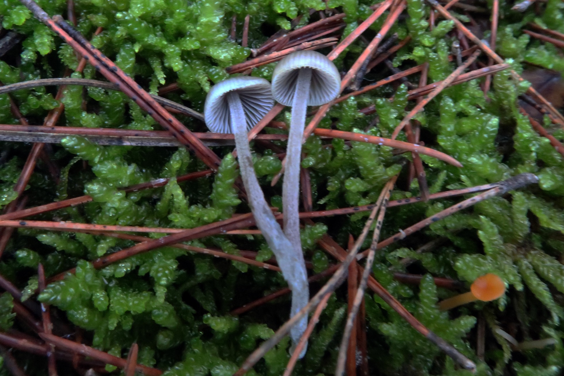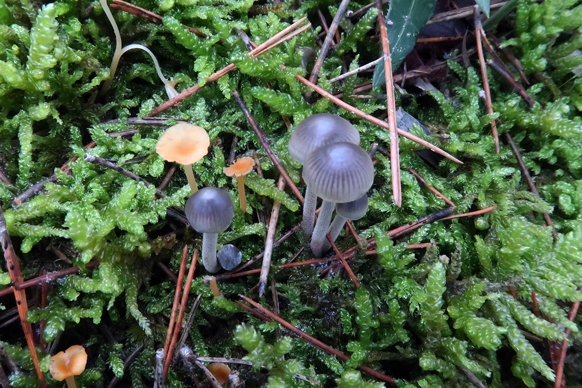Una pequeña Mycena, la mayor de poco más de 1 cm., compartiendo espacio con unas Rickenella fibula (las de color anaranjado).