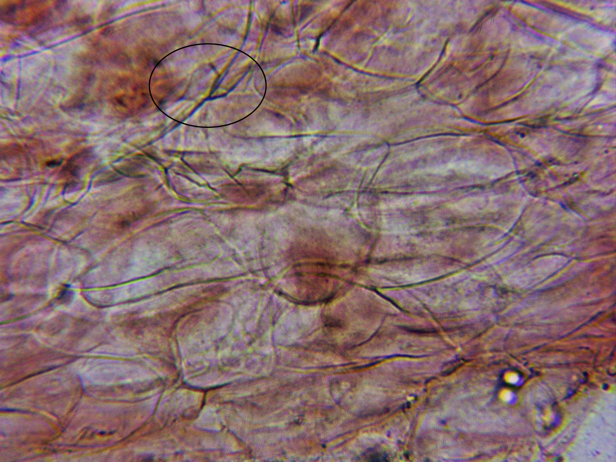 Imágen de la Pileipellis a 1000 aumentos, con hifas de entre 2 a 3,5 µm, ramificadas, hialinas, fibuladas e inmersas en una masa gelatinosa.