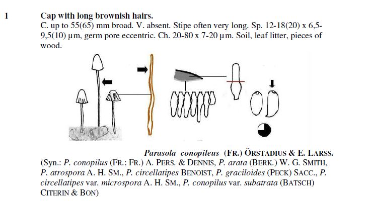 Gracias Jon Ander por el aporte, pues en este caso yo lo veo bastante claro, con estos pelos en la cutícula (crines), ausencia de pleurocistidios, la morfología de estos queilocistidios y la morfología y medidas esporales, tiene que tratarse sin duda de la Psathyrella conopilus = Parasola conopilus y actualmente denominada Parasola conopilea.