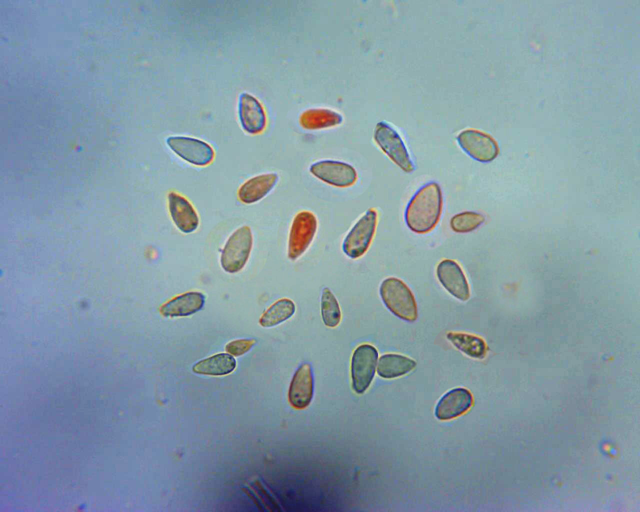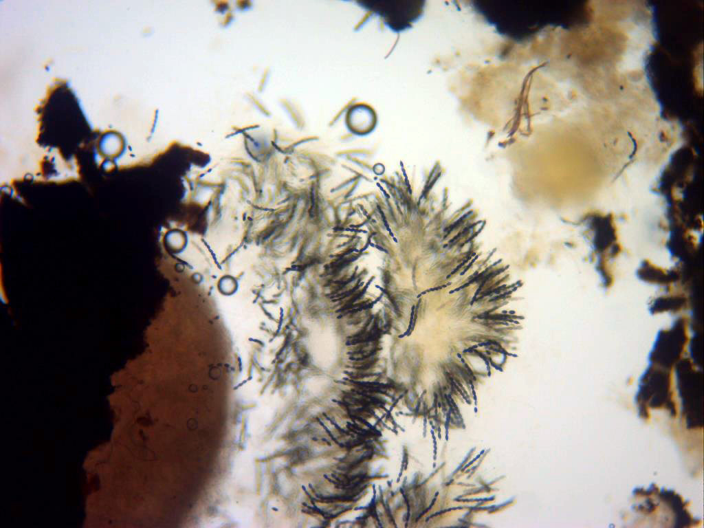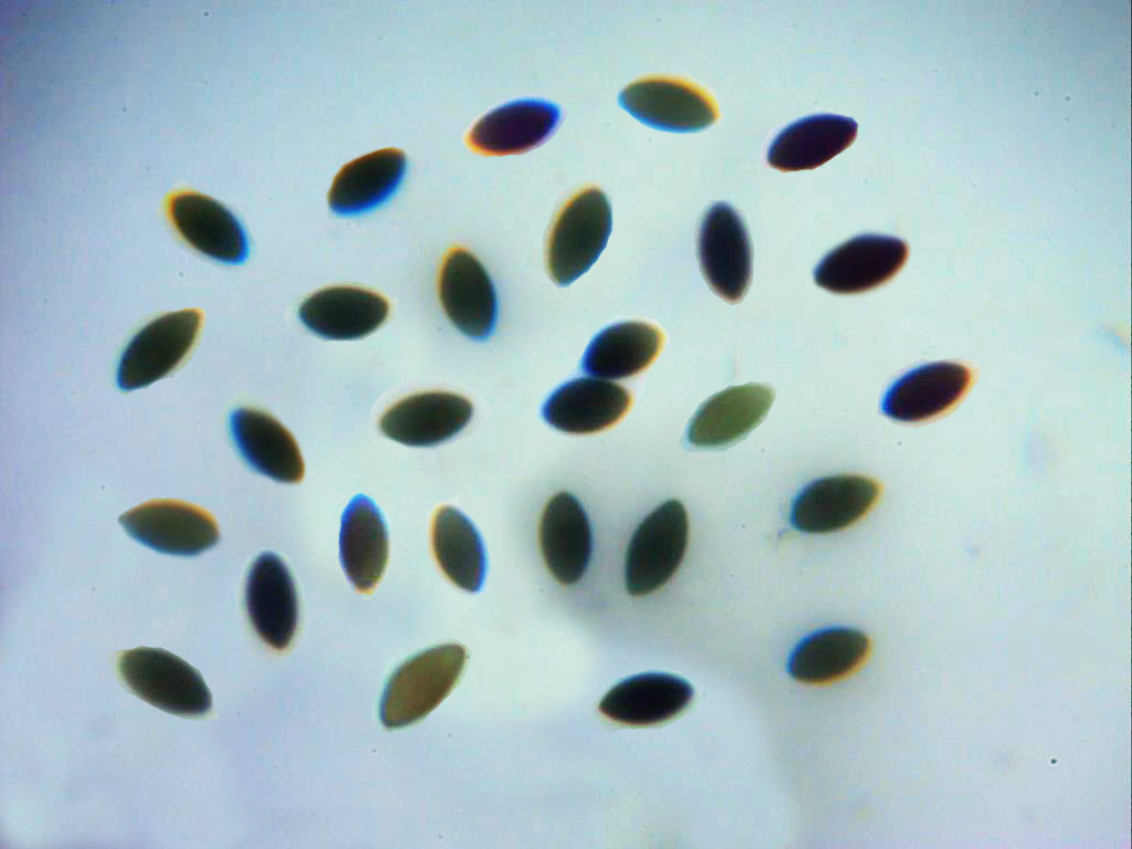 Y las esporas, disculpad la mala calidad de las imágenes ya que el equipo que utilizo aquí en la isla no es para tirar cohetes, y además lo encontré todo parasitado por hongos (probablemente Aspergillus fumigatus), aunque esto creo ya haberlo solucionado con una exhaustiva limpieza, posterior a este estudio.