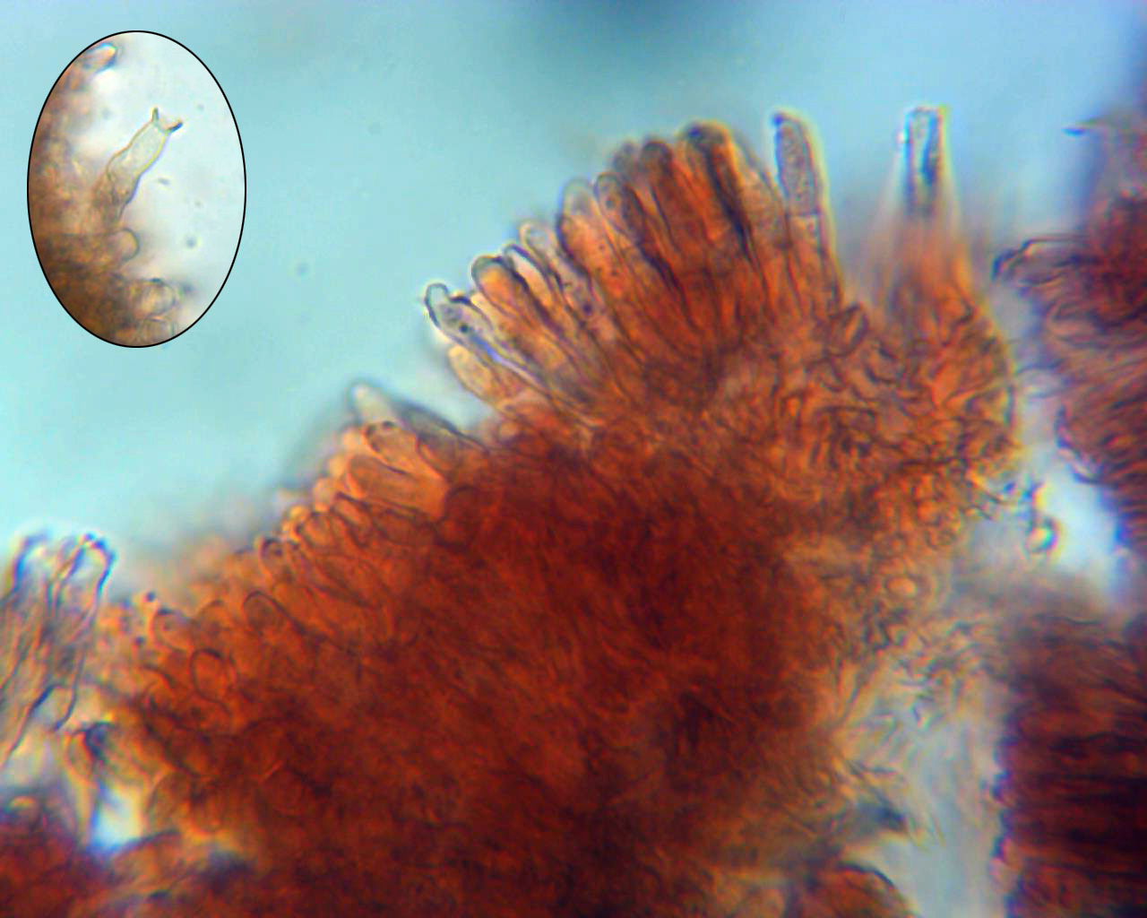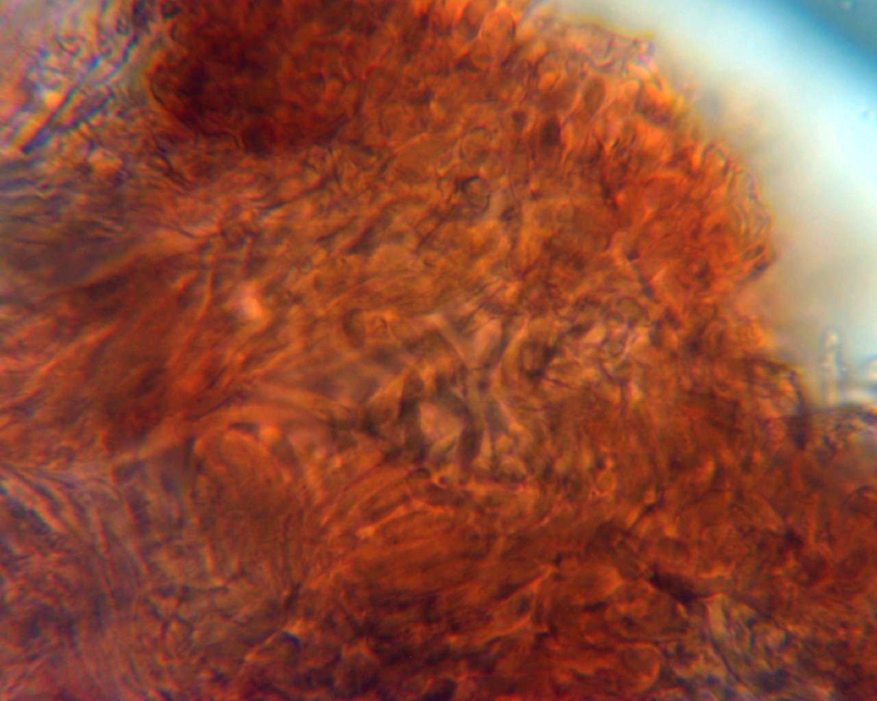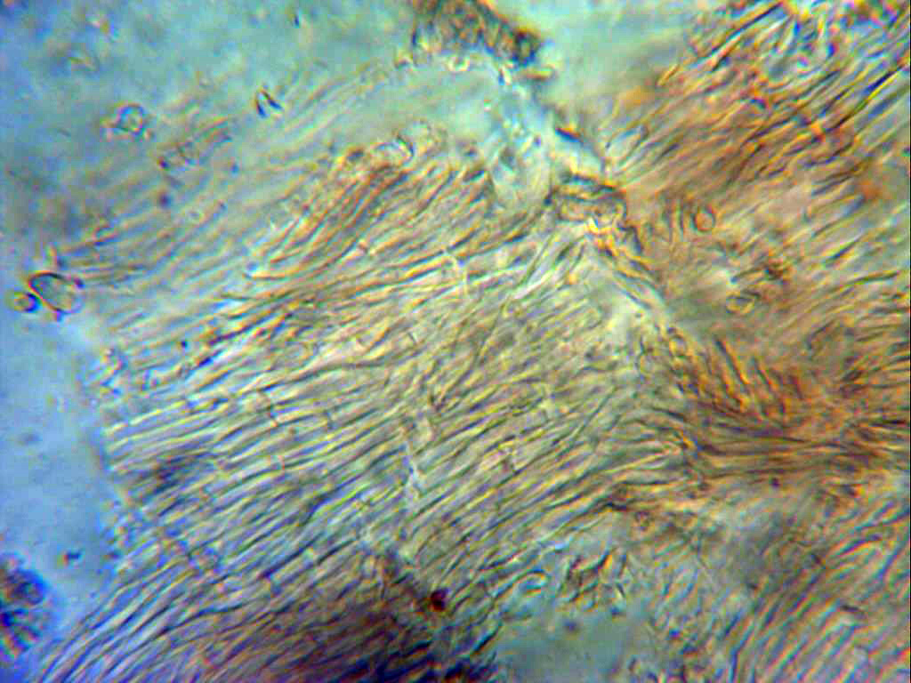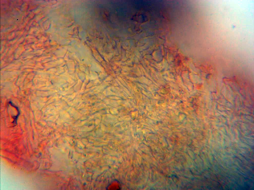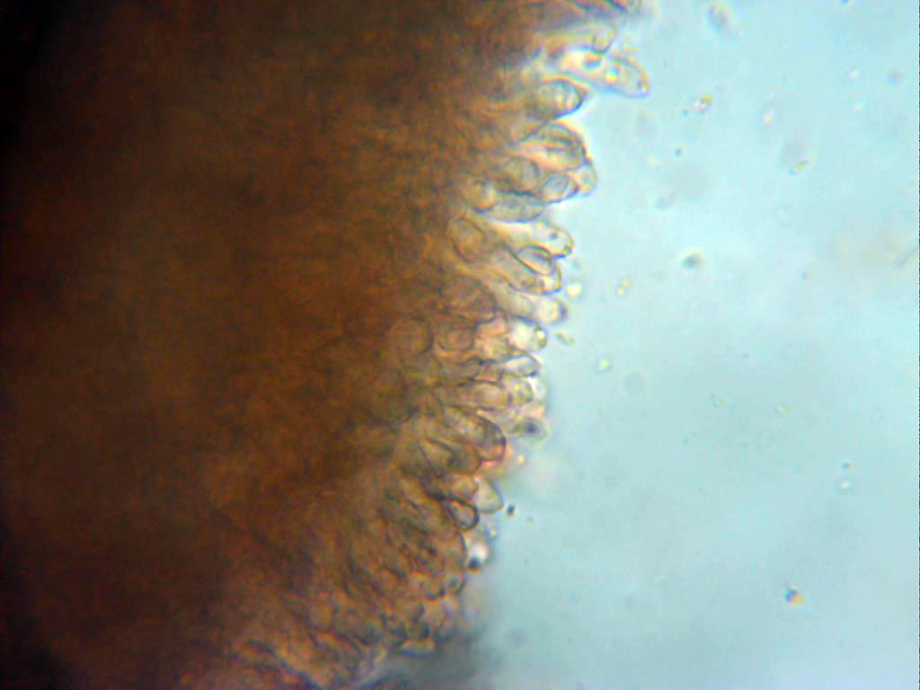 Superficie del mismo con lo que parece totalmente cubierta de basidios. Sin cistidios observados y tampoco nada parecido a conidióforos.
