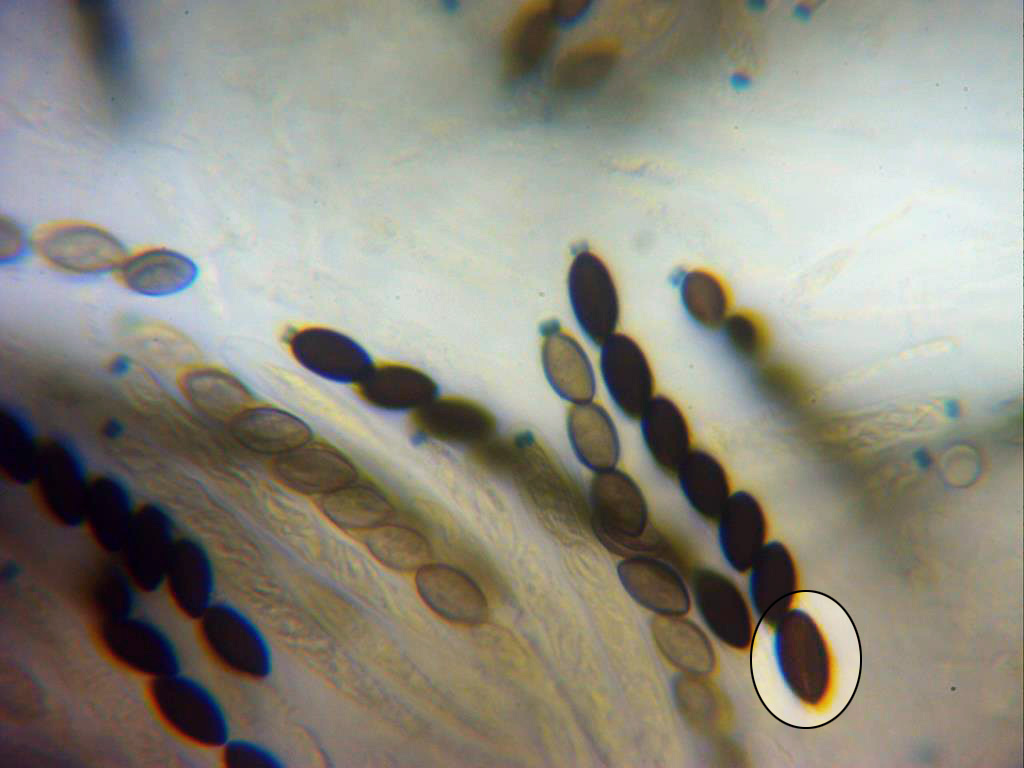 Esporas dentro del asca, presentan una hendidura germinal recta (de difícil observación) que ocupa casi toda la extensión de la misma.