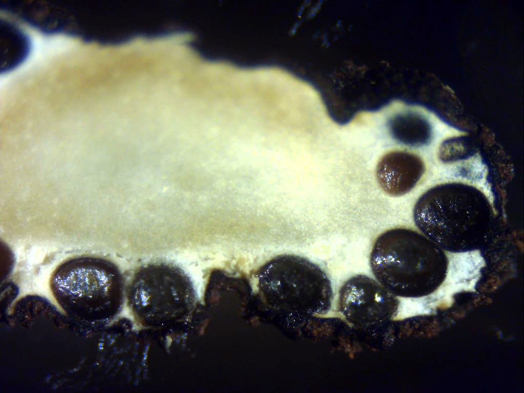 Sección del estroma con luz indirecta donde se observa la sustancia gelatinosa dentro de los peritecios, donde están alojadas las ascas.