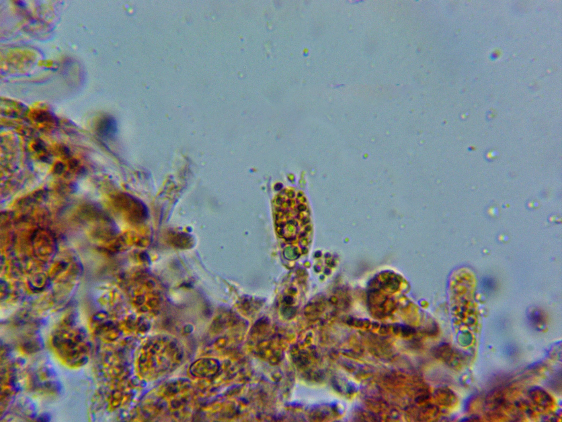 En el interior de los basidios se observa un contenido granuloso que se tiñe con Rojo Congo diluido.