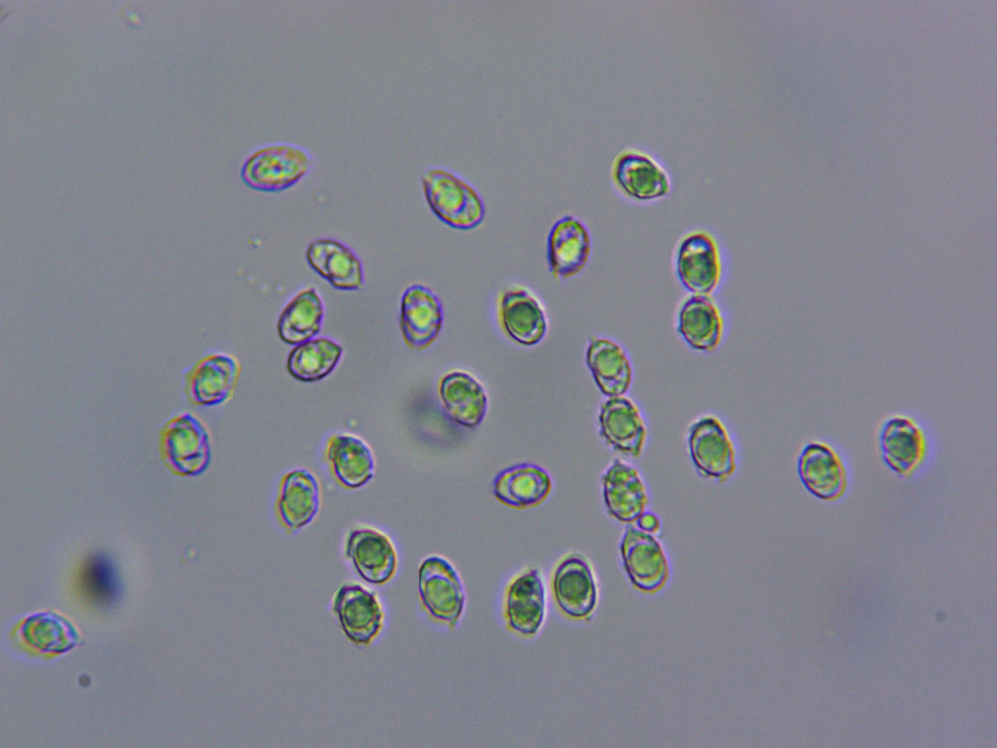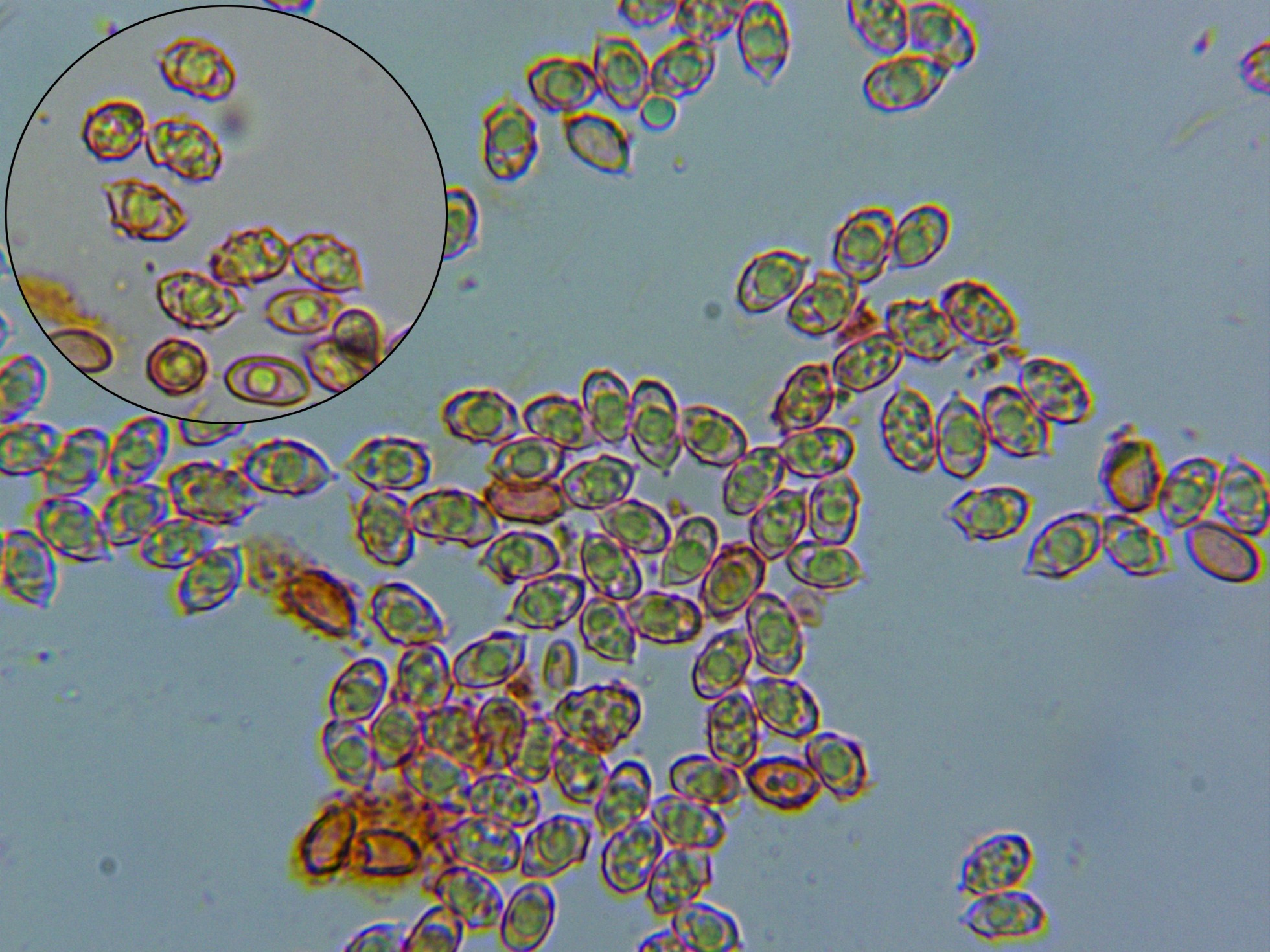 Esporas elipsoides, con apícula bien diferenciada, superficie muy verrucosa en función del plano observado y con una gútula o vacuola de grasa en su interior.