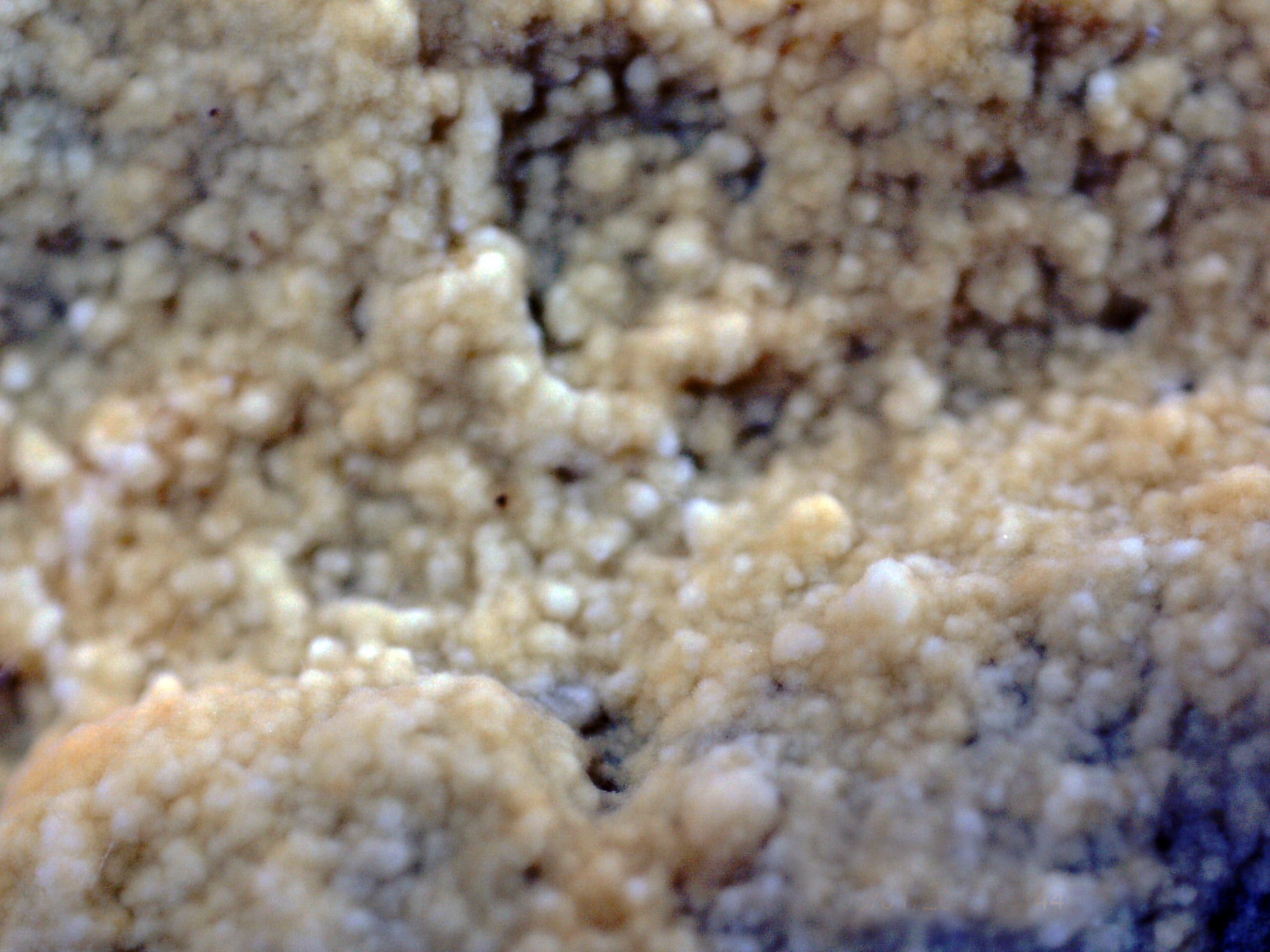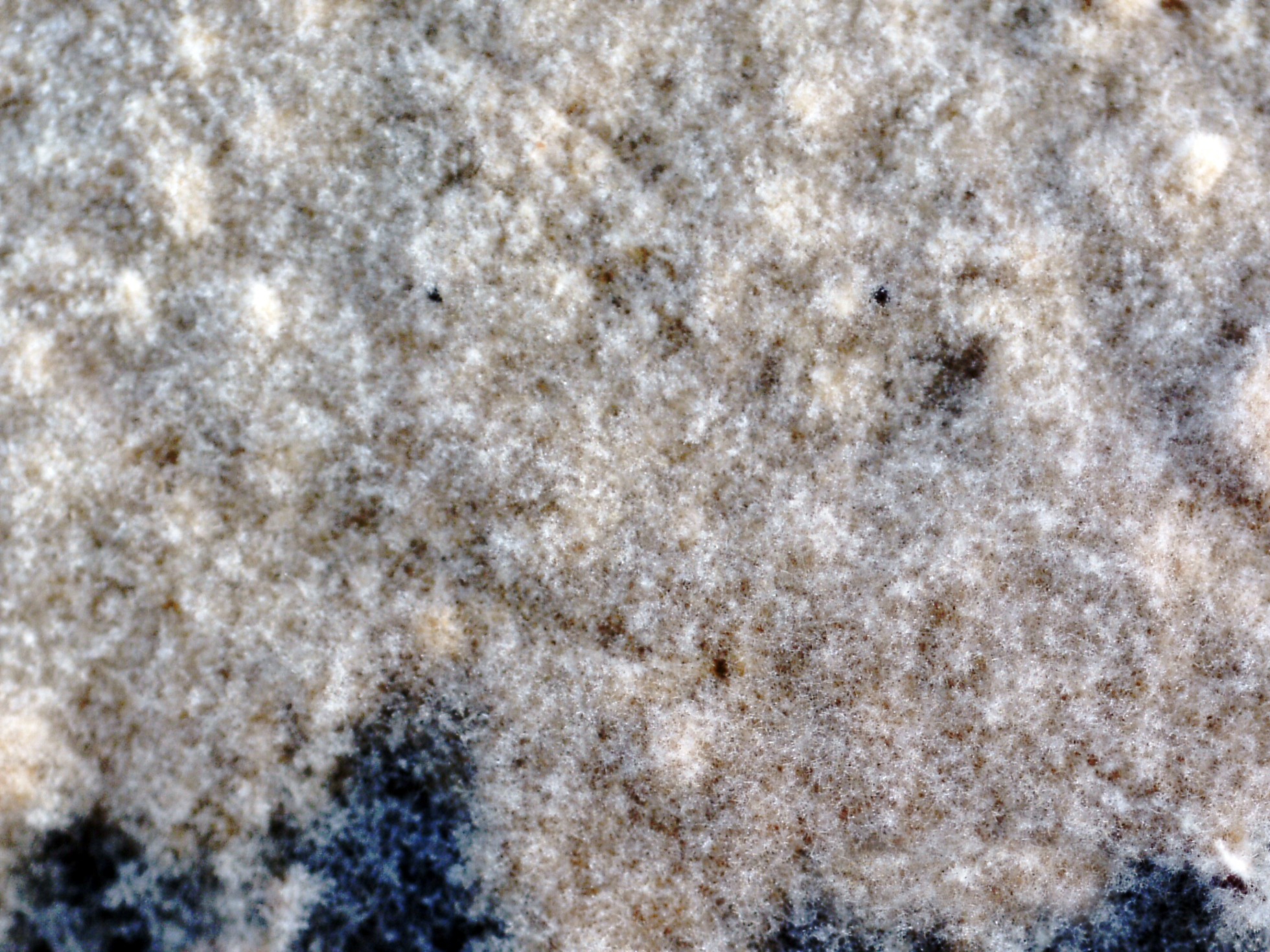 Una roña muy fina (menos de 1 mm.), de color pardo ocráceo, con superficie granulosa y borde de crecimiento blanquecino y fibroso.
