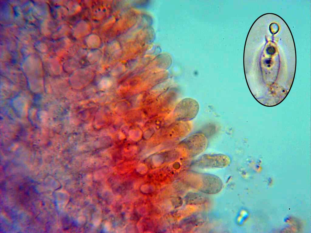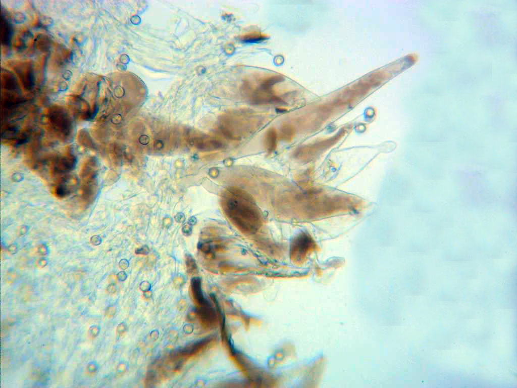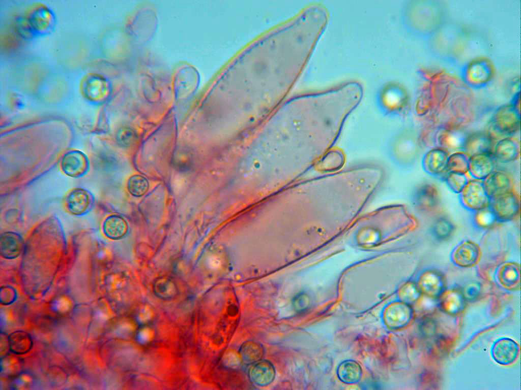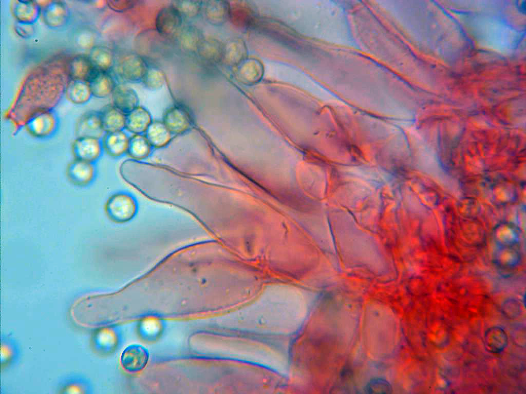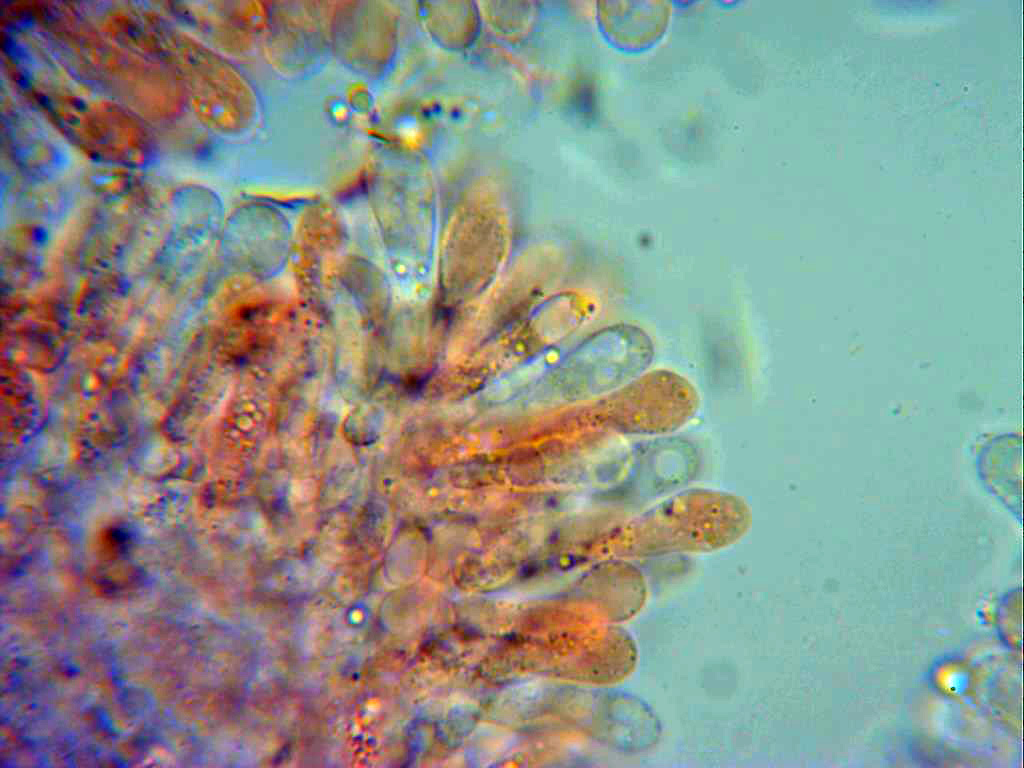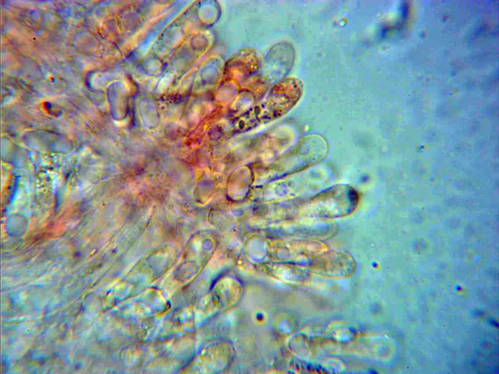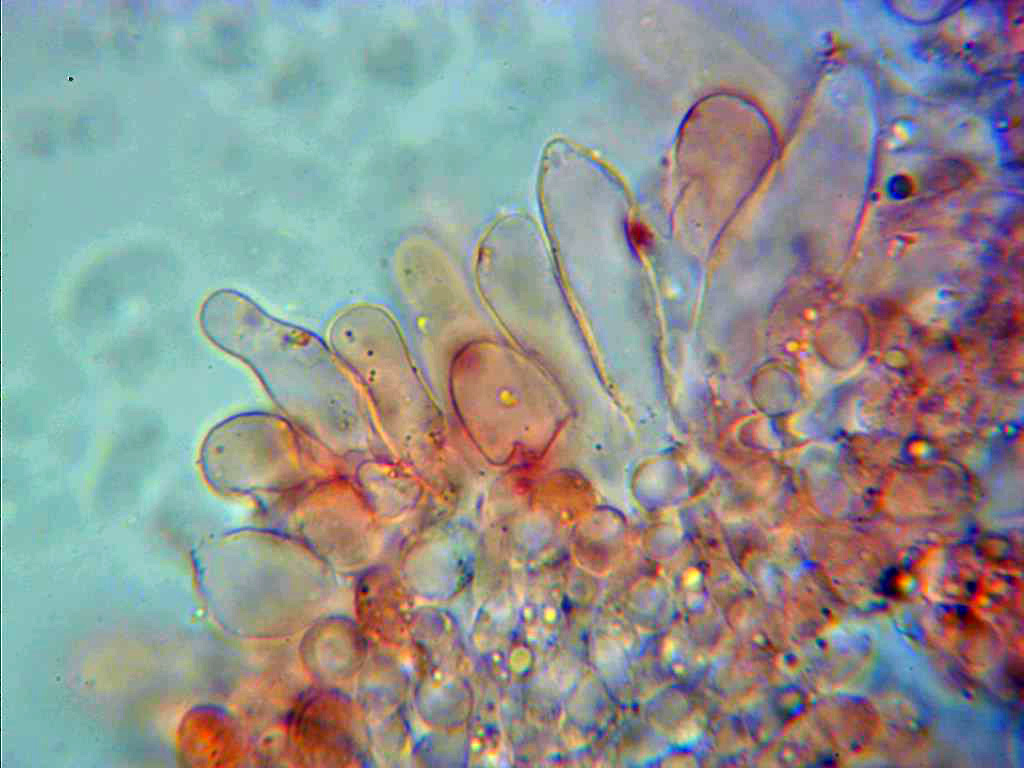 Queilocistidios a 1000 aumentos, con algunos de ellos de gran tamaño, entre cilíndricos y fusiformes, algunos ventrudos, otros de ligeramente capitados, con morfología bastante variada.