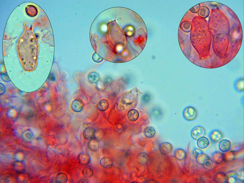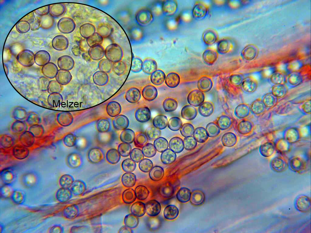Esporas en Rojo Congo diluido y en la miniatura en reactivo de Melzer (inamiloides).