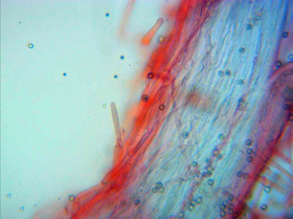 Pileipellis a 1000 aumentos con hifas algo mas cortas y anchas que en el ejemplar adulto.