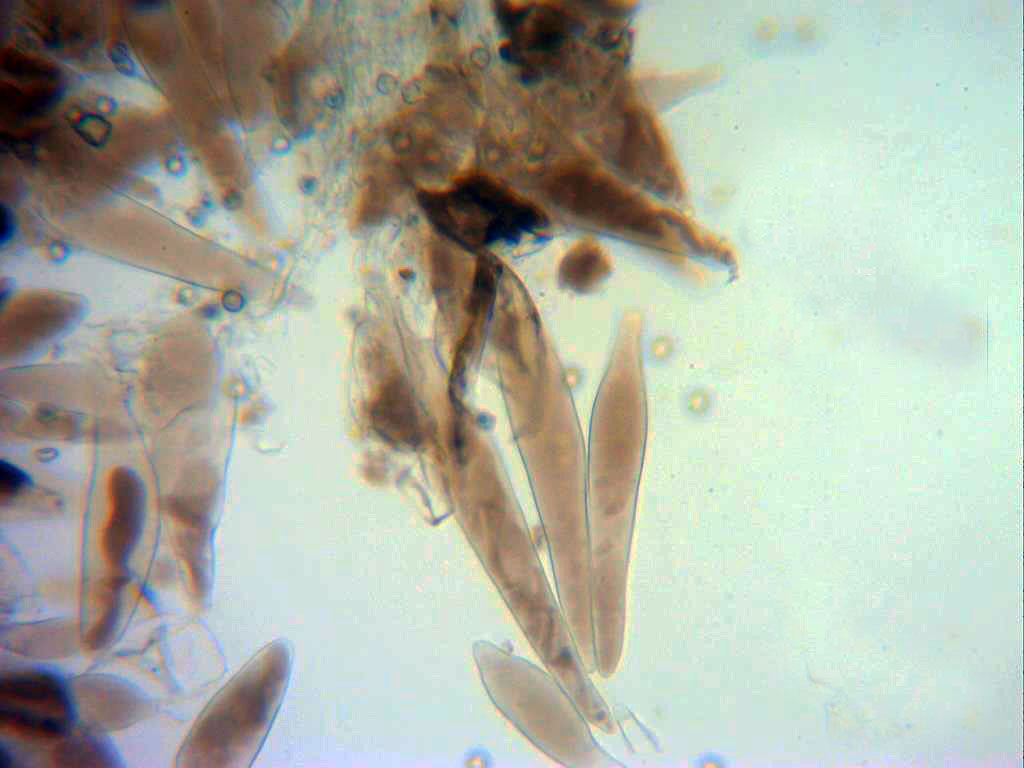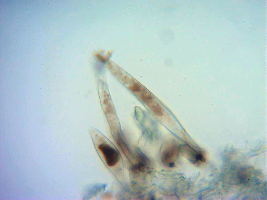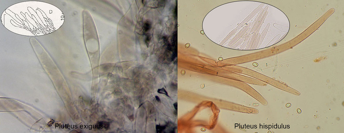 En mi caso las hifas son al igual que Pluteus exiguus, alargadas tímidamente lanceoladas, con ensanchamientos y contenido pigmentado en su interior. Muy distintas de las del Pluteus hispidulus, menos pigmentadas, cilíndricas, septadas y prácticamente uniformes (sin evidentes ensanchamientos).
