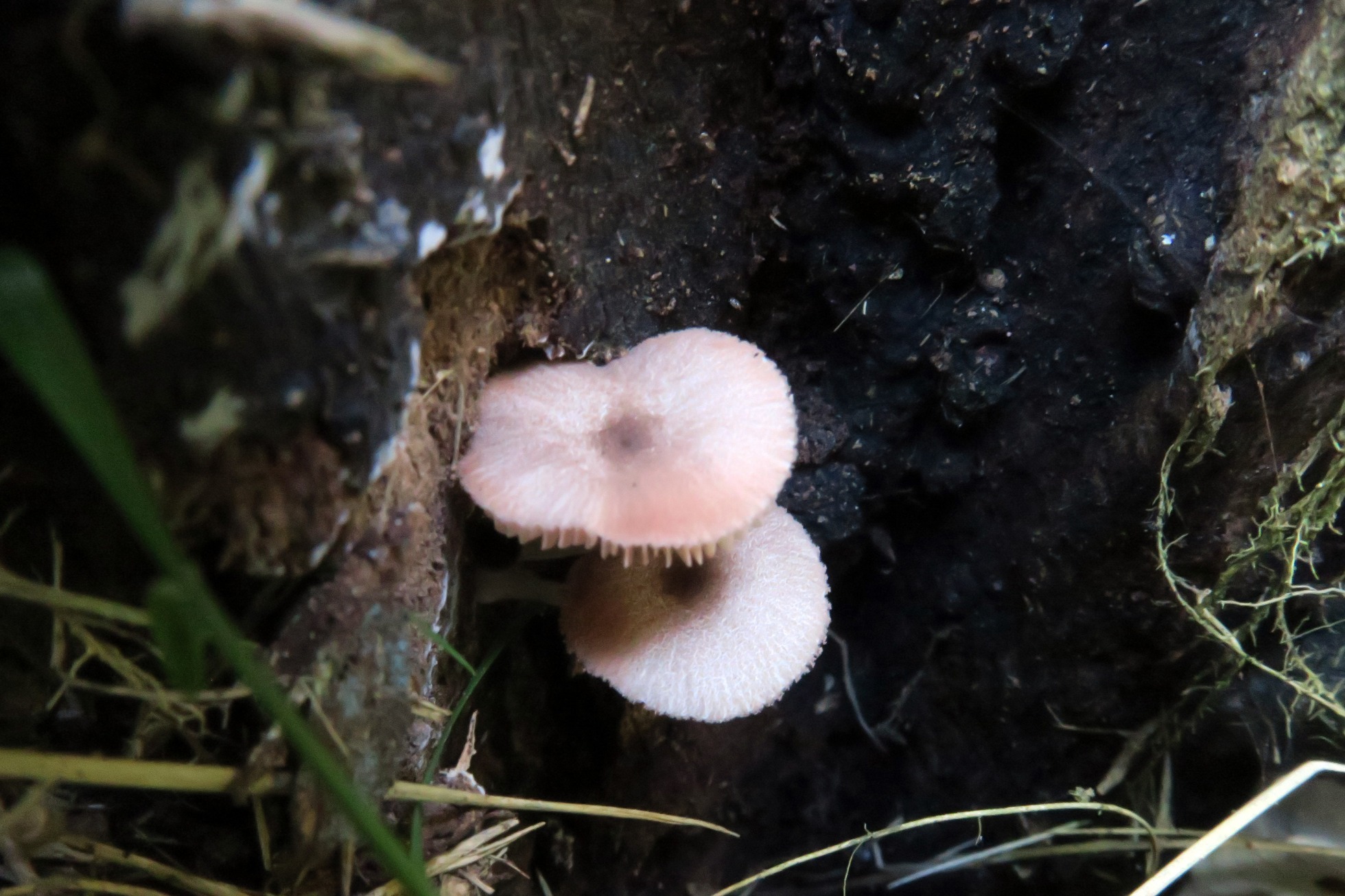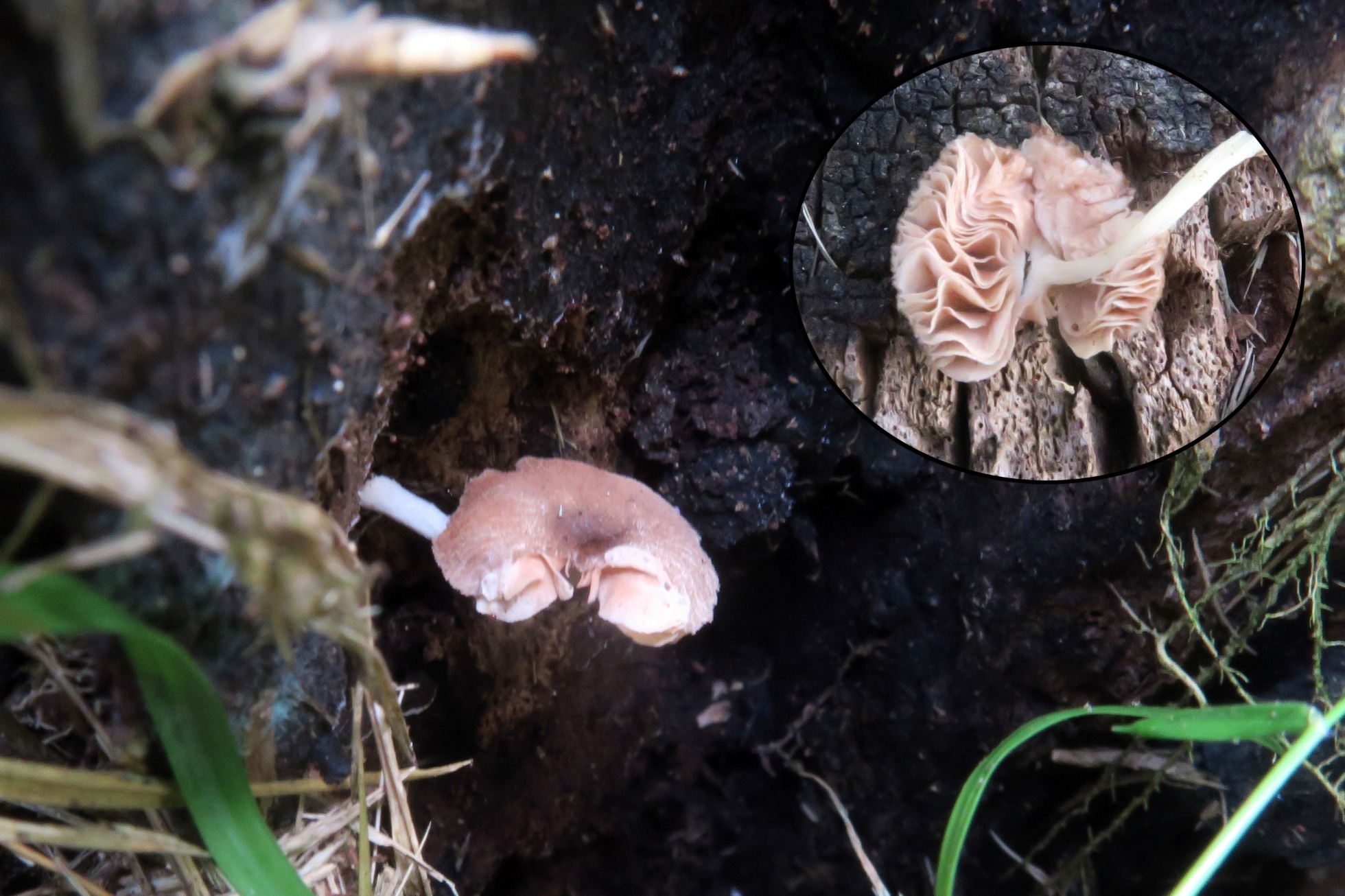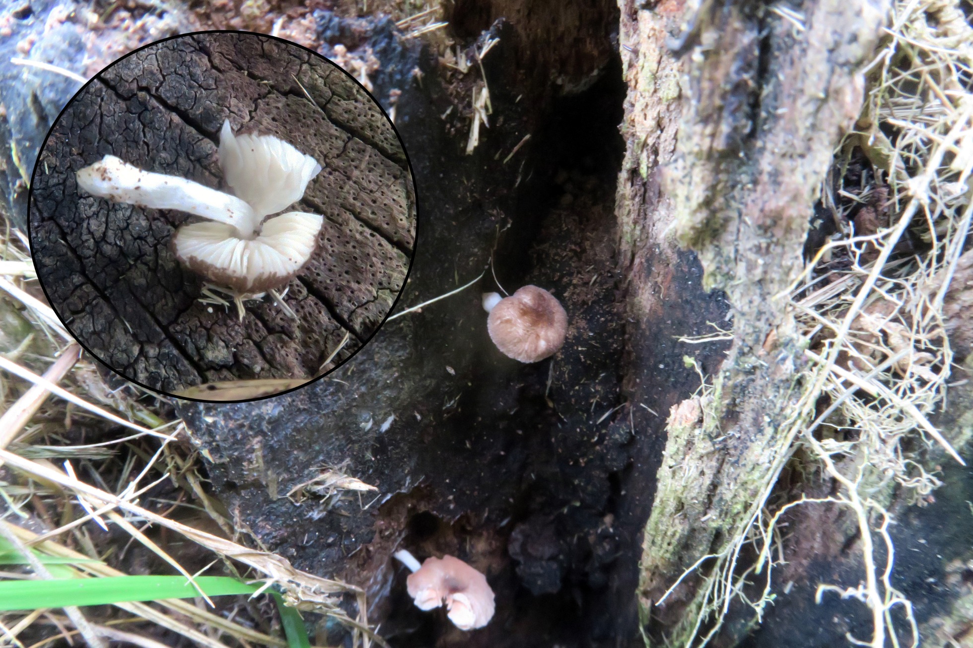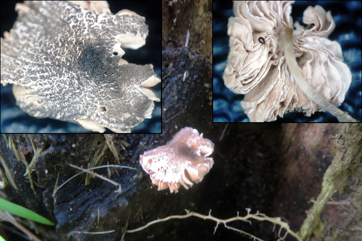 Una composición de unas imágenes tomadas ayer en la República Dominicana de un diminuto Pluteus, brotando directamente de un tocón ya bastante degradado de Mango "Mangifera indica".