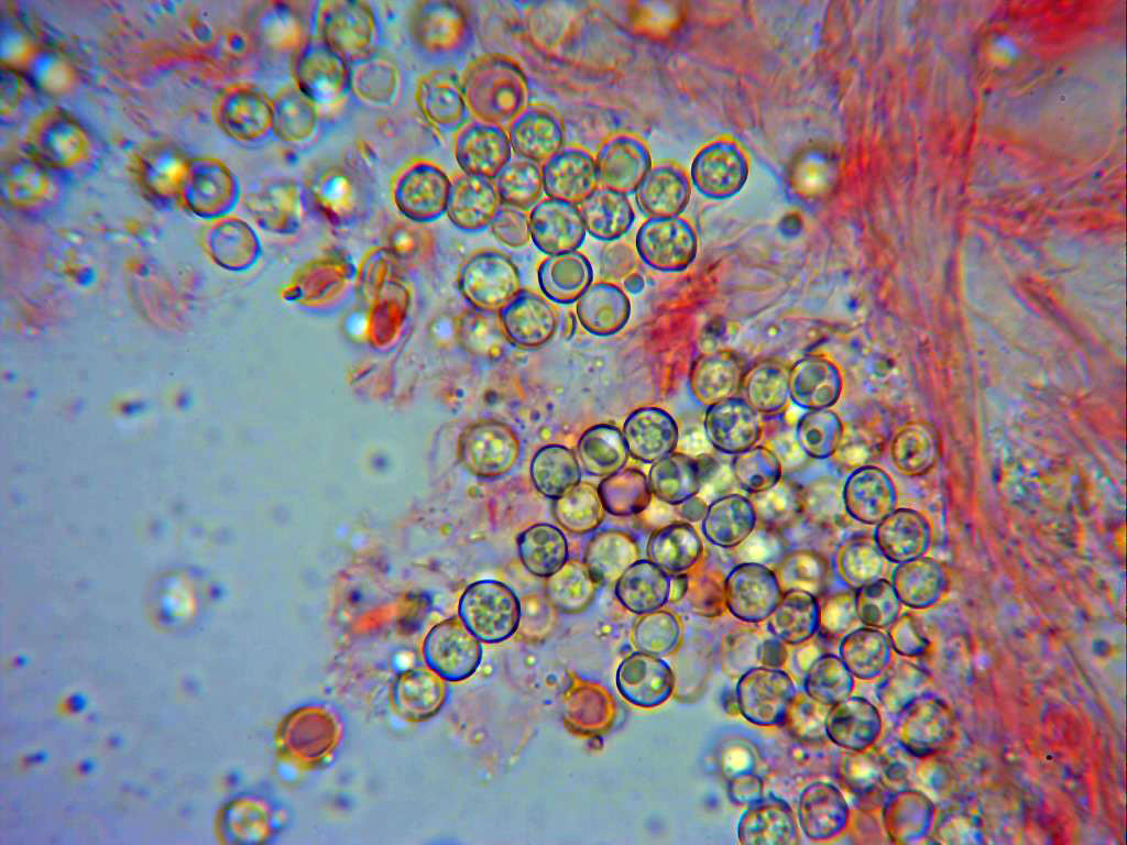 Esporas entre esféricas y cortamente elipsoidales, en mis mediciones sobre una muestra de 50 de ellas el resultado de: