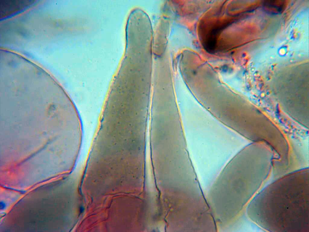 Hifas de la cutícula a 400 aumentos, con hifas emergentes a modo de pileocistidios, que en algunos casos parecen brotar de una base común, estas hifas pigmentadas de un contenido marrón pardo. Esta morfología de la pileipellis resulta bastante común dentro del género Pluteus.