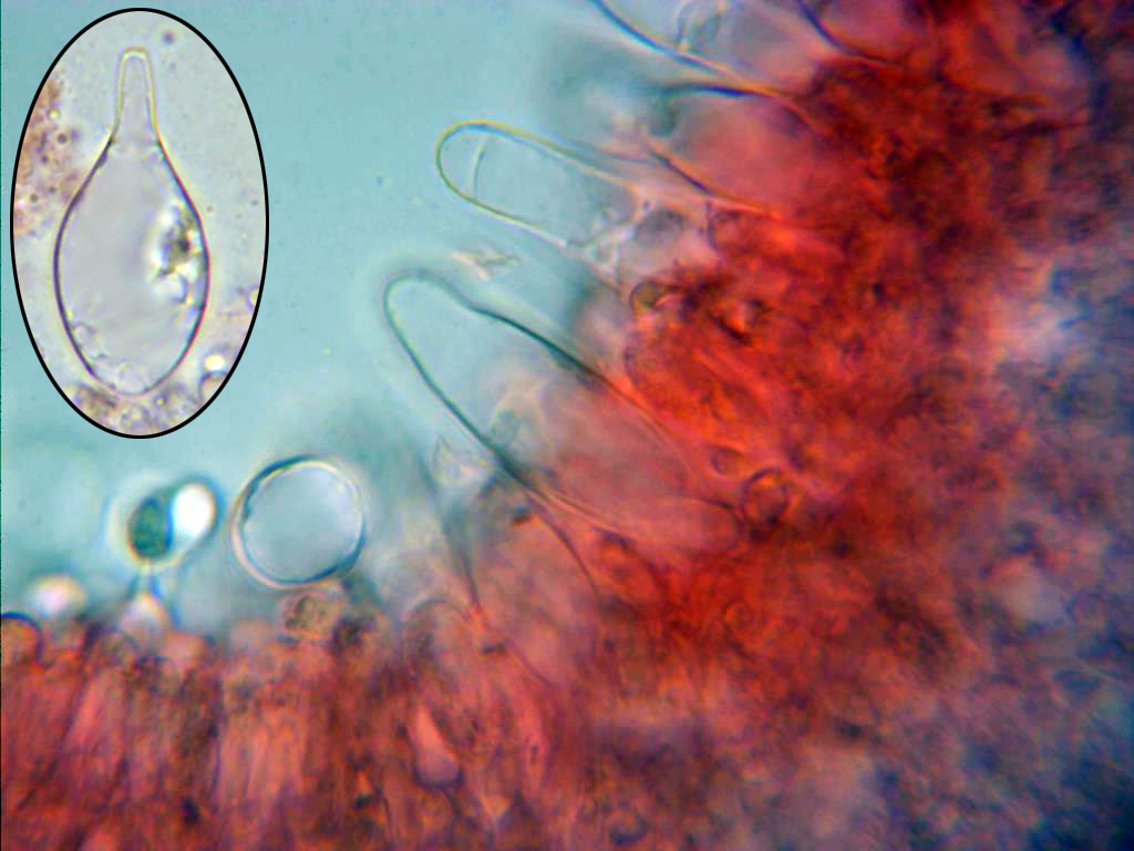 Queilocistidios entre globosos y piriformes, con algunas tenues rugosidades en la superficie de algunos.