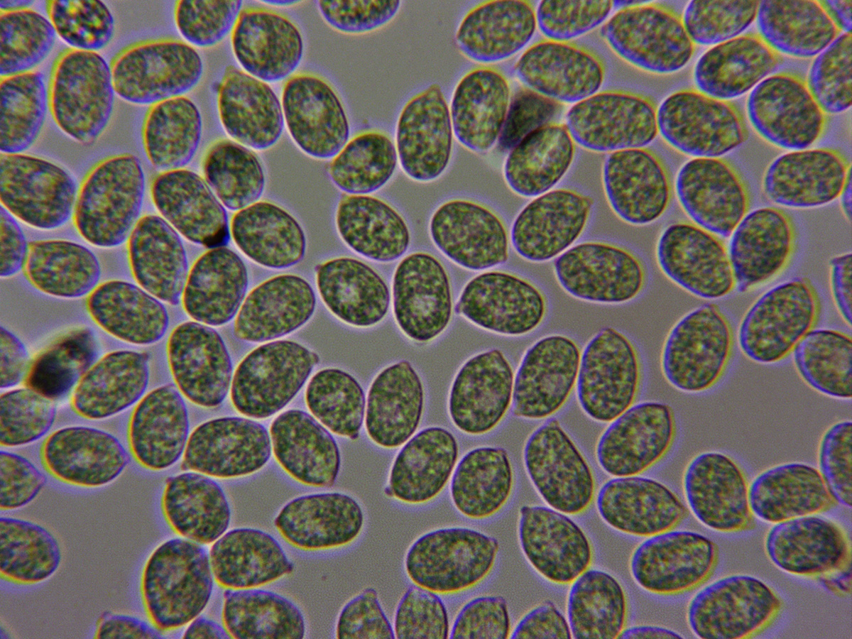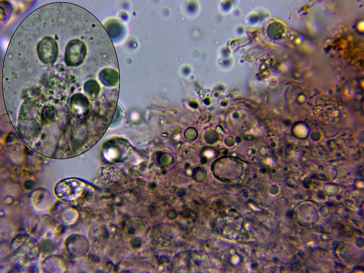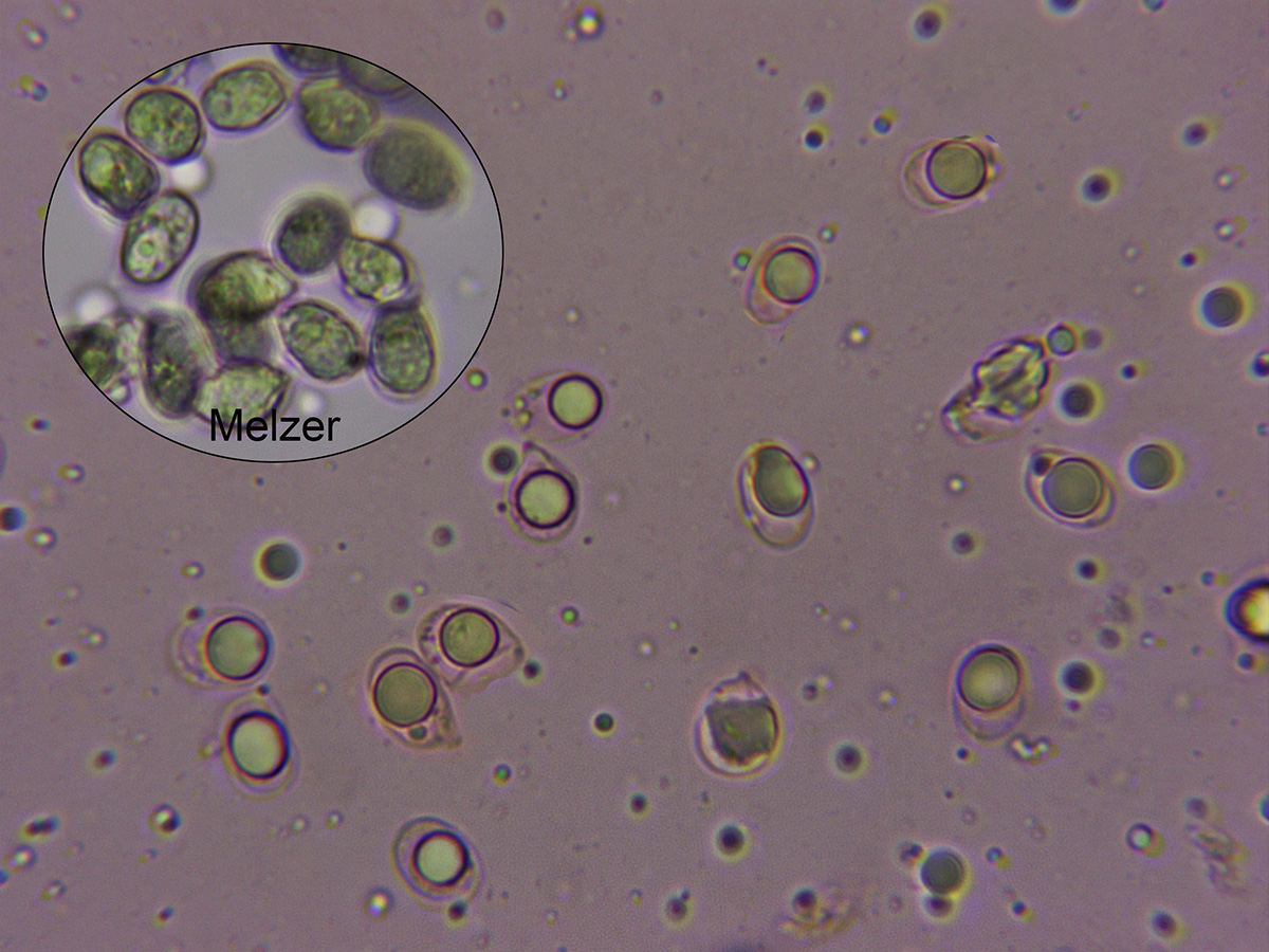 Imágen de esporas obtenidas de manera forzada (inmaduras) y en la miniatura en reactivo de Melzer (inamiloides).