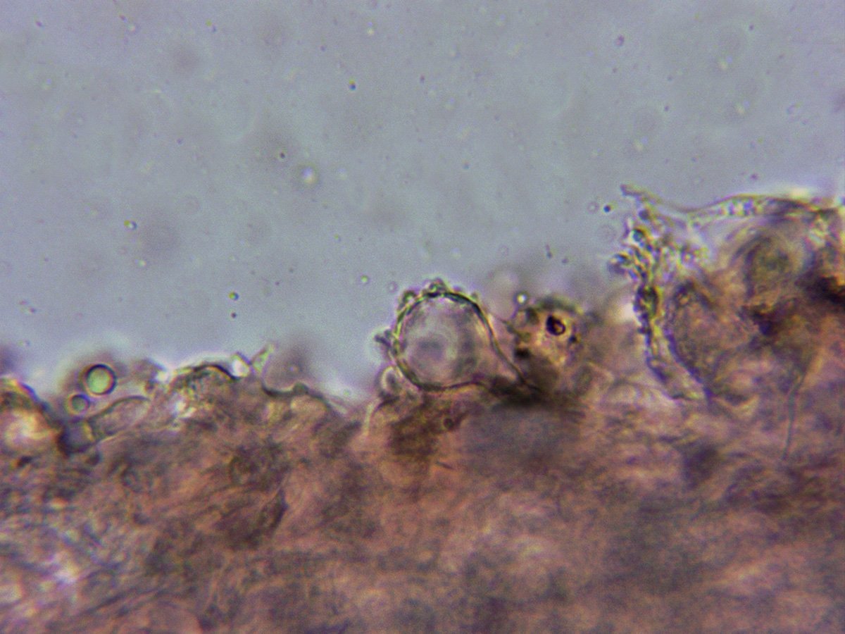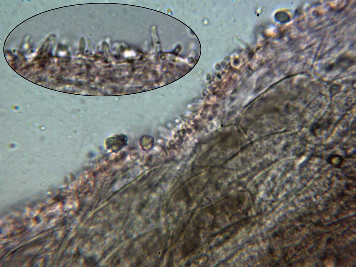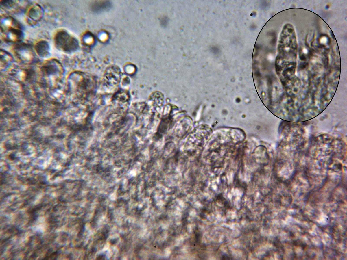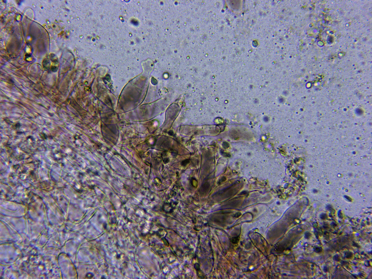 Arista laminar a 400 aumentos, con queilocistidios con pigmento de color violáceo.