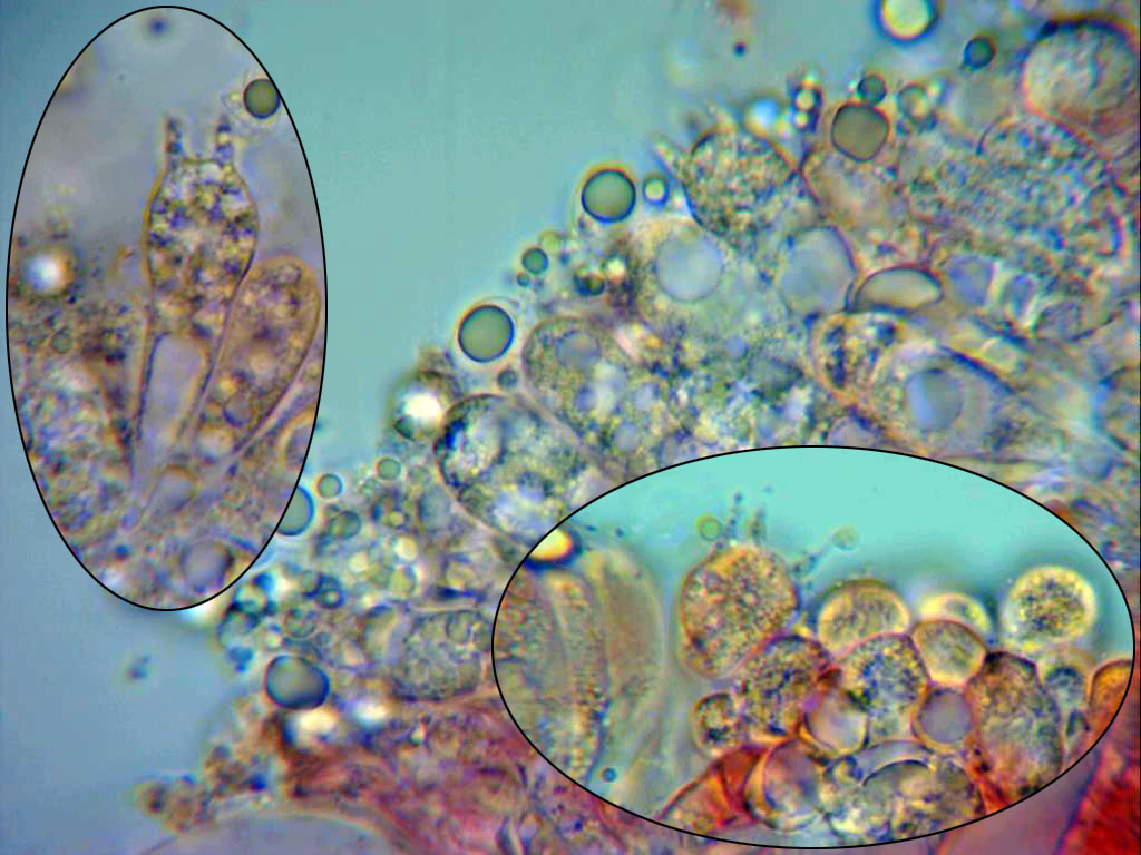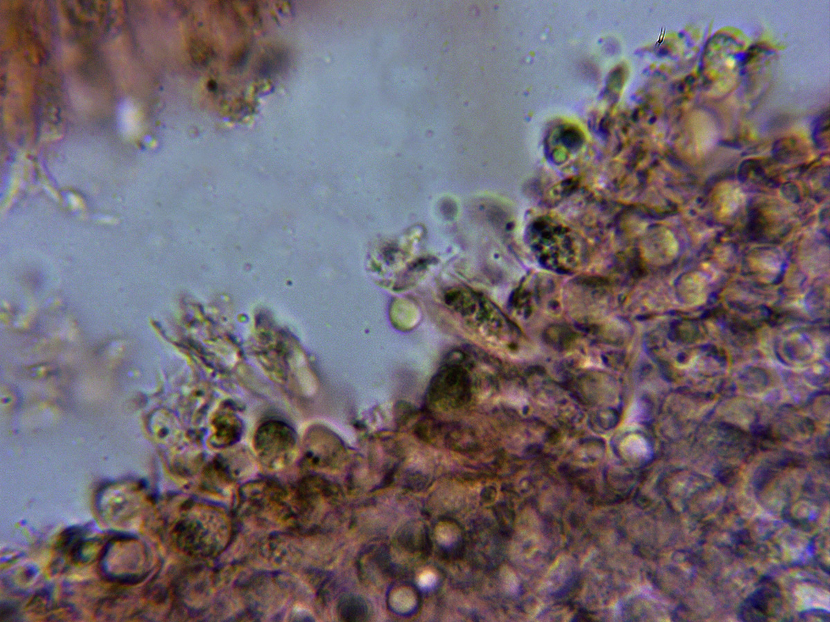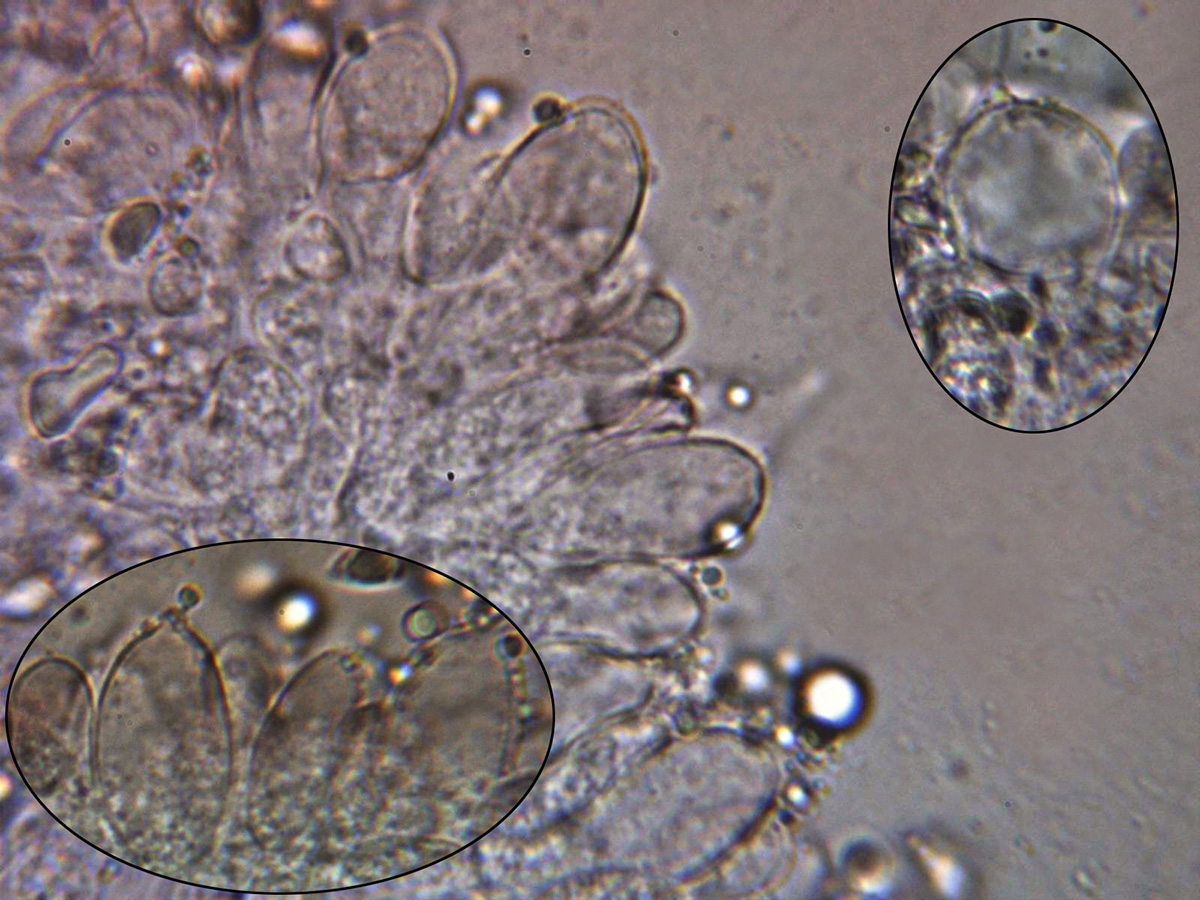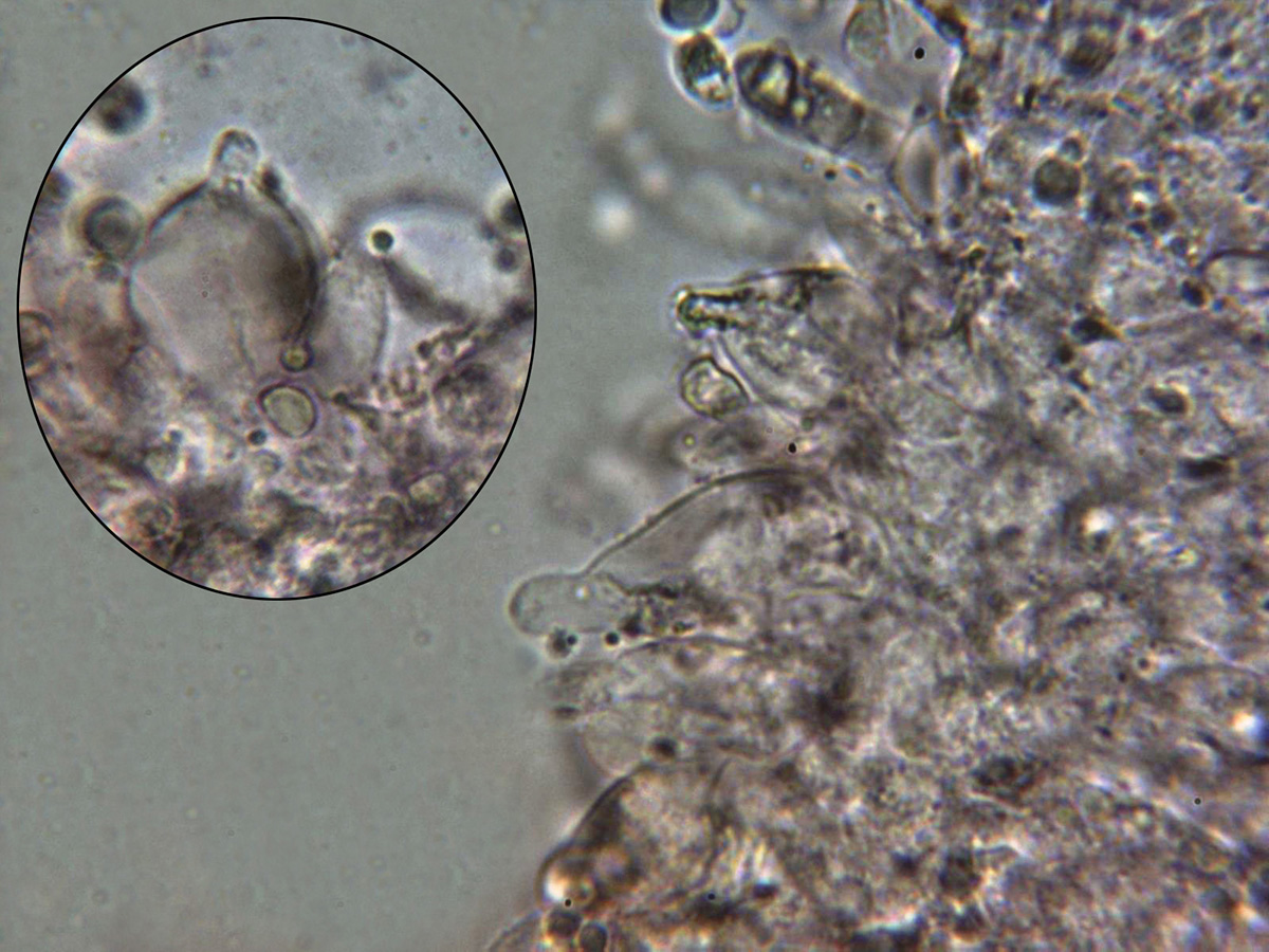 Una imágen de los pocos queilocistidios observados, al parecer globosos con pié y algunas excrecencias a modo de digitaciones.