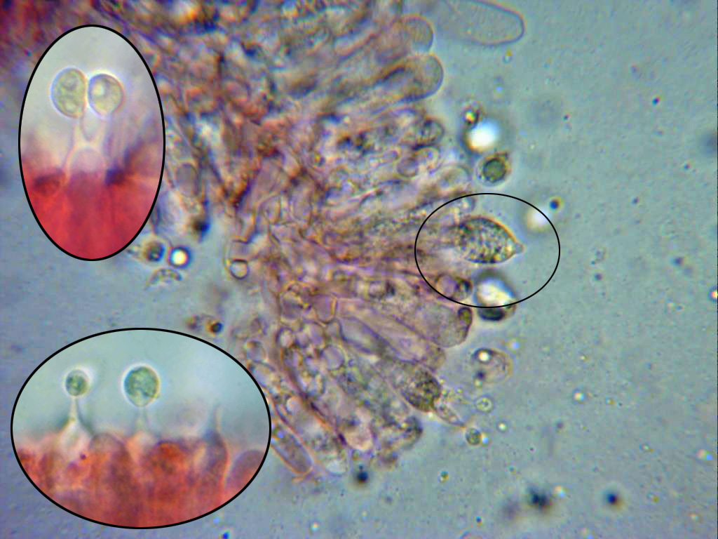 Medidas según las claves: 10-12 x 7-9 µm (basidios de 2 esporas) o 9-12 x 6-7 µm (basidios de 4 esporas)