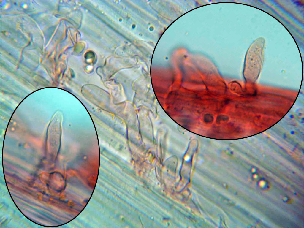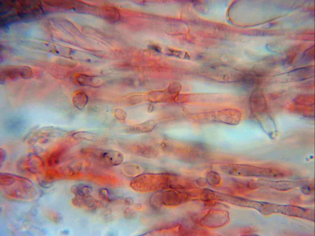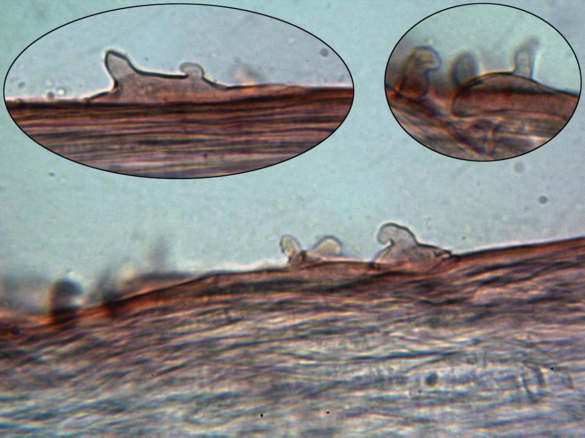 Hifas de la pileipellis a 1000 aumentos, fibuladas y con excrecencias a modo de digitaciones.