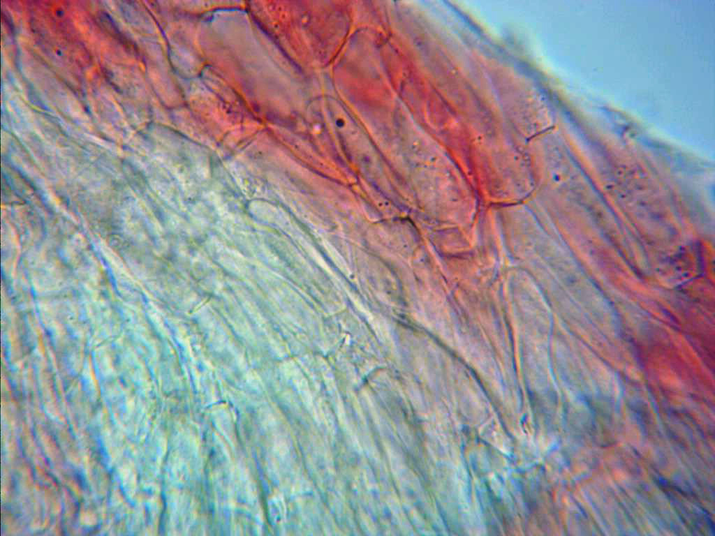Hifas de la pileipellis a 1000 aumentos, en solución de Rojo Congo diluido.