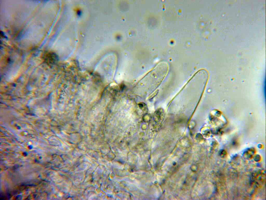 Otros queilocistidios, estos con un pezón o digitación corta en el ápice, al igual que los primeros muy abundantes.