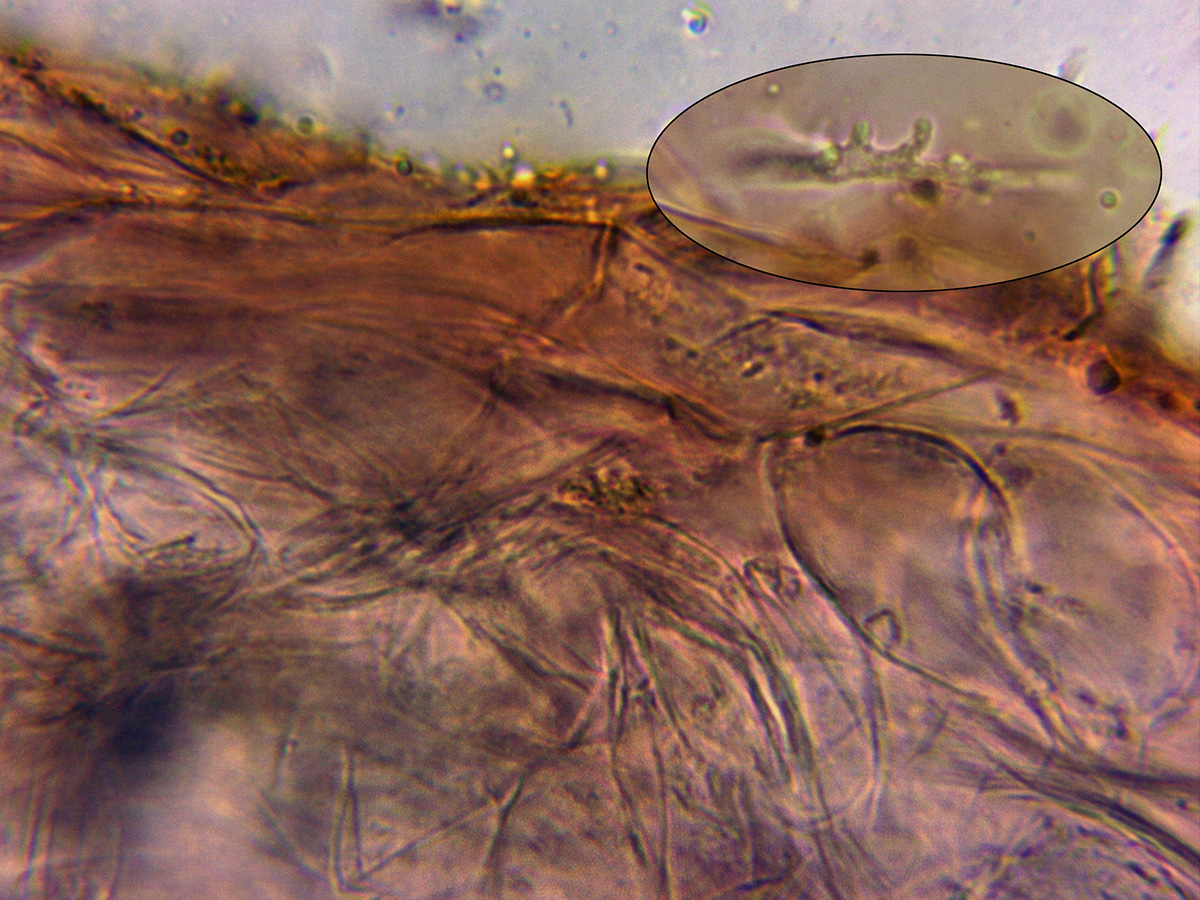 Pileipellis a 1000 aumentos, con abundantes digitaciones,
