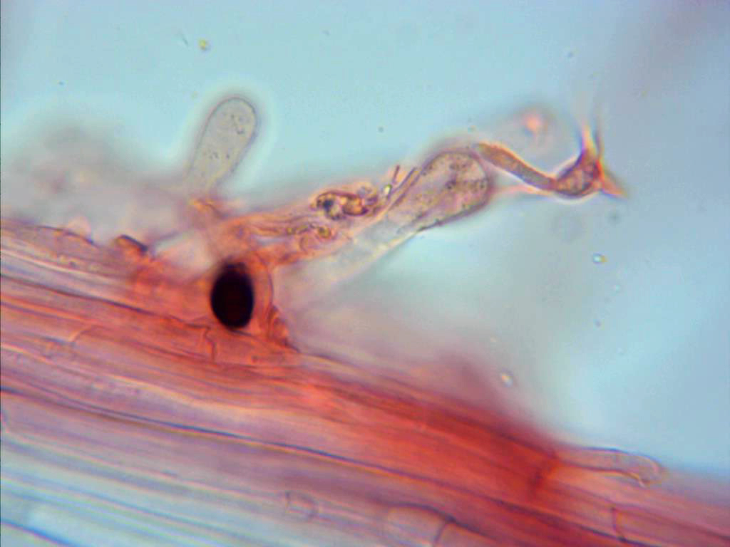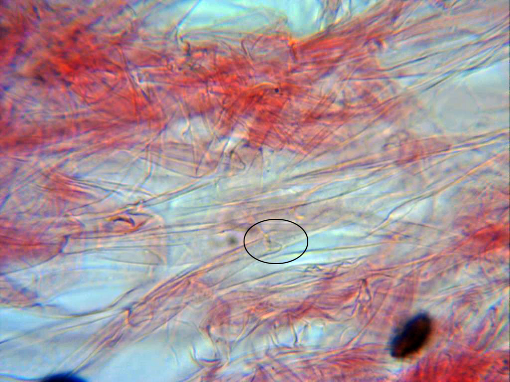 Hifas de la pileipellis a 1000 aumentos, donde (aunque escasas) se puede observar alguna que otra fíbula.