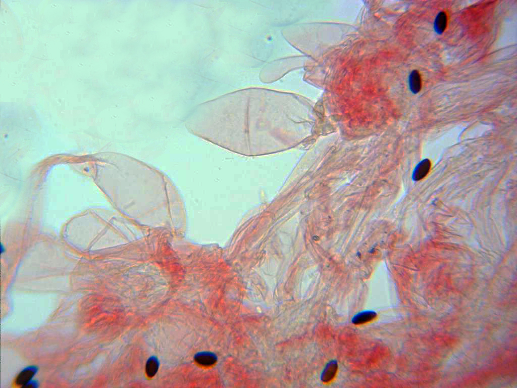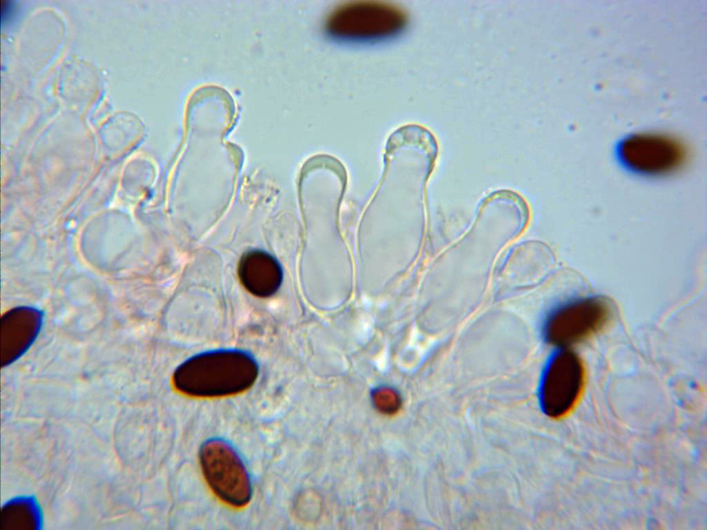 Arista laminar estéril, completamente cubierta de queilocistidios en forma de botella, ventrudos, algunos con cuello, terminando en forma redondeada, hialinos pero con un ligero contenido en el ápice de los mismos.