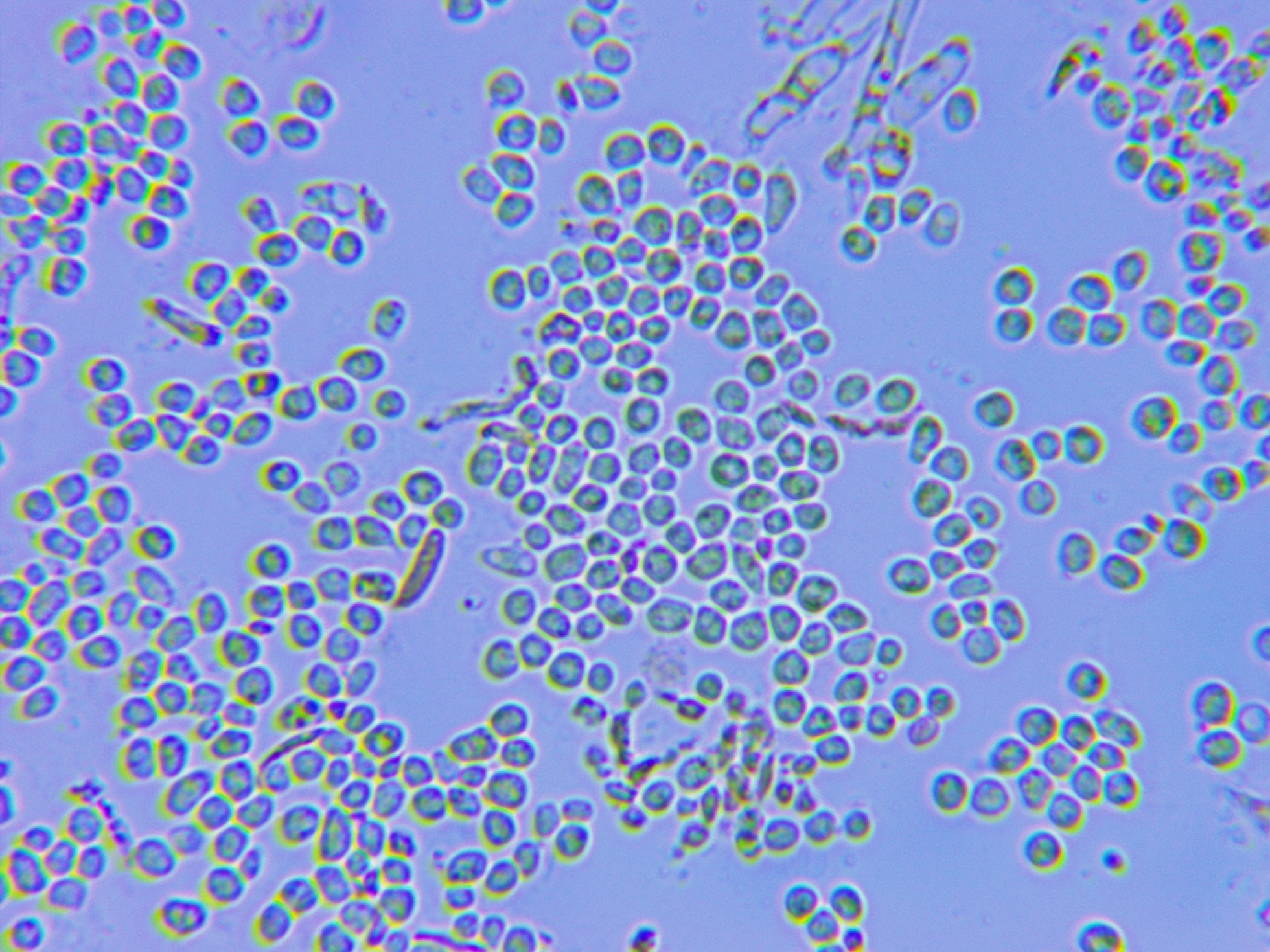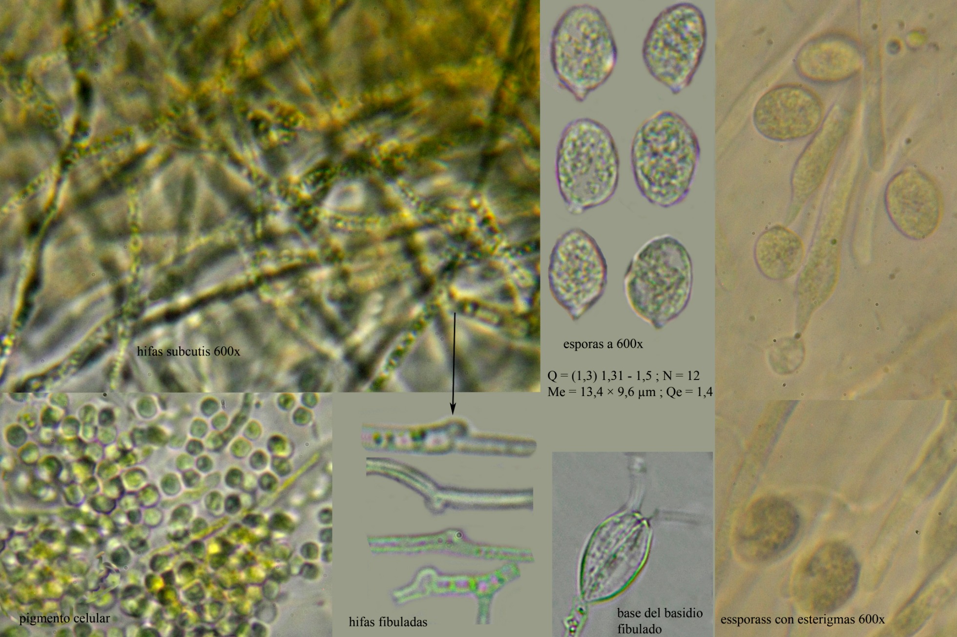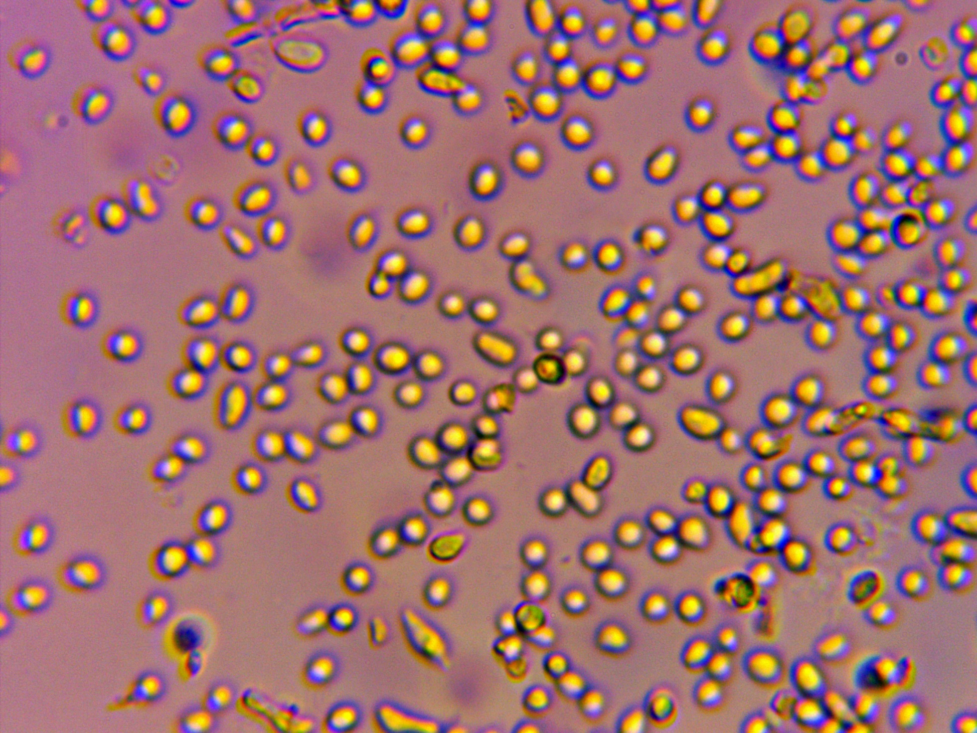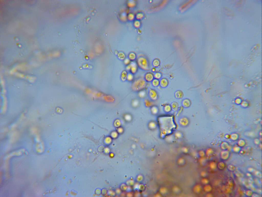 . Solo opinar que lo que nos describes como "pigmento celular", a mi modo de ver se trataría de conidios "esporas asexuales" de la misma. La Tremella mesenterica es una de las que ya he pasado varias veces por el micro y el color de la misma proviene de sus hifas pigmentadas de amarillo. Te dejo unas imágenes de conidios de Tremella mesenterica (estos mas presentes en los ejemplares jóvenes) con distintos reactivos, todos entre esféricos y ovoides y con unas medidas de entre 2 a 3 micras y una imágen de sus hifas pigmentadas y con fíbulas.