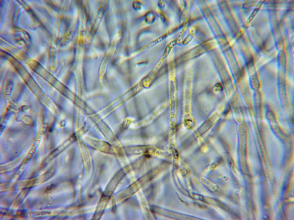 Hifas de Tremella mesenterica con pigmento amarillo.