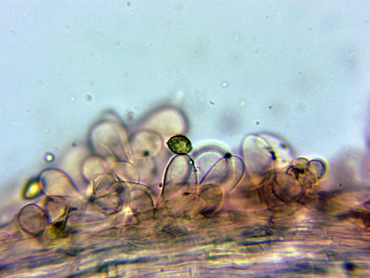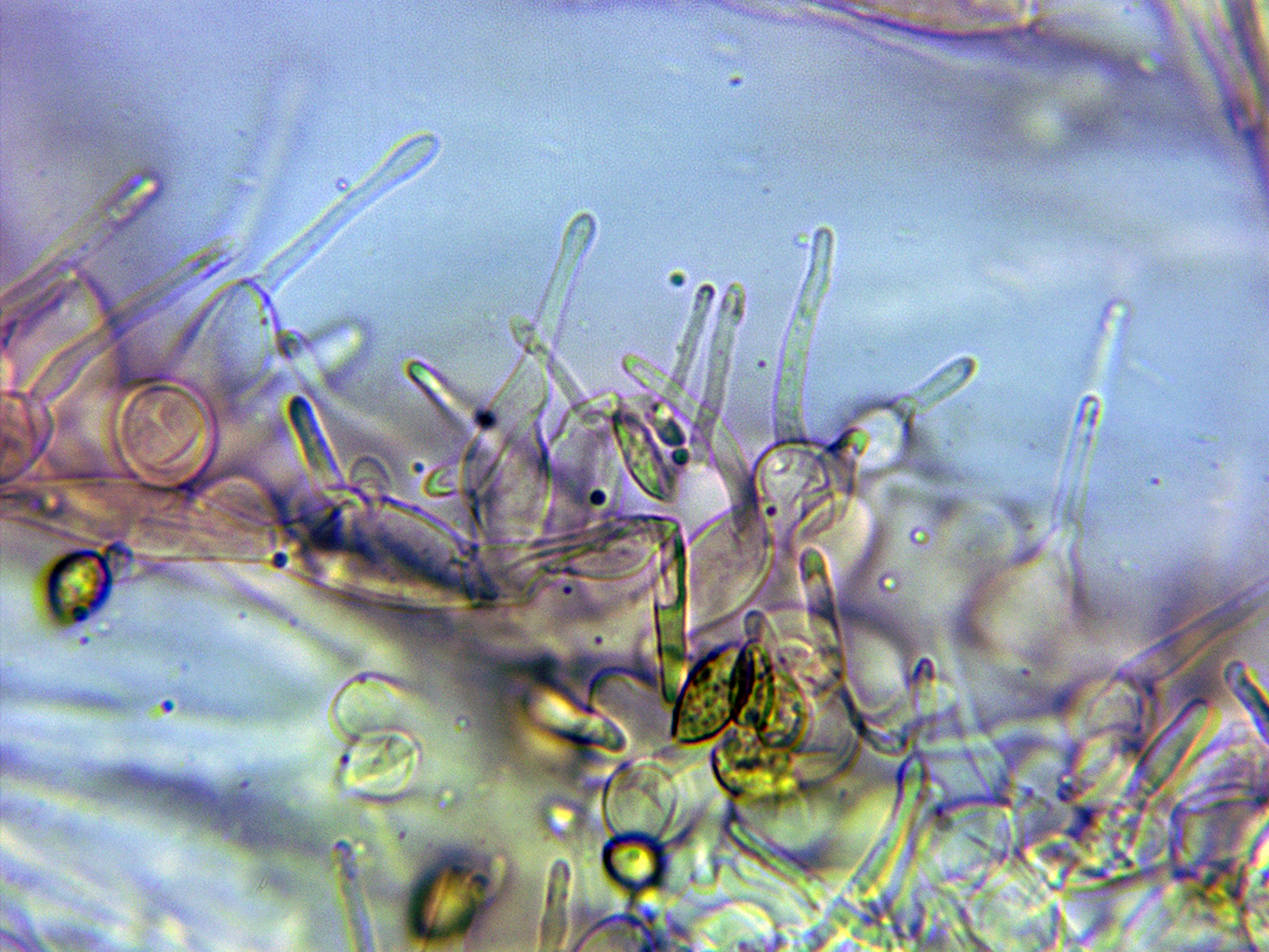 En mi estudio he podido comprobar la existencia de numerosos caulocistidios de distinta morfología, de estos caulocistidios no he podido encontrar ninguna información y tampoco ninguna imágen en la red, hasta el punto de dudar en este caso de mi estudio, estos caulocistidios si que se citan en la descripción de la misma en "Les Champignons de Suisse".