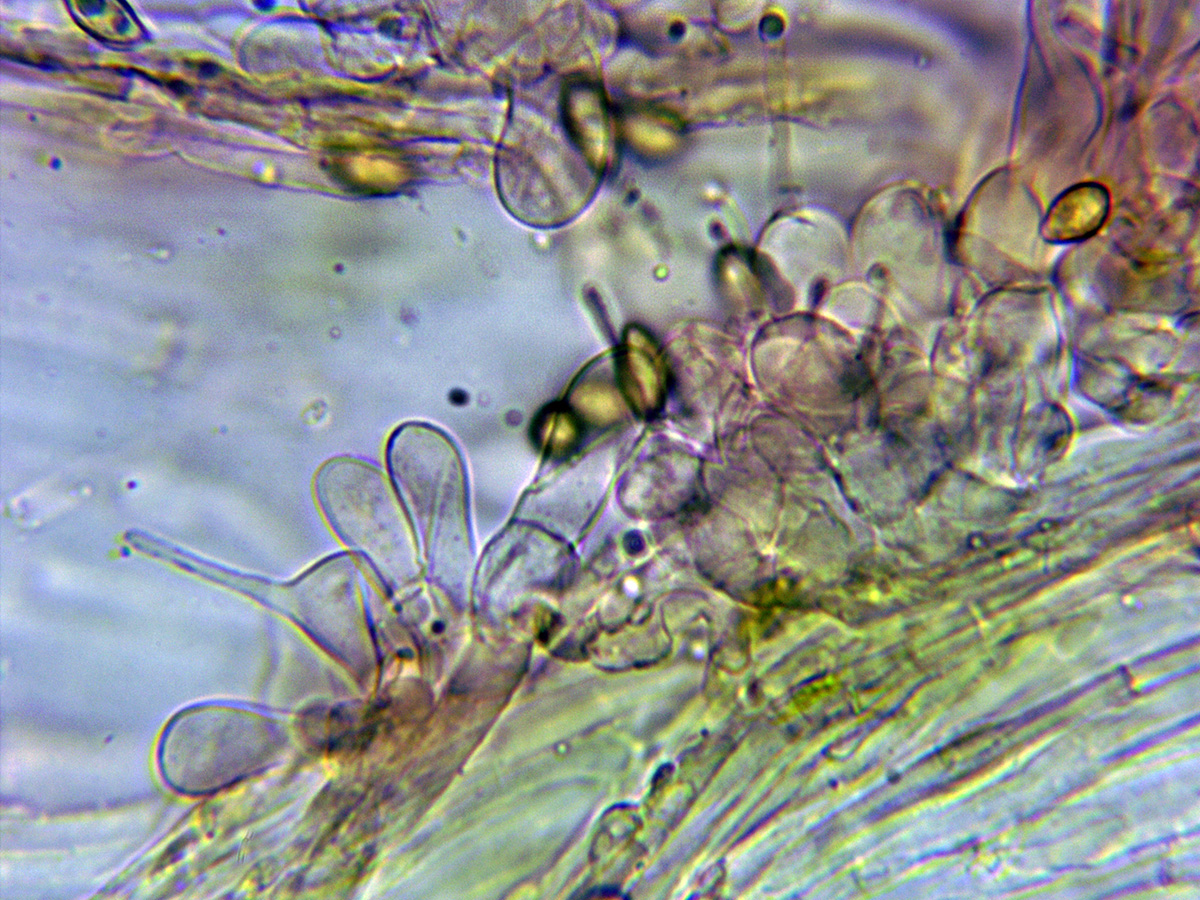 Dejo unas pocas imágenes de los muchos caulocistidios observados en mi estudio localizados en la parte alta del pié, algunos muy parecidos a los queilocistidios, otros cilíndricos, piriformes, etc, etc,.