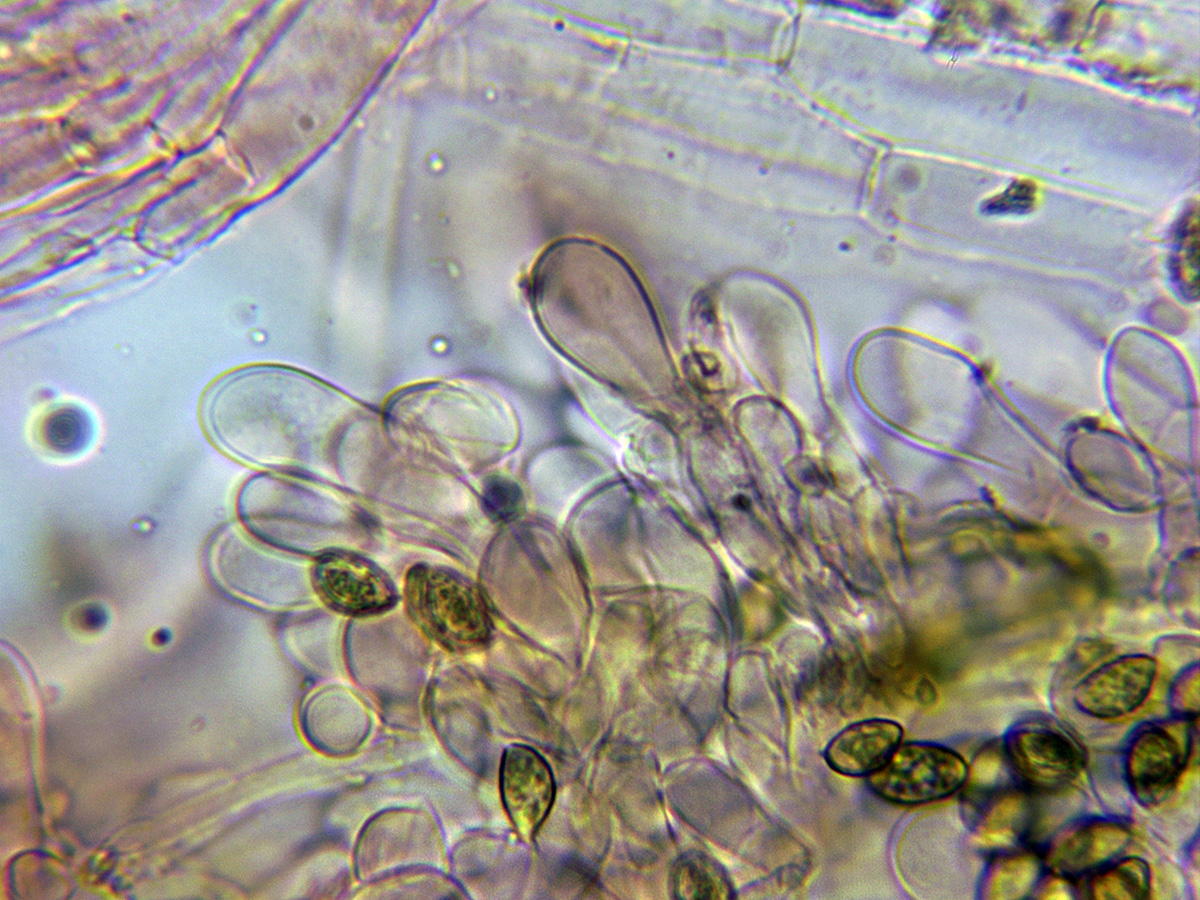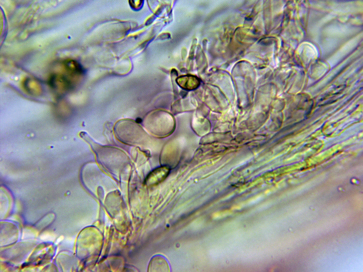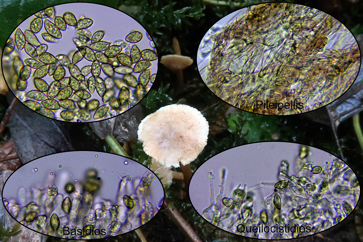 Con queilocistidios de base ancha y terminando en un largo cuello estrecho, basidios tetrasporicos y esporas en mi caso de (7,9) 8,3-10,4 (11,9) X (4,6) 5,1-5,8 (6,1) micras.